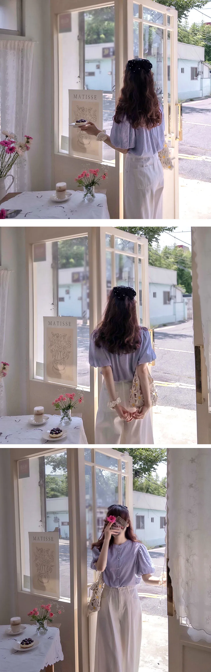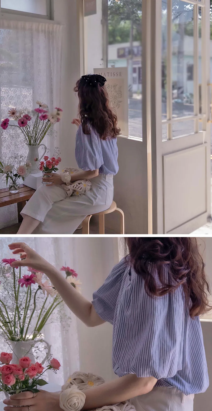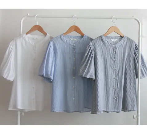 【迷你小孔設計,季節限定】 【袖子微微蓬鬆,泡泡袖設計非常漂亮】 【條紋和純色條紋圖案,充滿夏日氣息】 【作為優雅清涼的上衣】