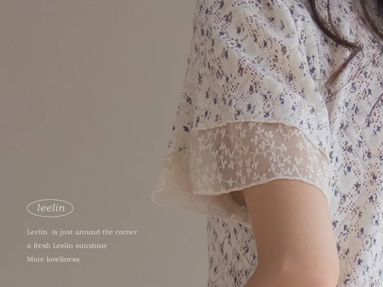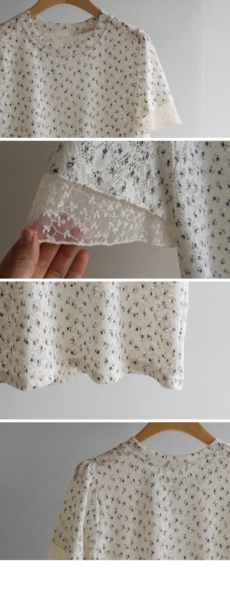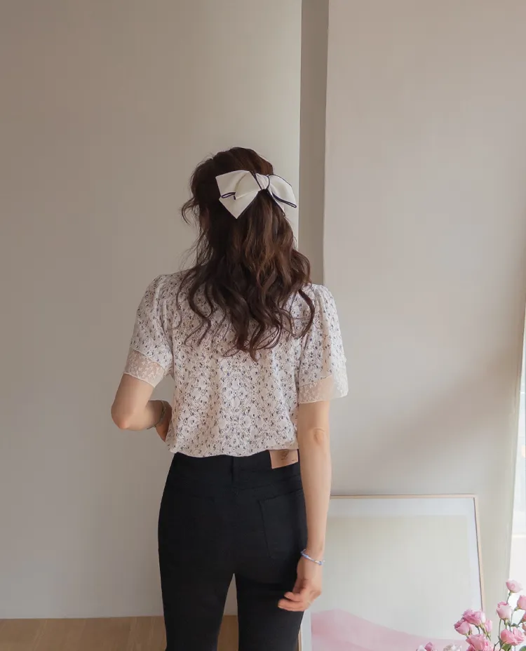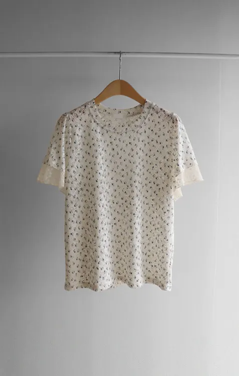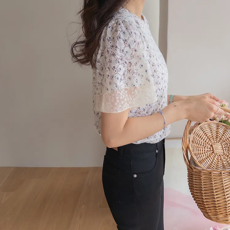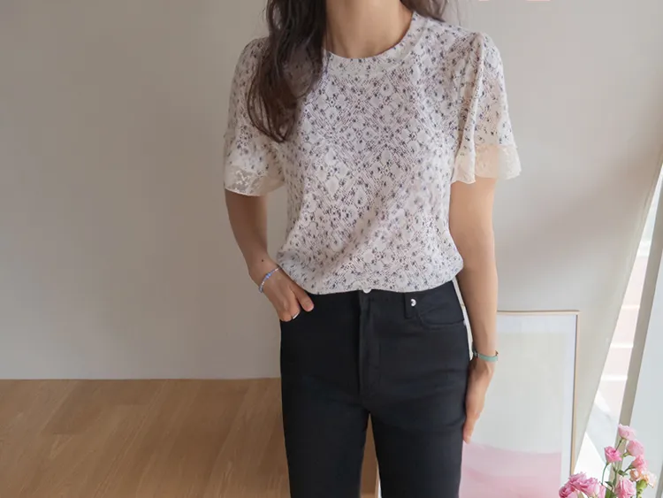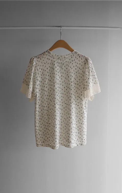 復古小花鏤空孔洞點綴袖末蕾絲上衣