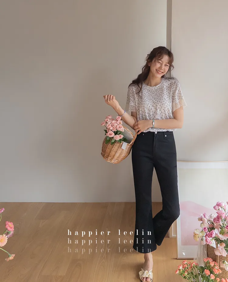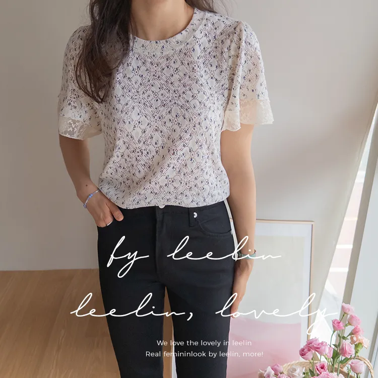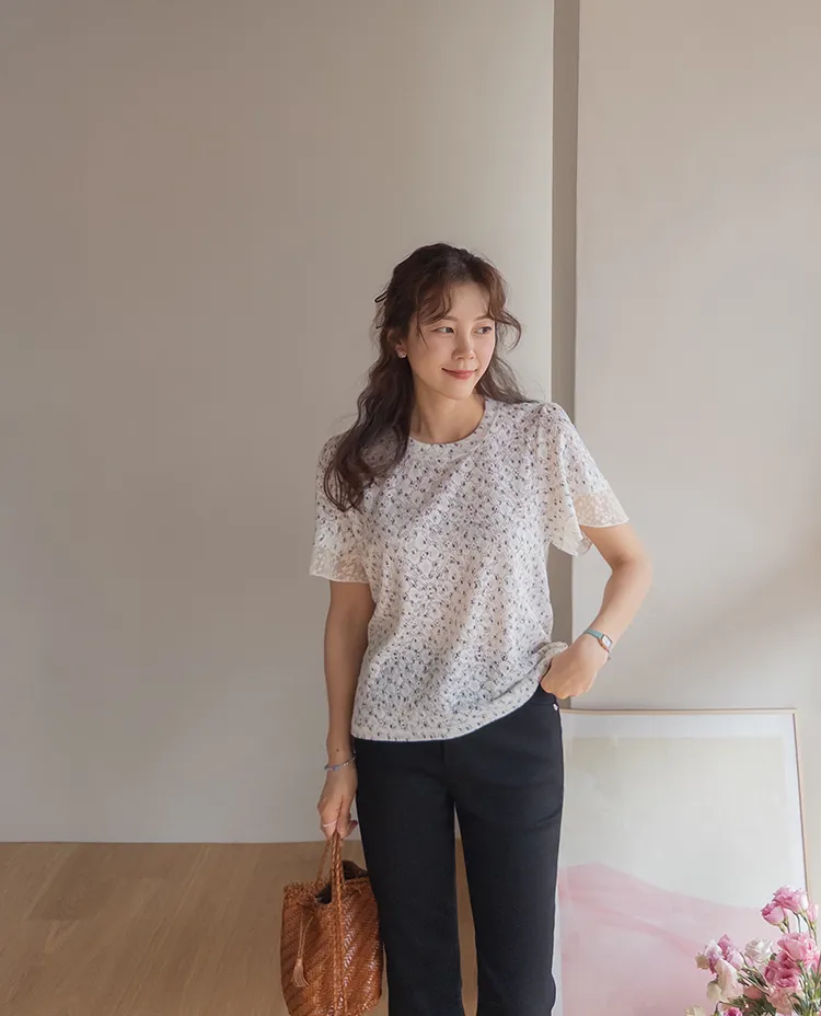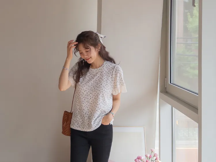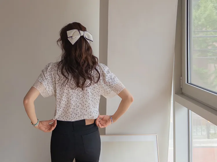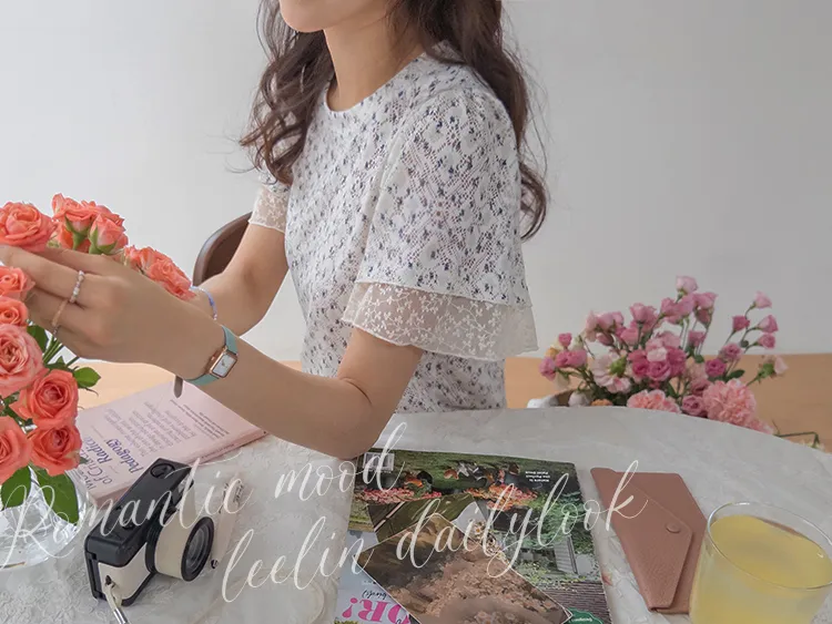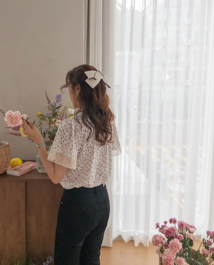 復古小花鏤空孔洞點綴袖末蕾絲上衣