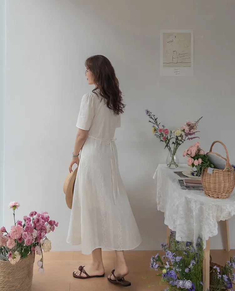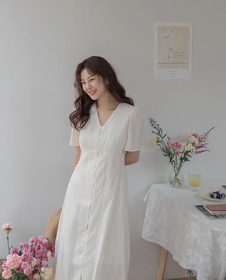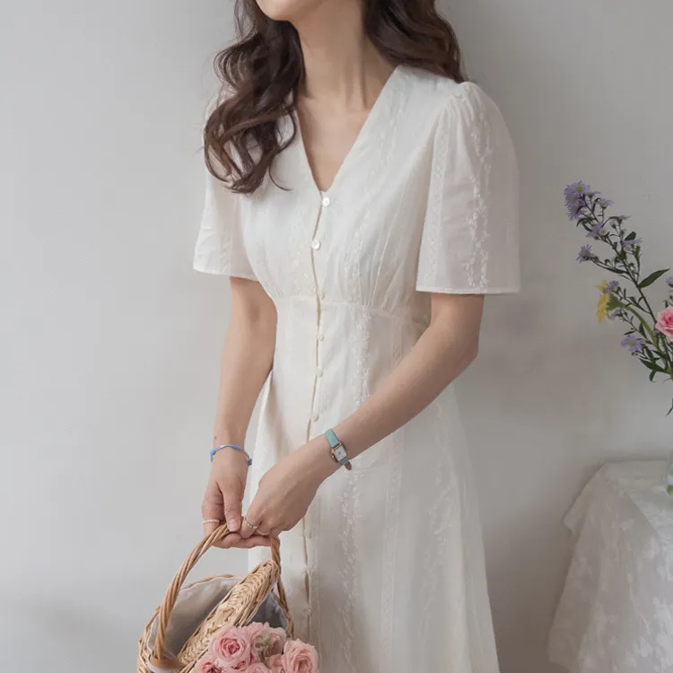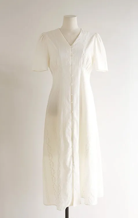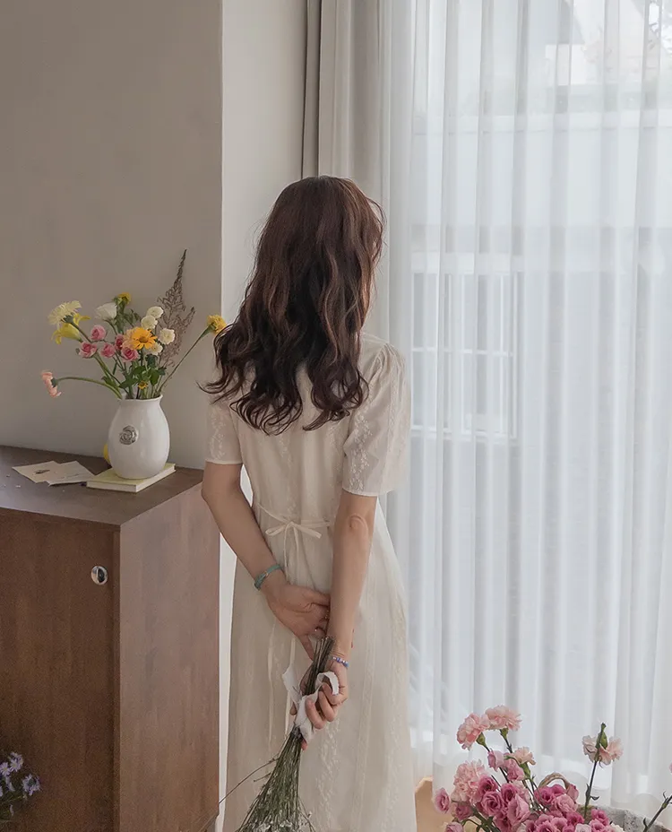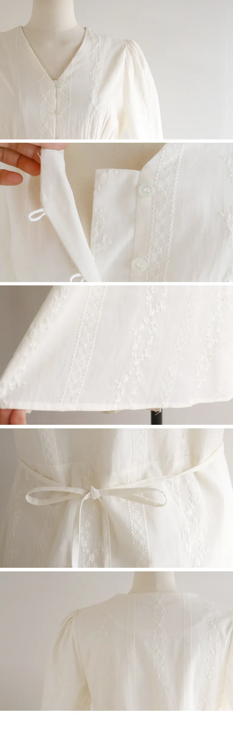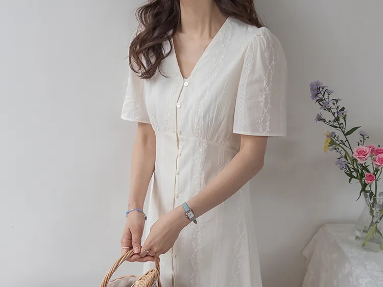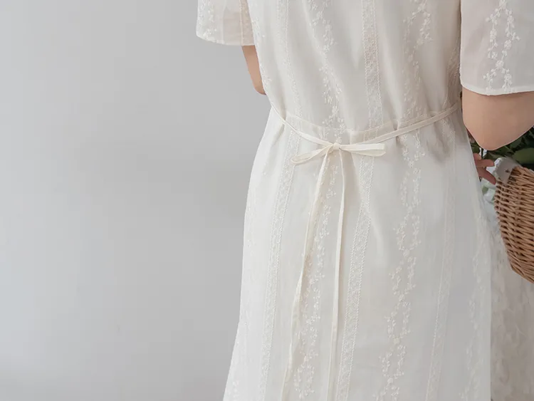 浪漫情調花朵刺繡排扣後綁帶連身裙 現貨奶油色