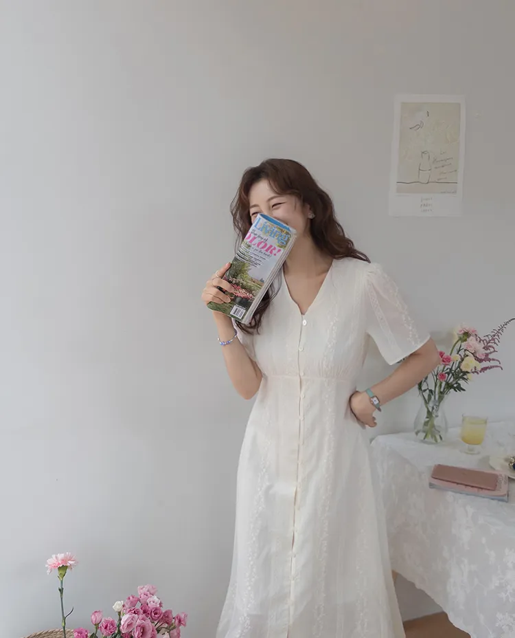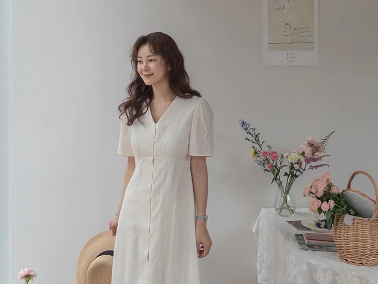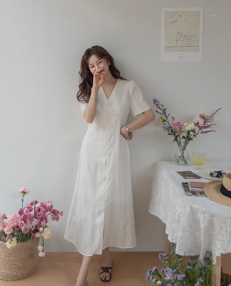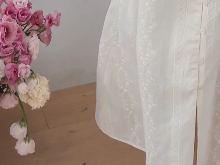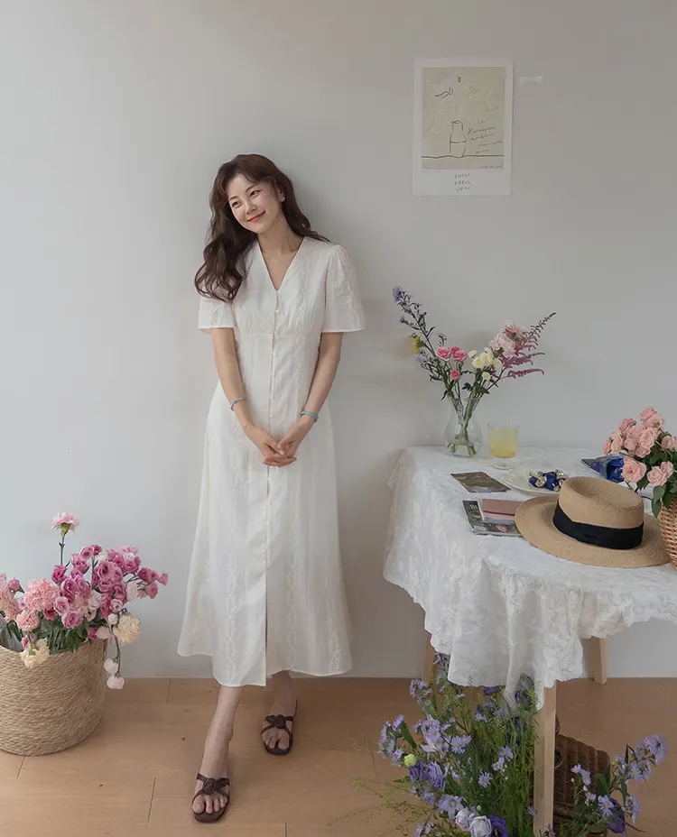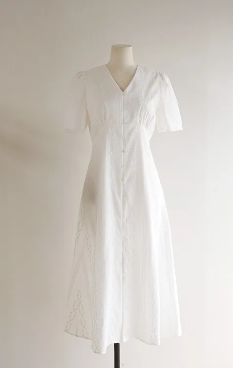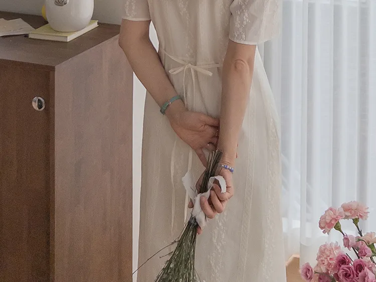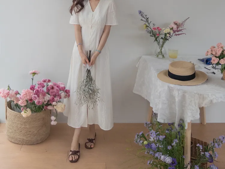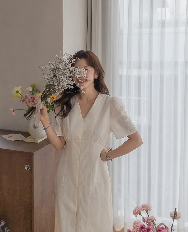 浪漫情調花朵刺繡排扣後綁帶連身裙 現貨奶油色