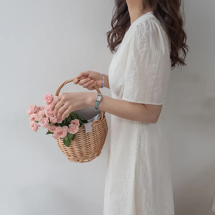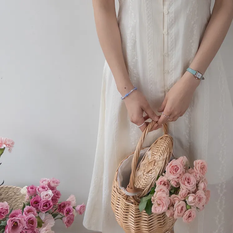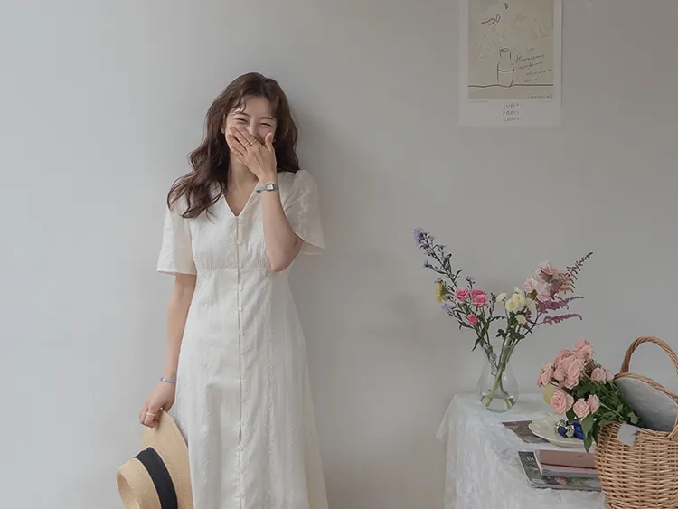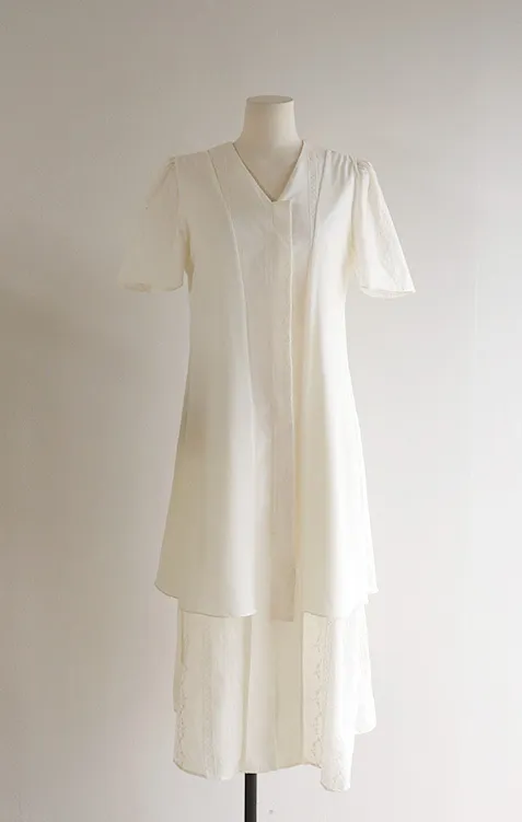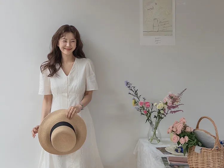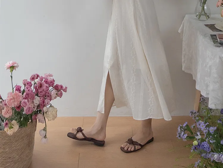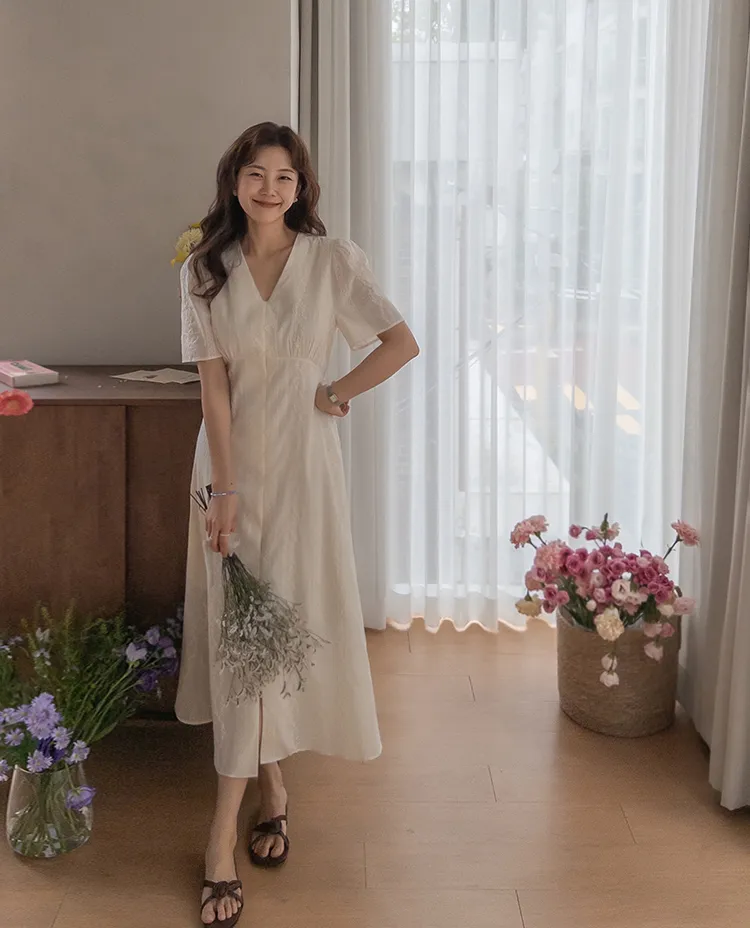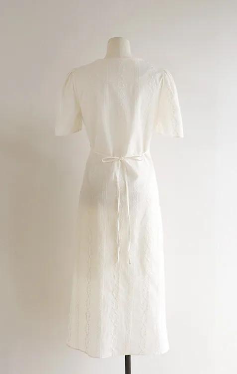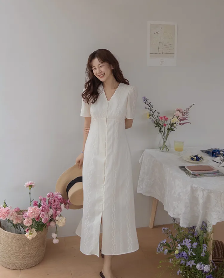 浪漫情調花朵刺繡排扣後綁帶連身裙 現貨奶油色