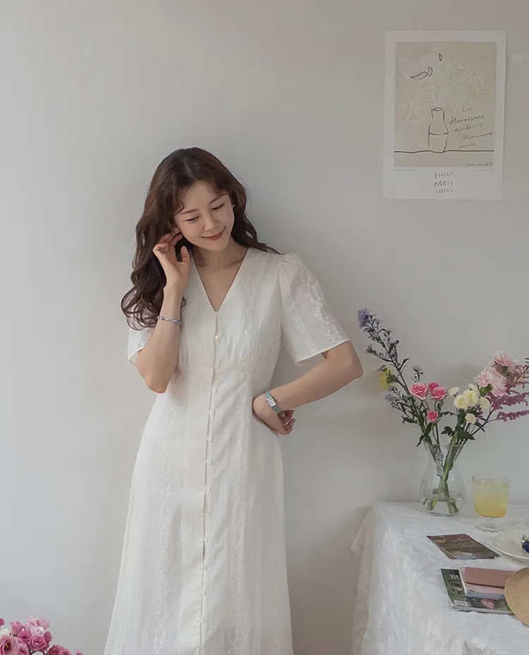 【充滿浪漫情調的刺繡連身裙♥】【純真~純真的情感】【泡泡袖與腰帶設計,完美貼合身材~! 】【V領設計,盡顯女人味~】