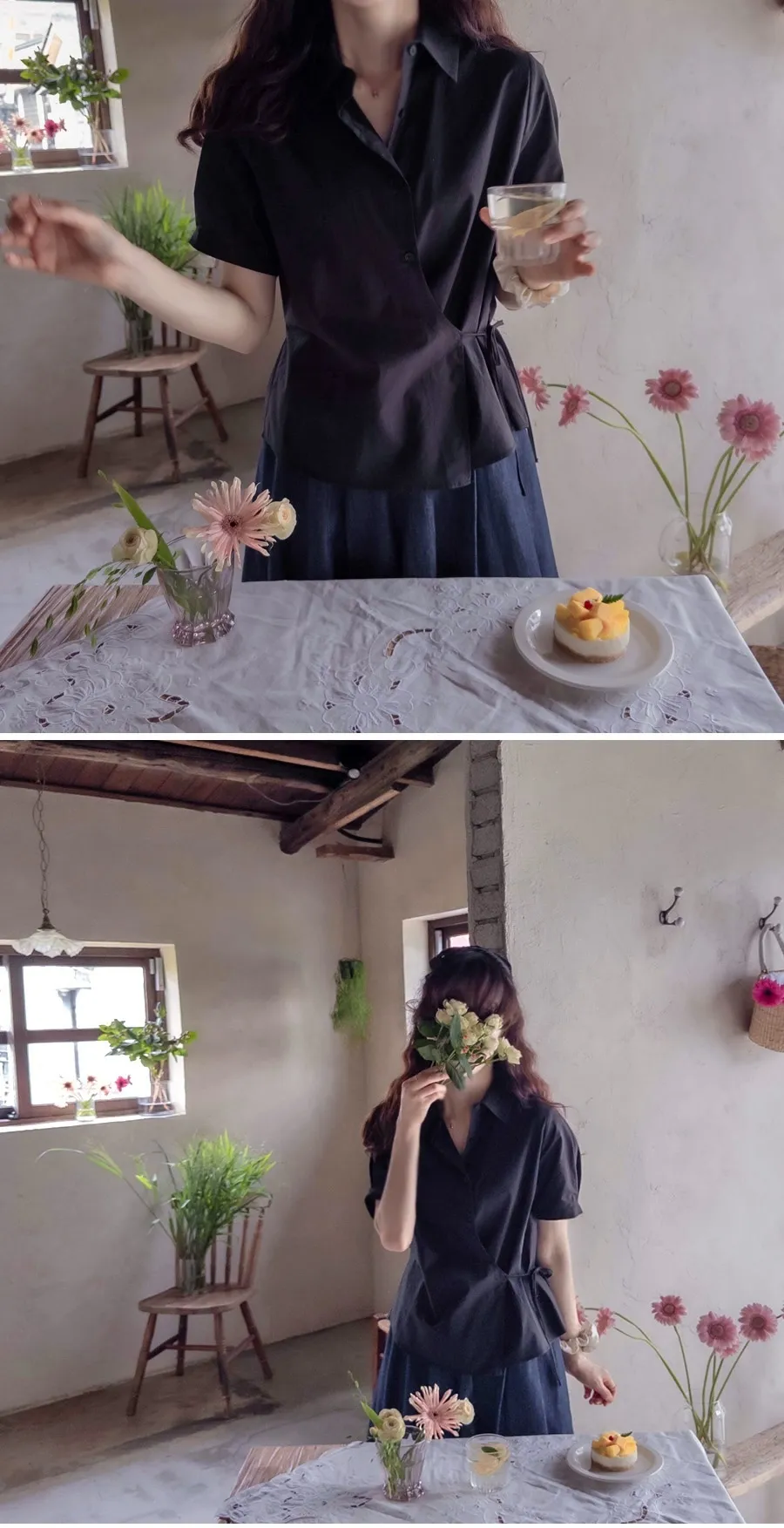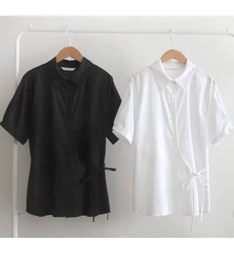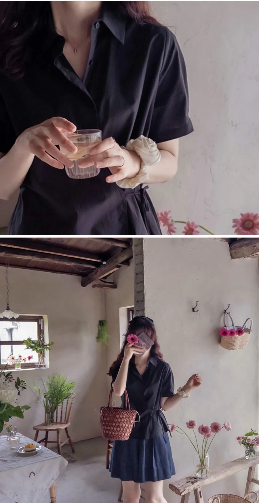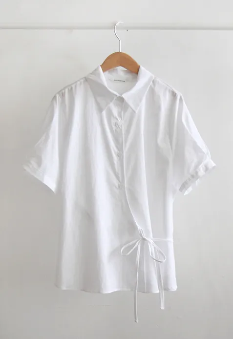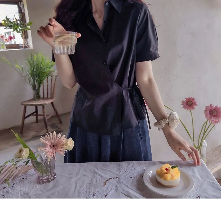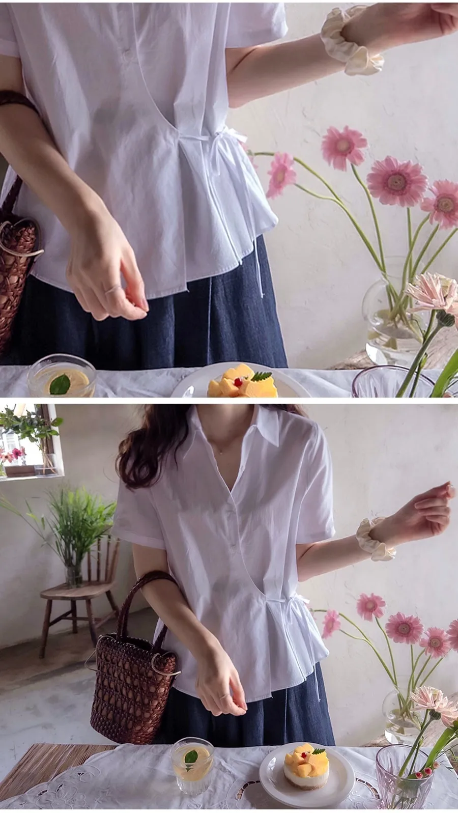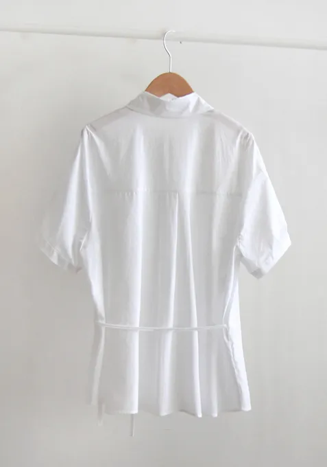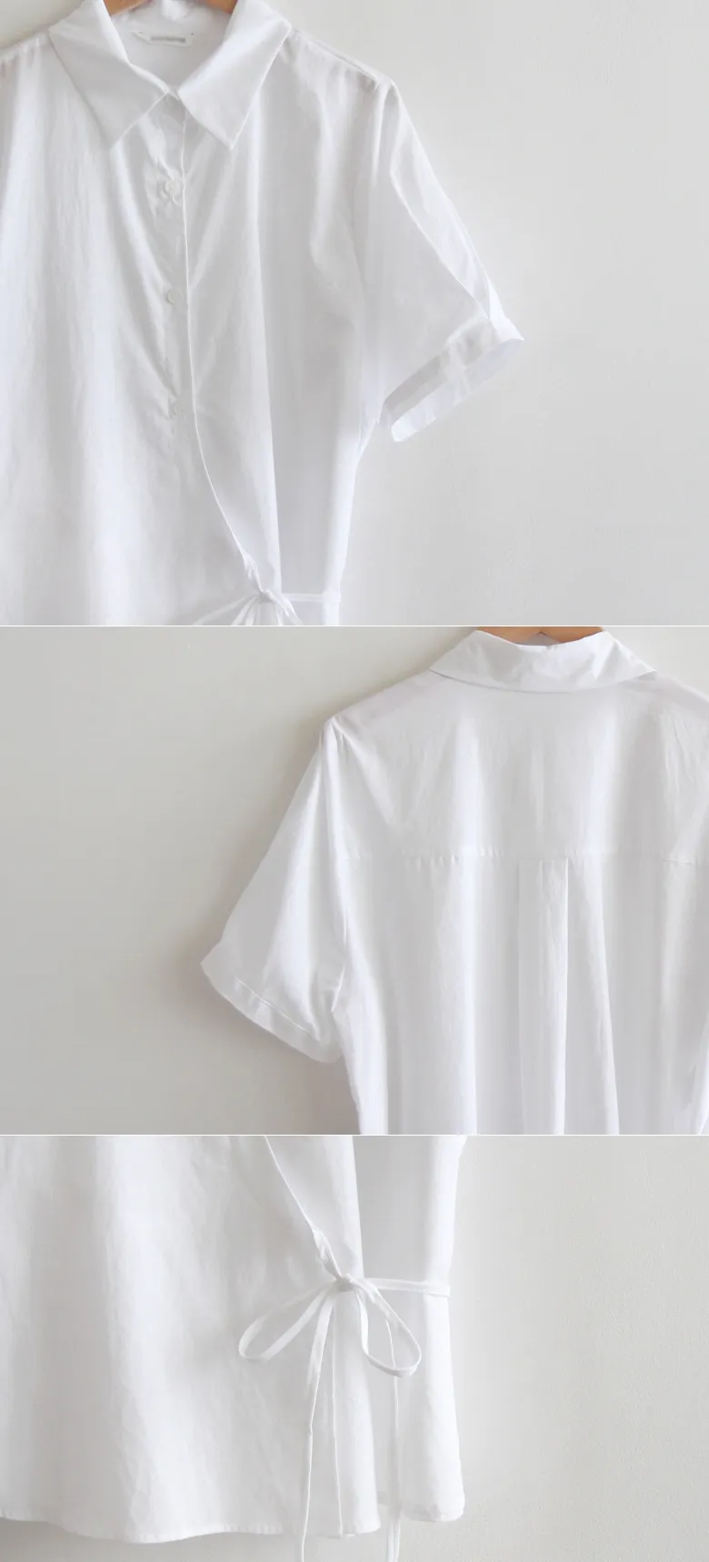 【清涼柔軟的棉質襯衫】 【扣好紐帶後繫上綁帶蝴蝶結,修身時尚】 【夏季清涼優雅的完美襯衫】 【乾淨俐落的領口和漂亮的袖口設計,推薦作為夏季穿搭襯衫】