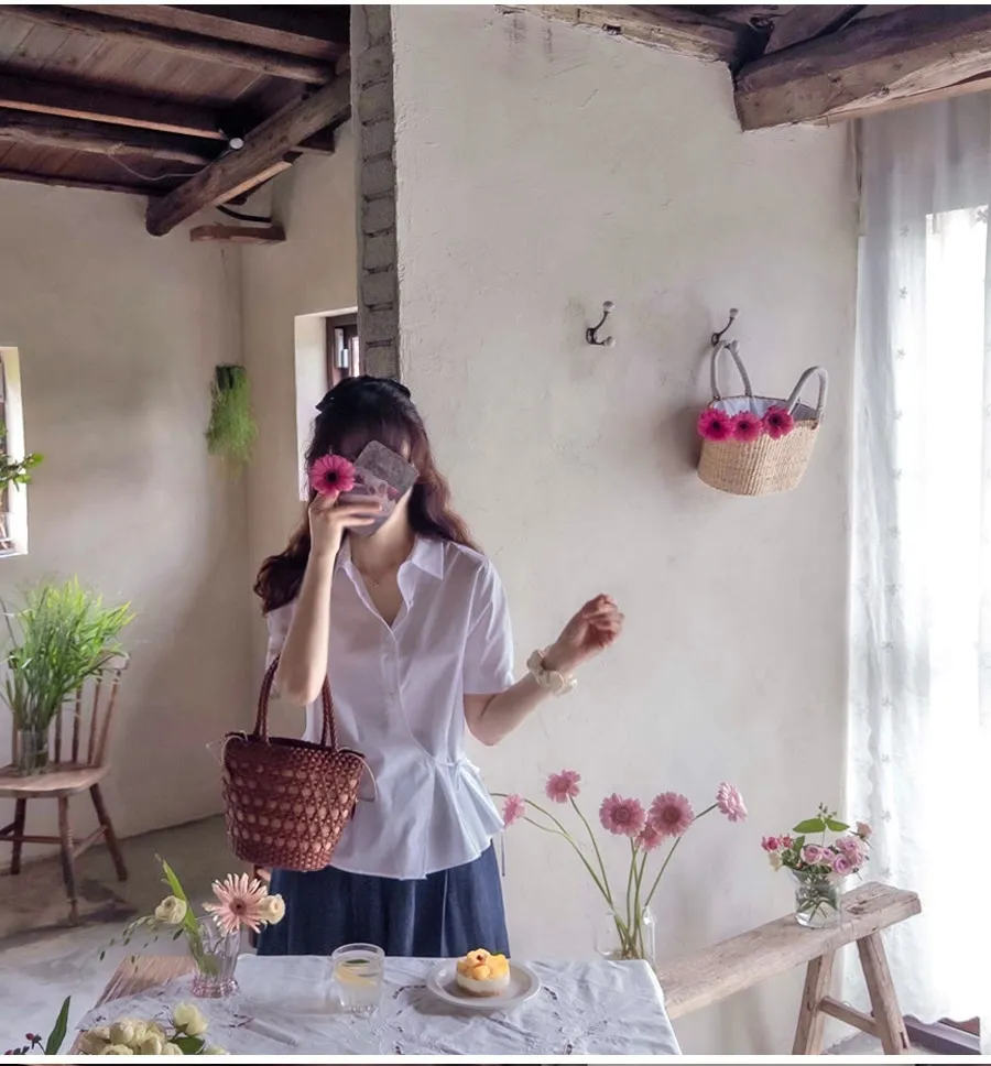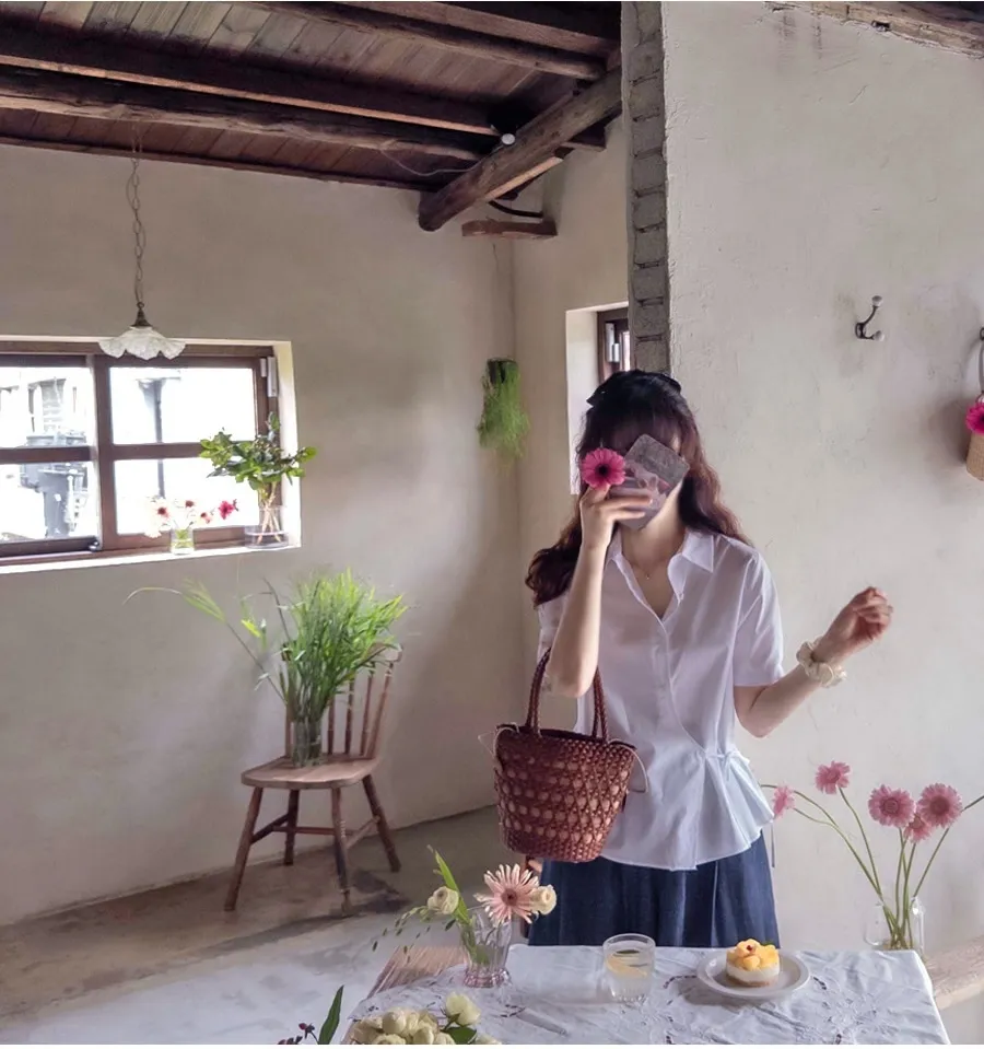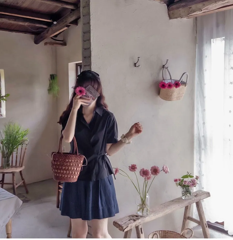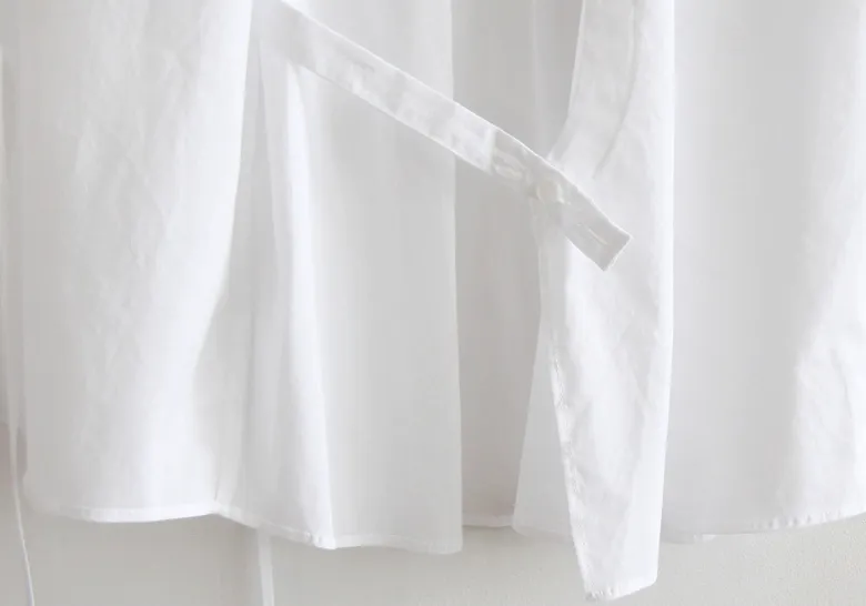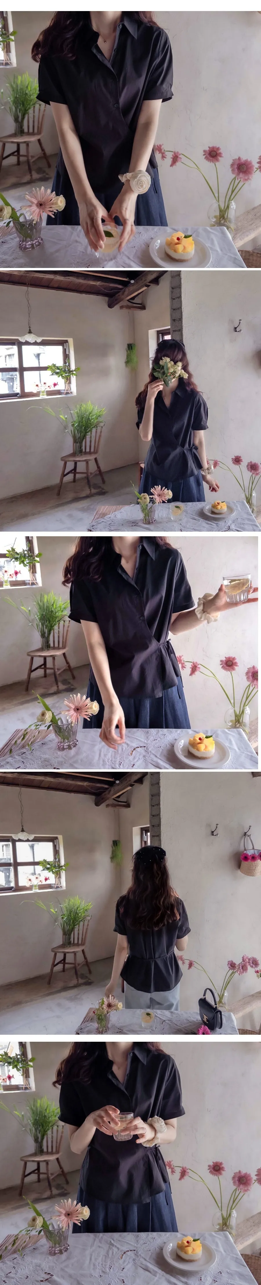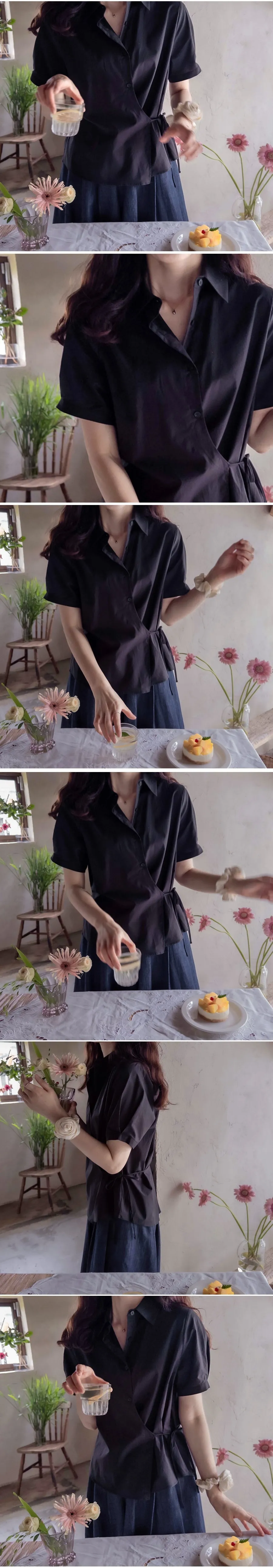 【清涼柔軟的棉質襯衫】 【扣好紐帶後繫上綁帶蝴蝶結,修身時尚】 【夏季清涼優雅的完美襯衫】 【乾淨俐落的領口和漂亮的袖口設計,推薦作為夏季穿搭襯衫】