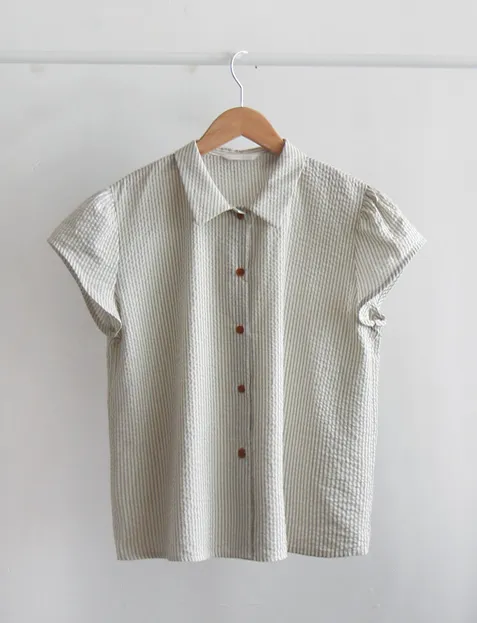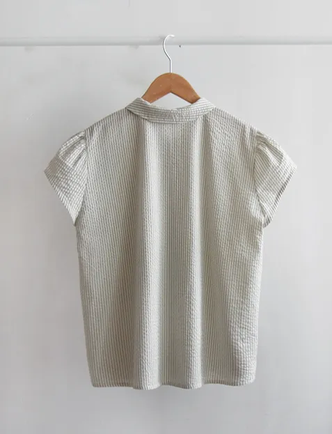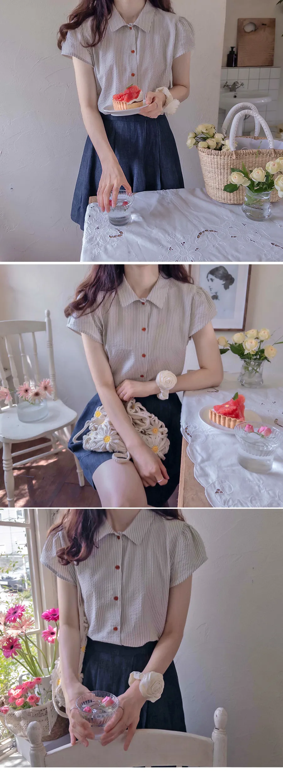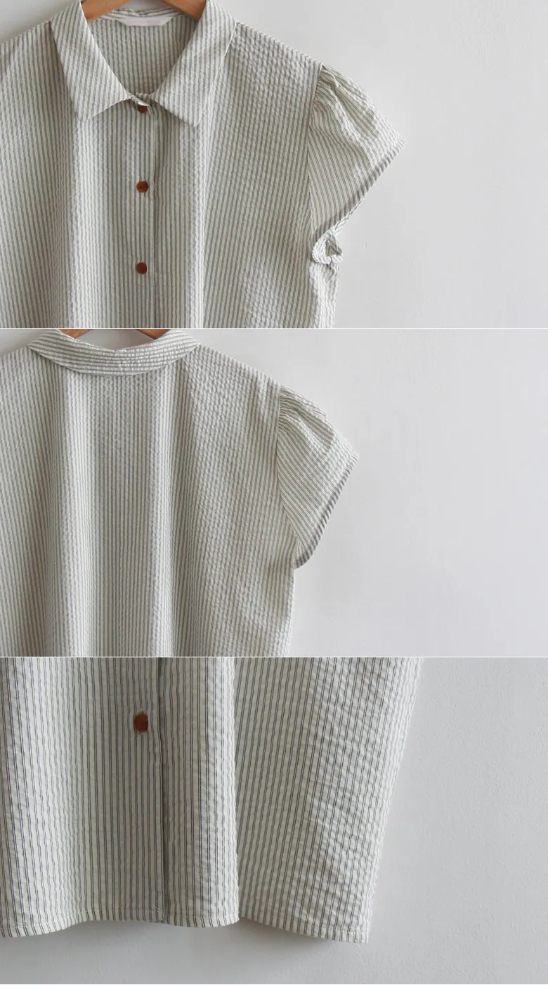 可愛肩線褶皺條紋泡泡紗排扣上衣