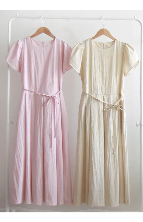 柔和色彩優雅袖線剪裁附腰帶連身裙