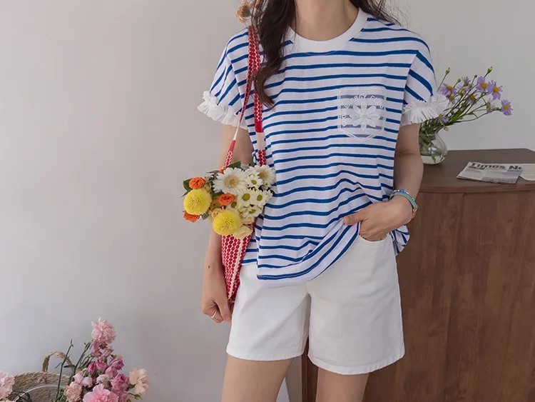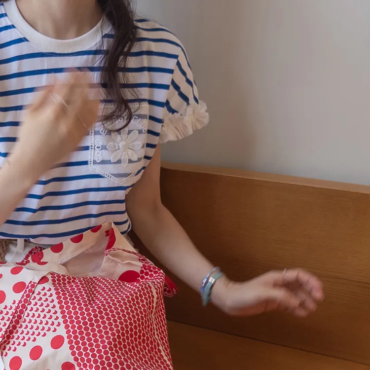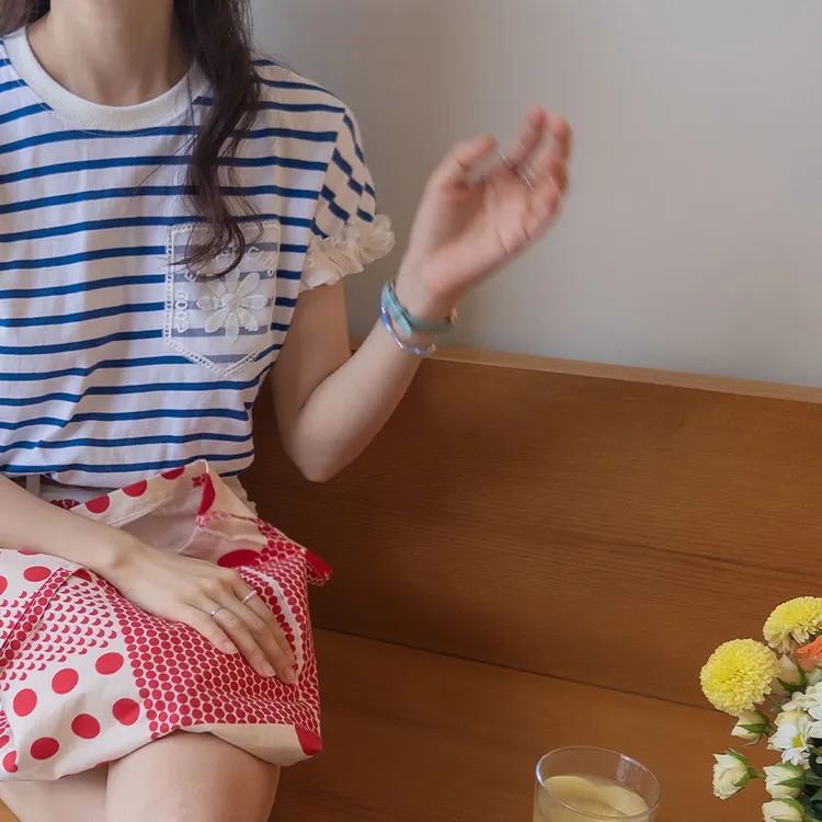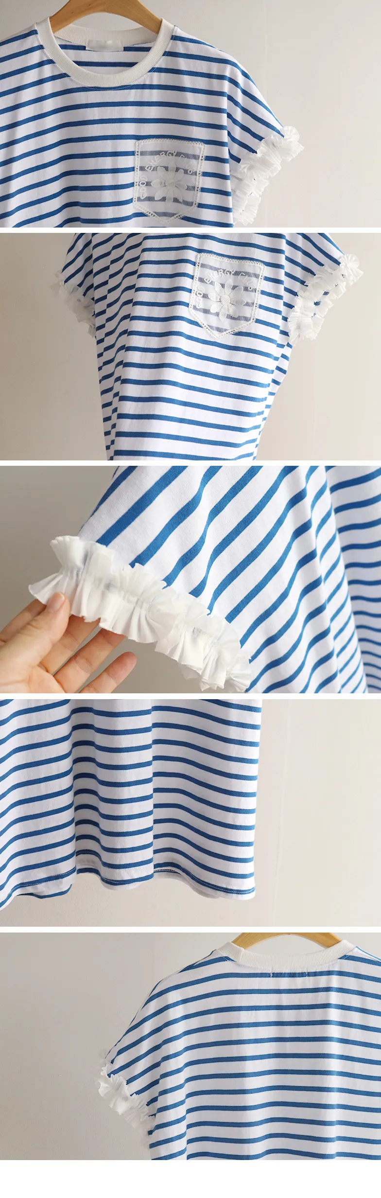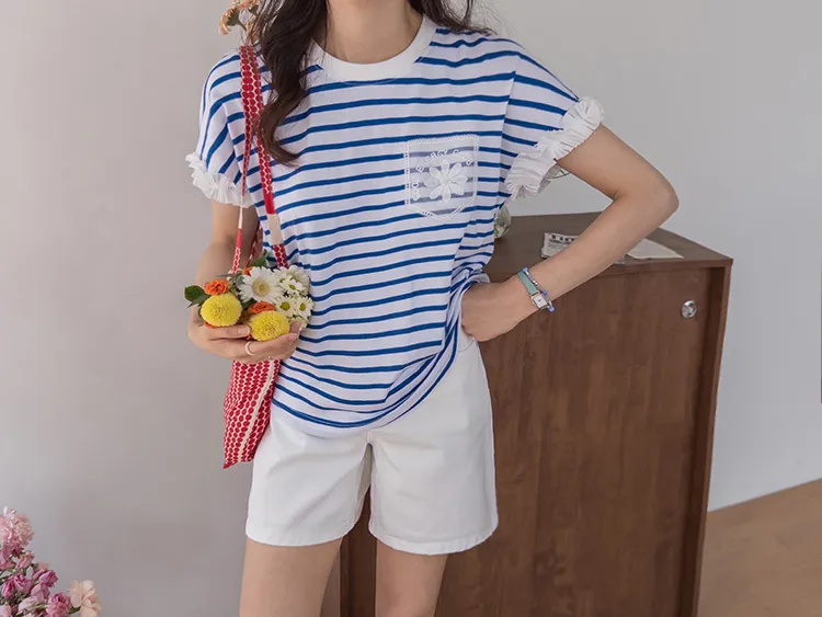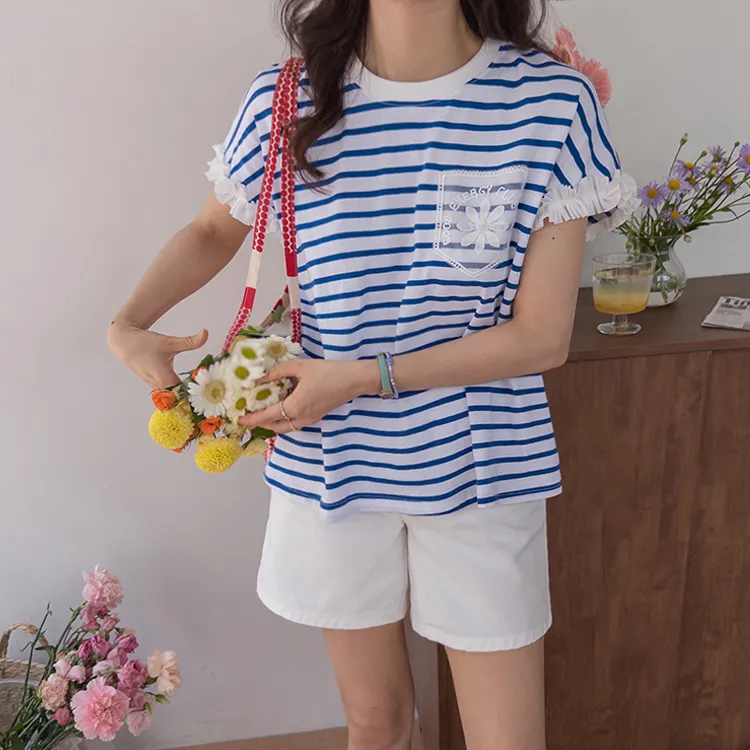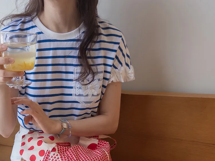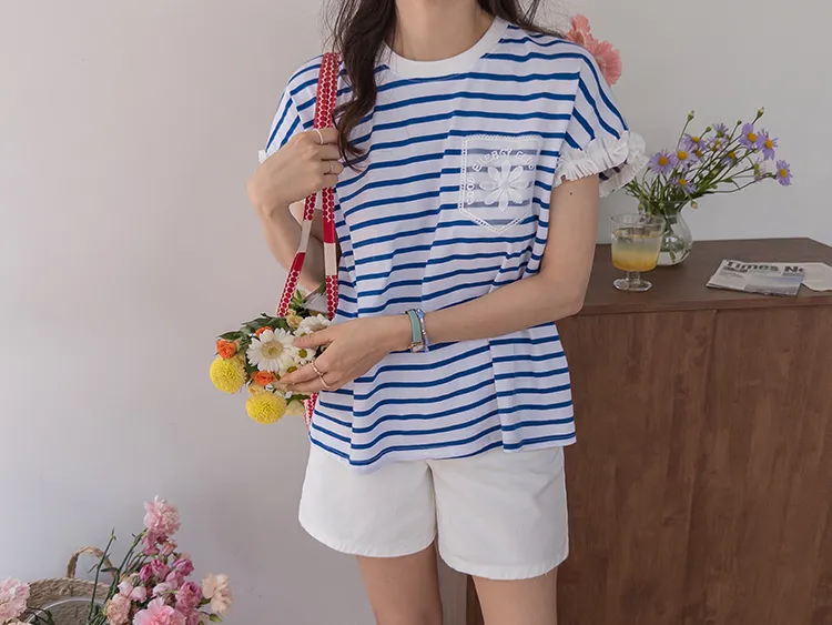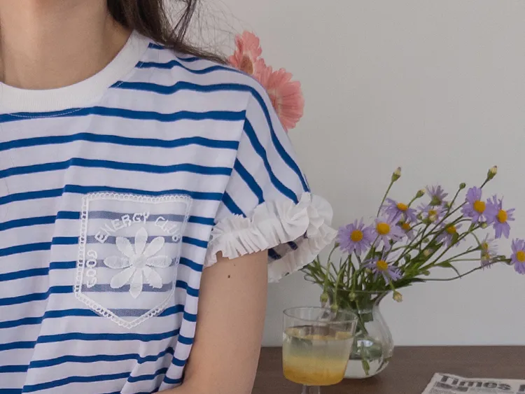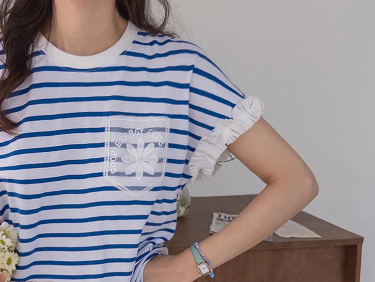 清新浪漫情調胸前蕾絲花朵刺繡點綴摺邊袖口條紋上衣