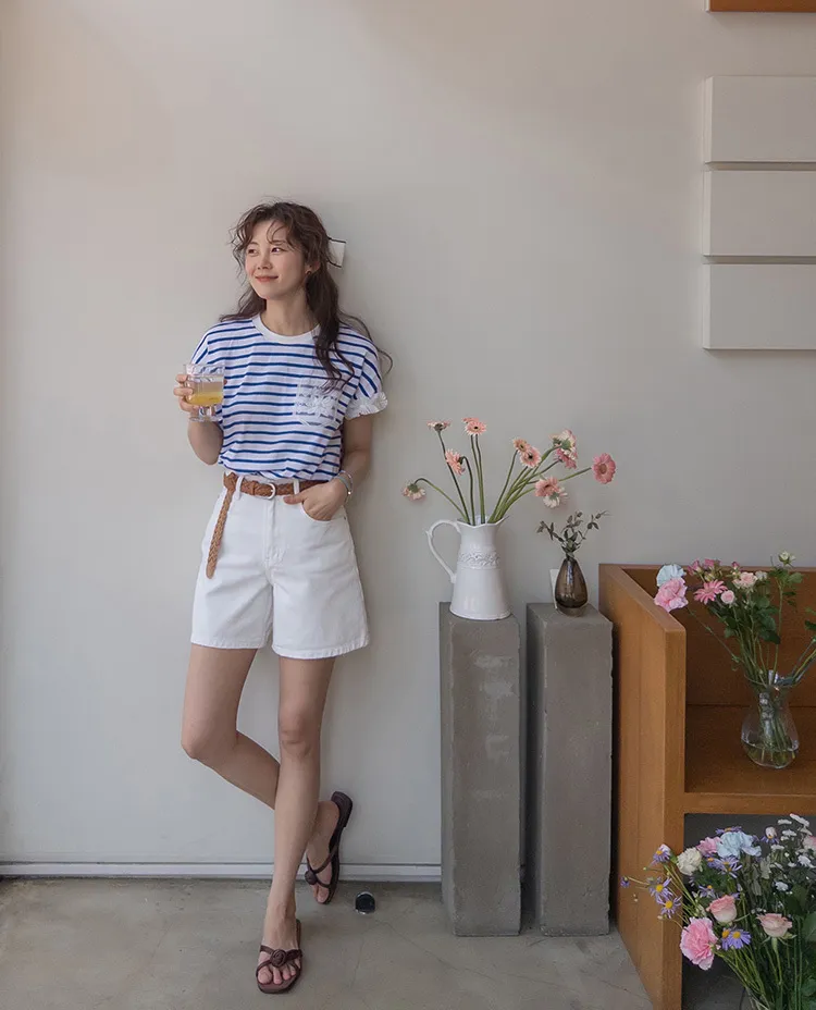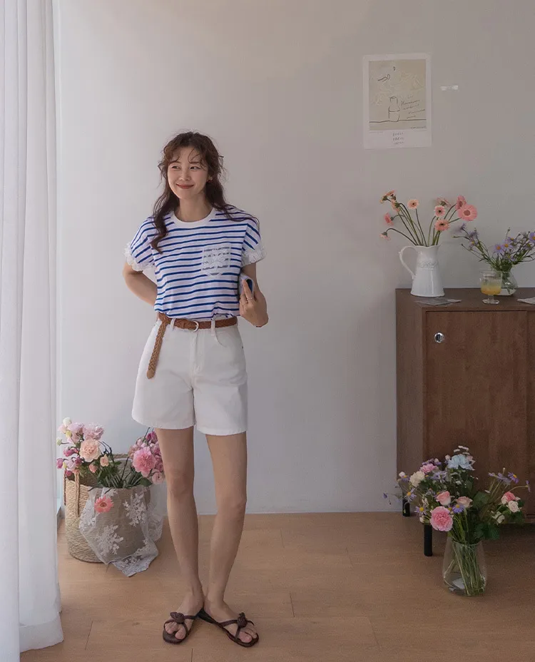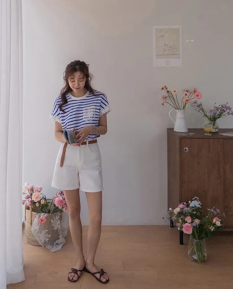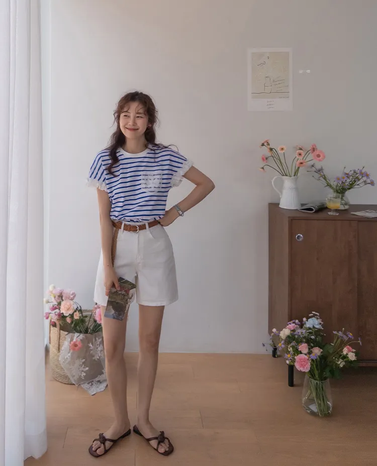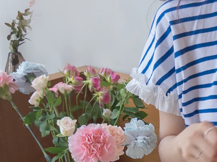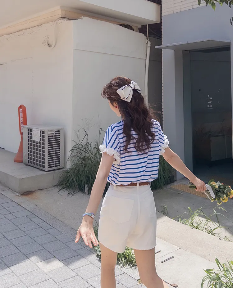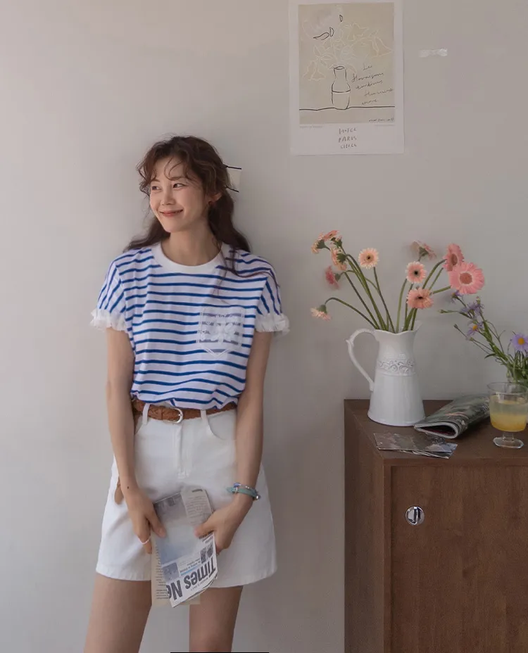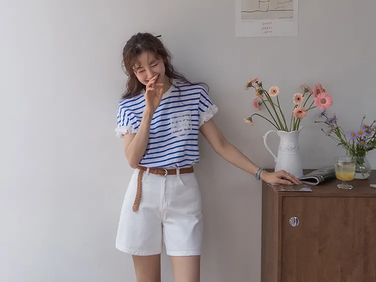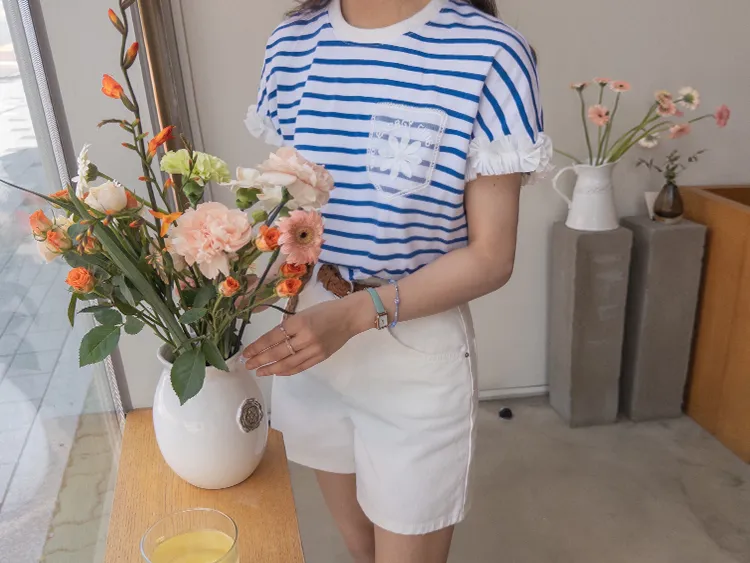 清新浪漫情調胸前蕾絲花朵刺繡點綴摺邊袖口條紋上衣
