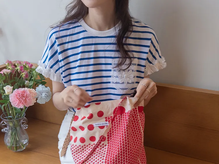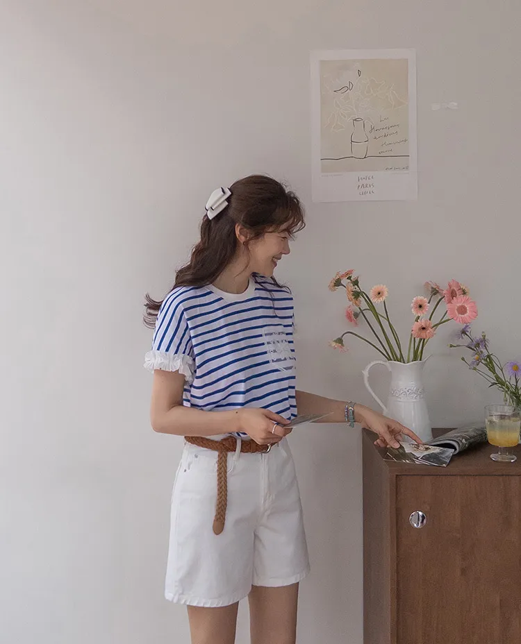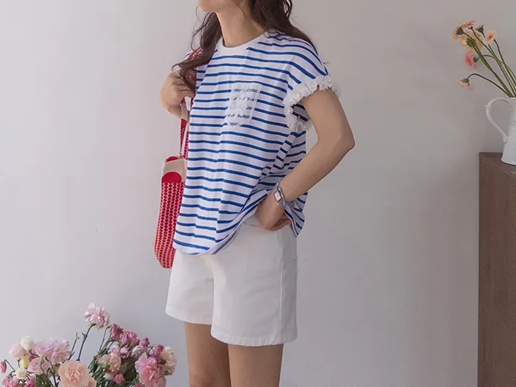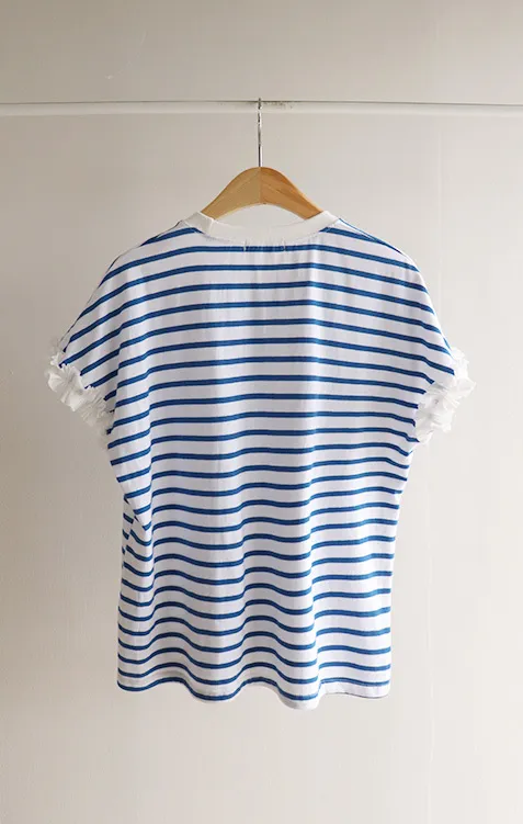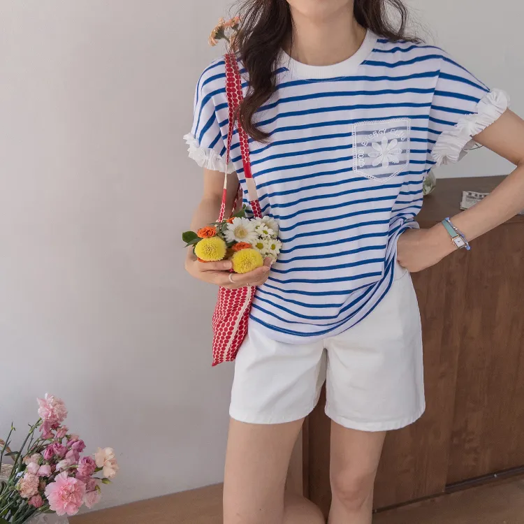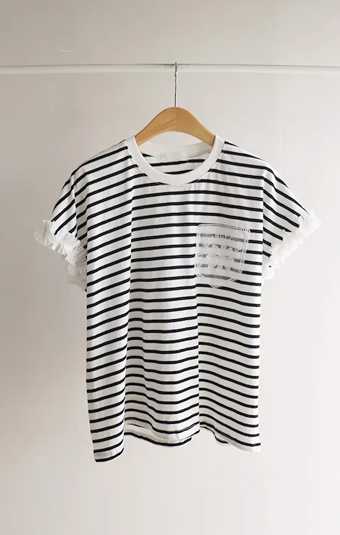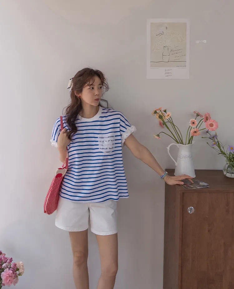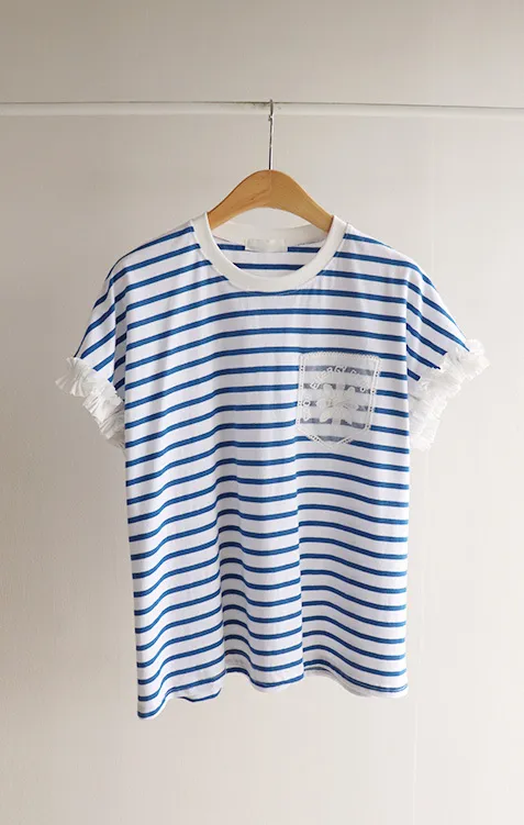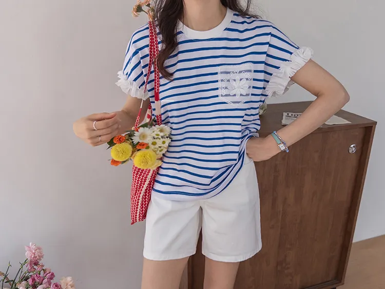 【清新海洋氣息!浪漫條紋上衣】【口袋處有蕾絲刺繡♥】【袖口飾有褶邊】【寬鬆版型,穿著舒適~】