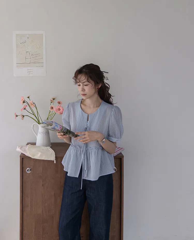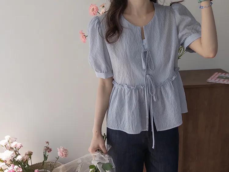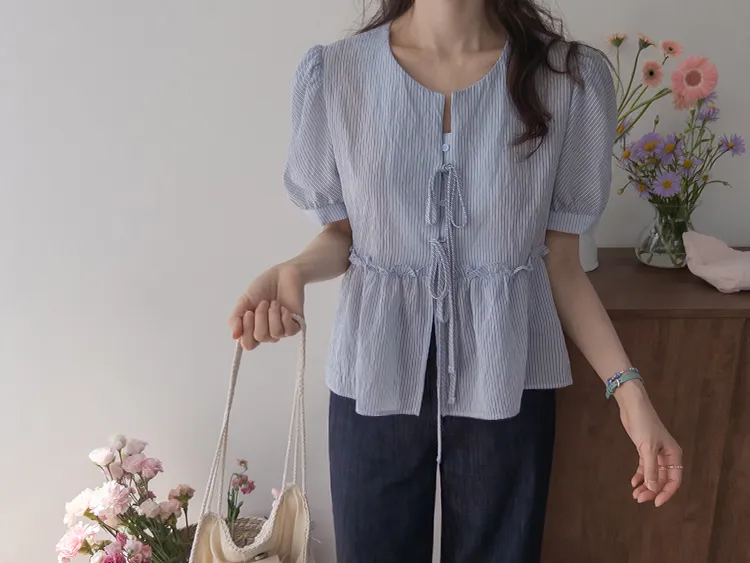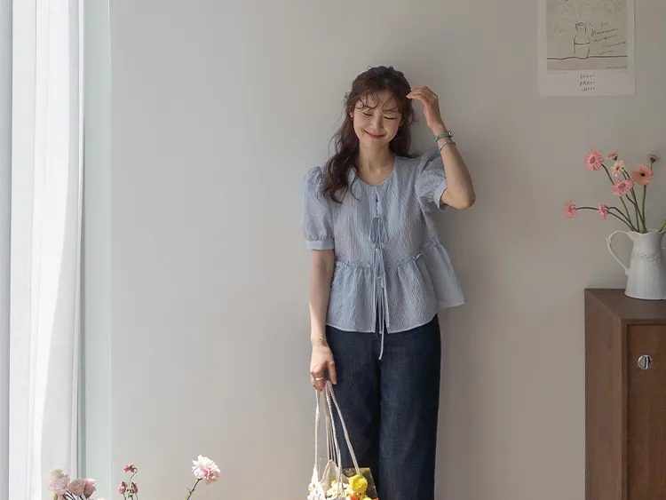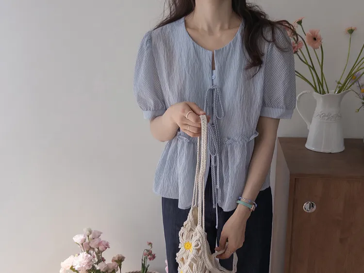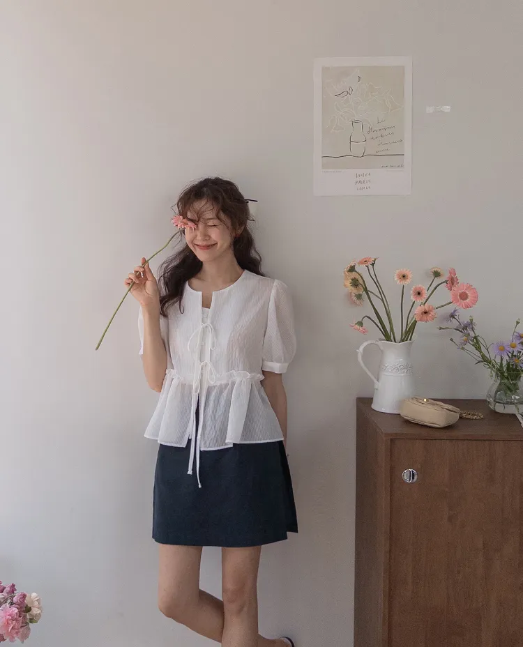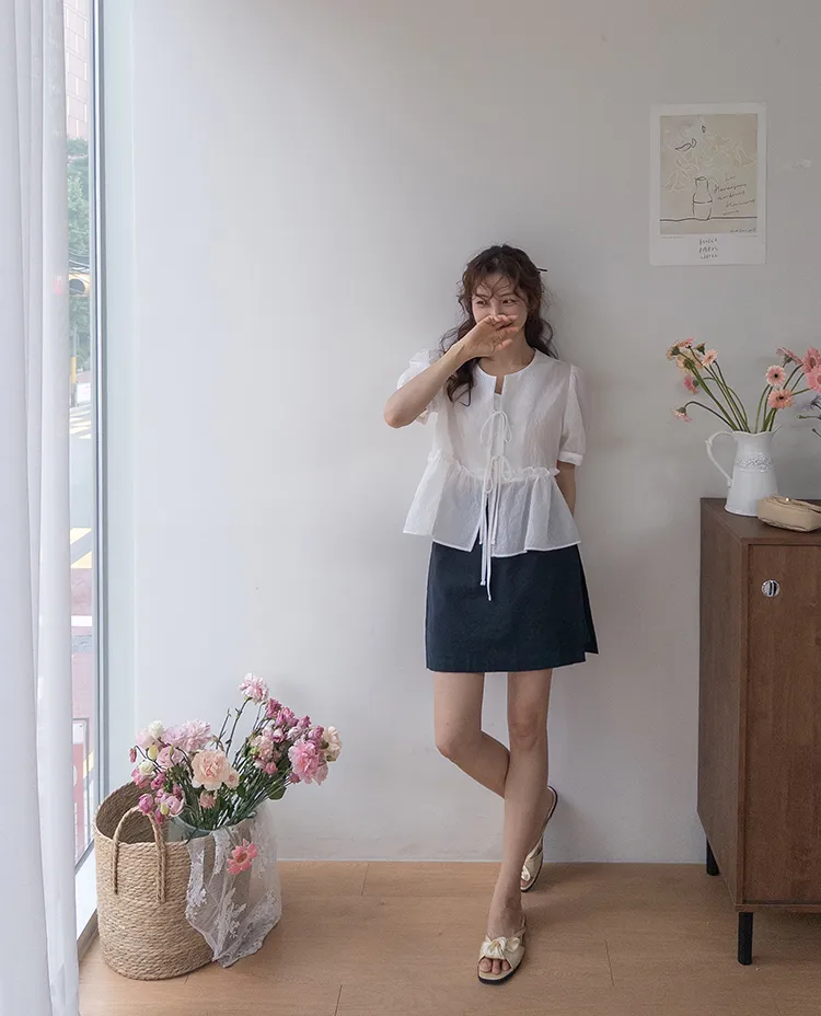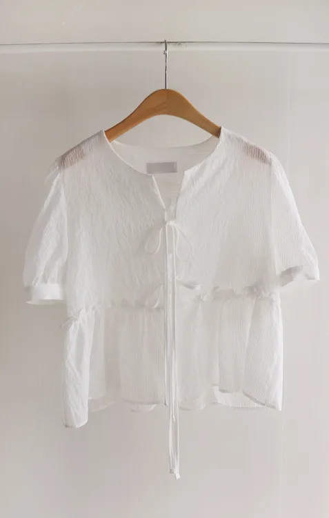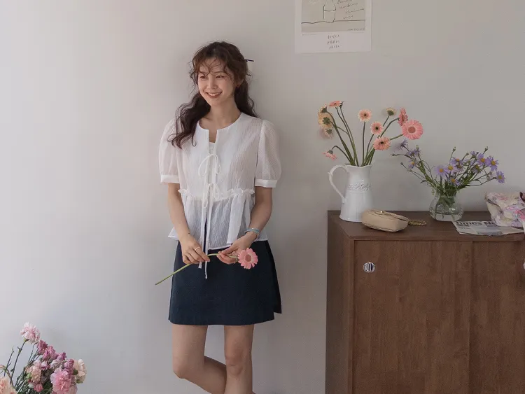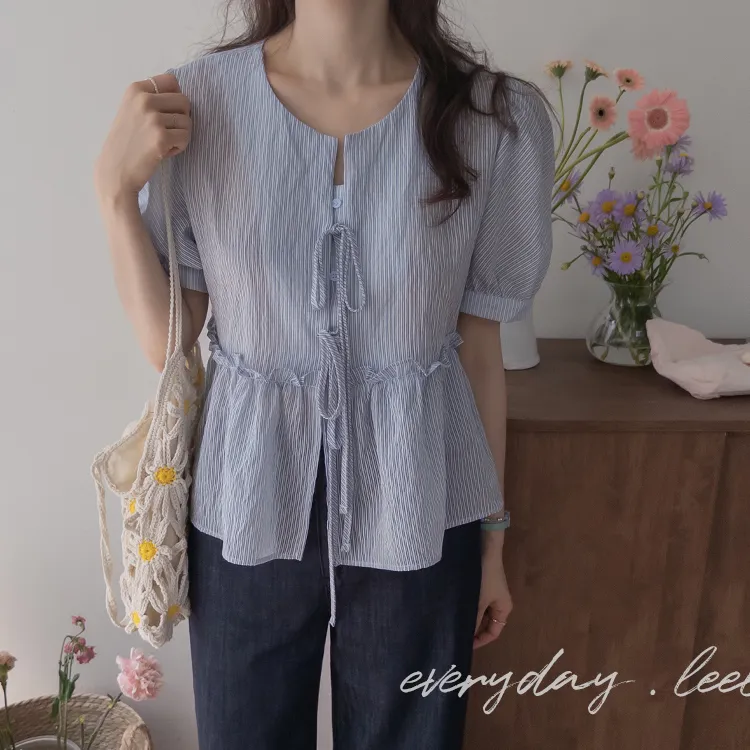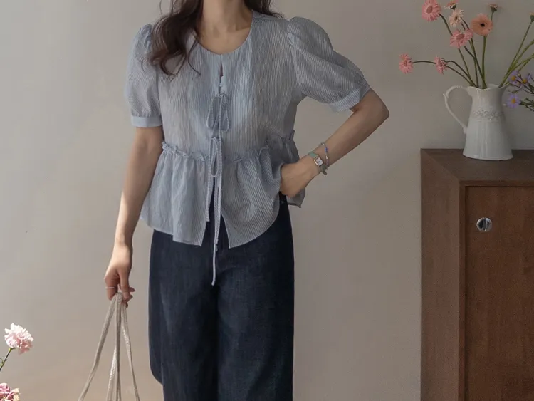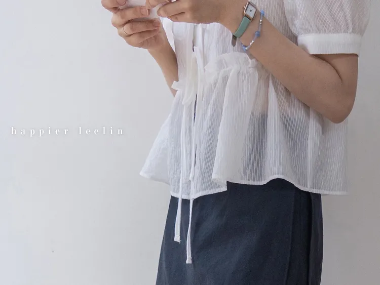 可愛綁帶點綴腰線褶邊穿搭上衣