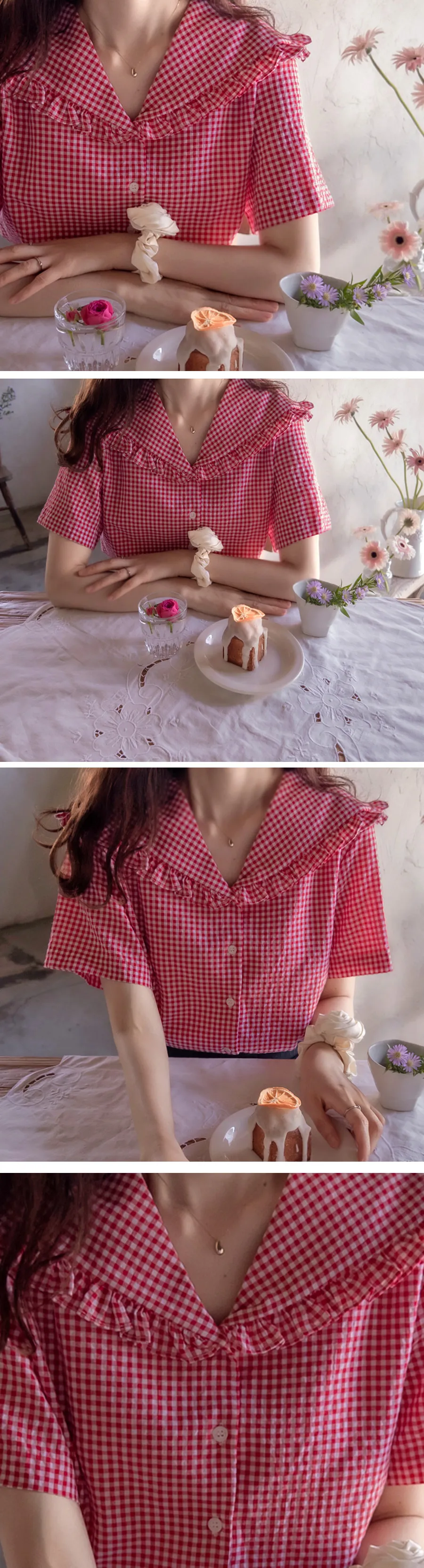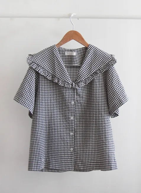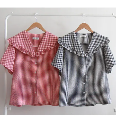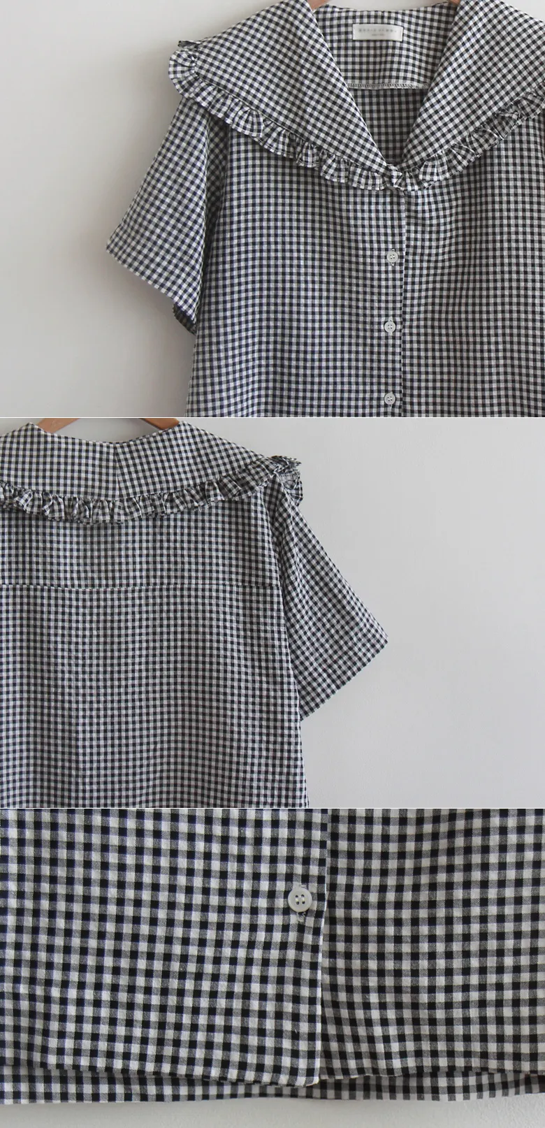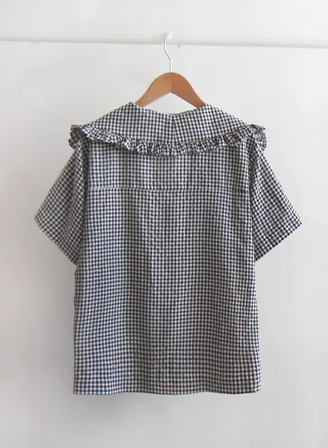 【涼爽舒適的布料,穿著舒適,不用擔心褶皺】 【格紋圖案,帶來清新感】 【可愛的水手領上衣】 【採用褶皺領設計,營造出優雅精緻氛圍】 【夏季清涼格紋上衣】