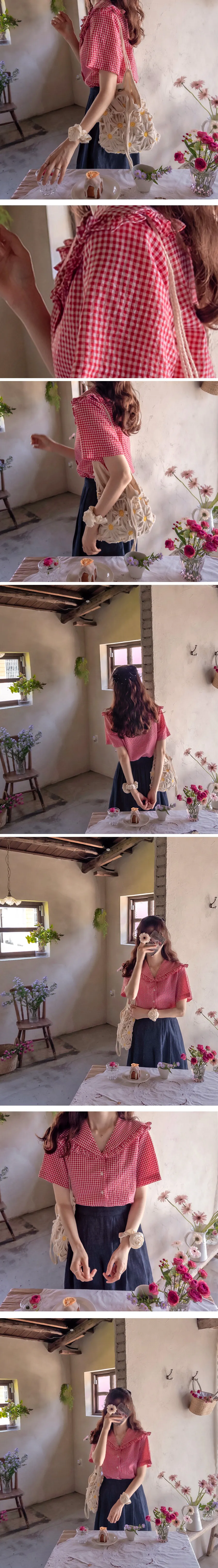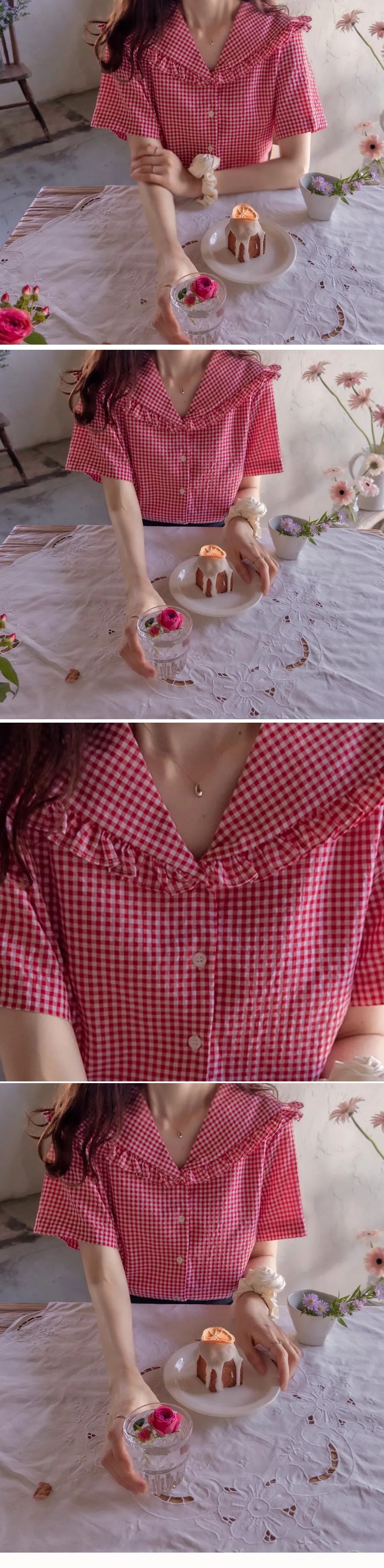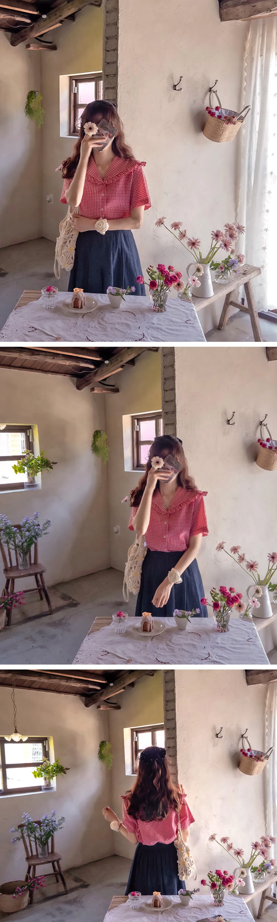 【涼爽舒適的布料,穿著舒適,不用擔心褶皺】 【格紋圖案,帶來清新感】 【可愛的水手領上衣】 【採用褶皺領設計,營造出優雅精緻氛圍】 【夏季清涼格紋上衣】