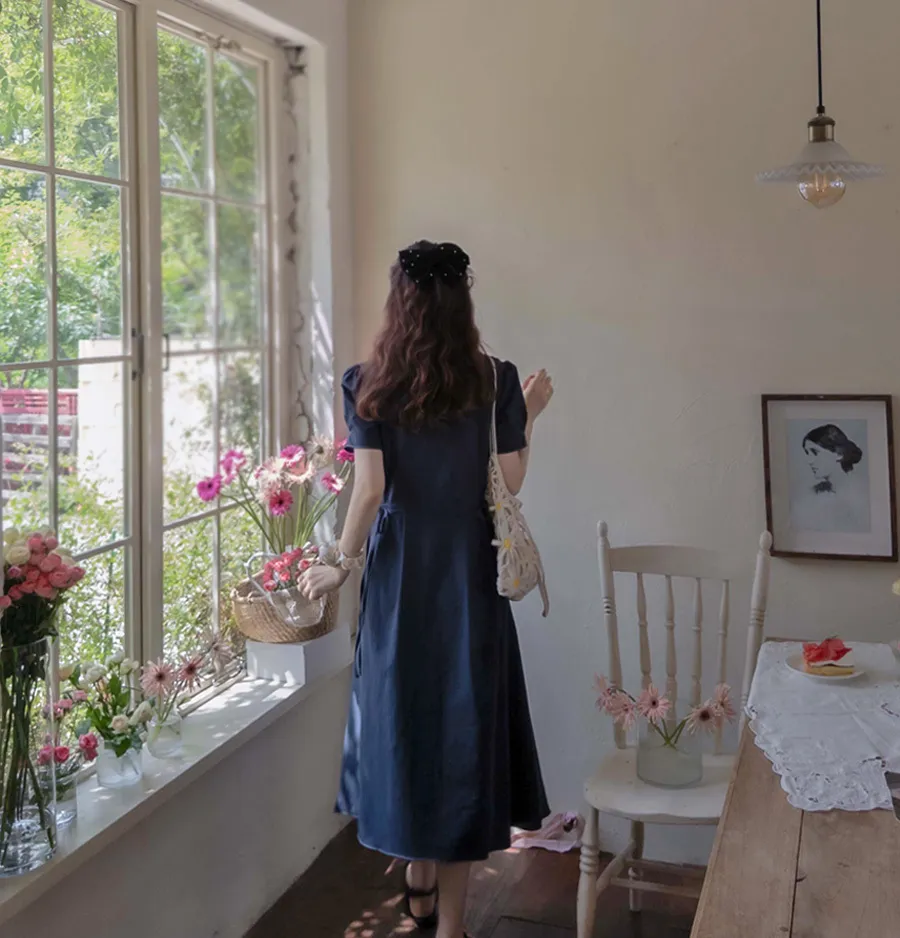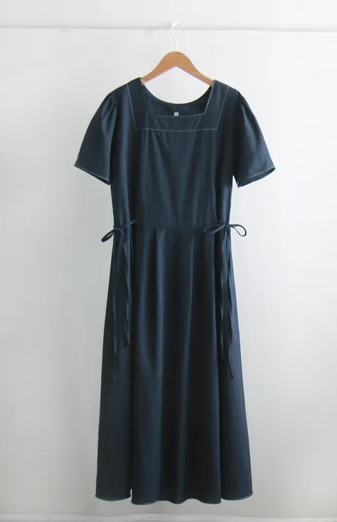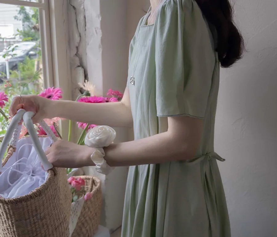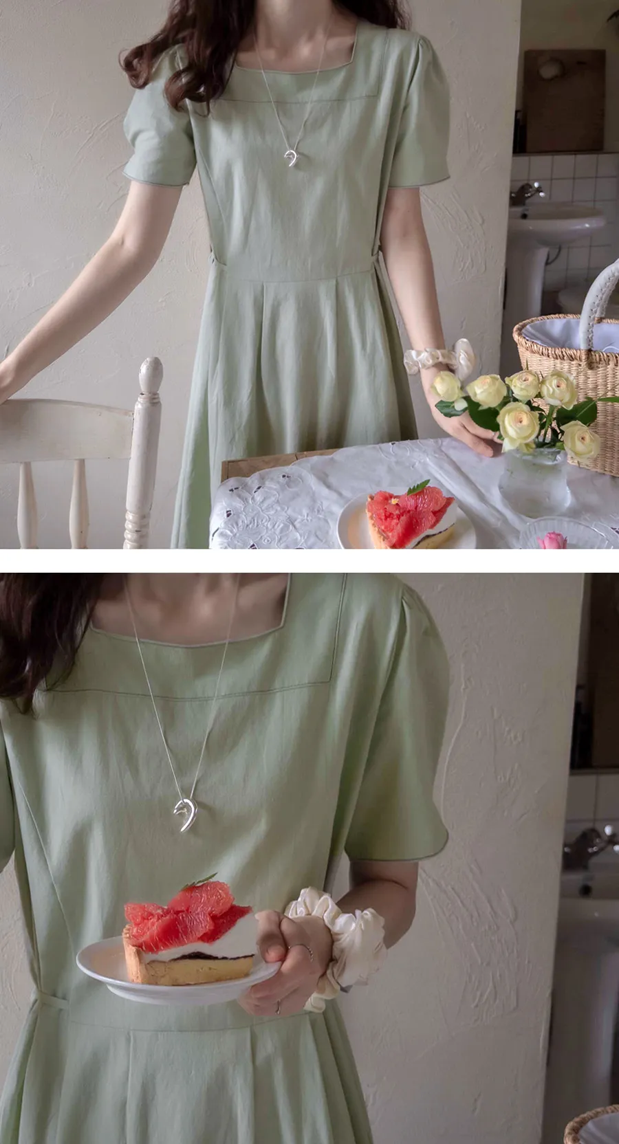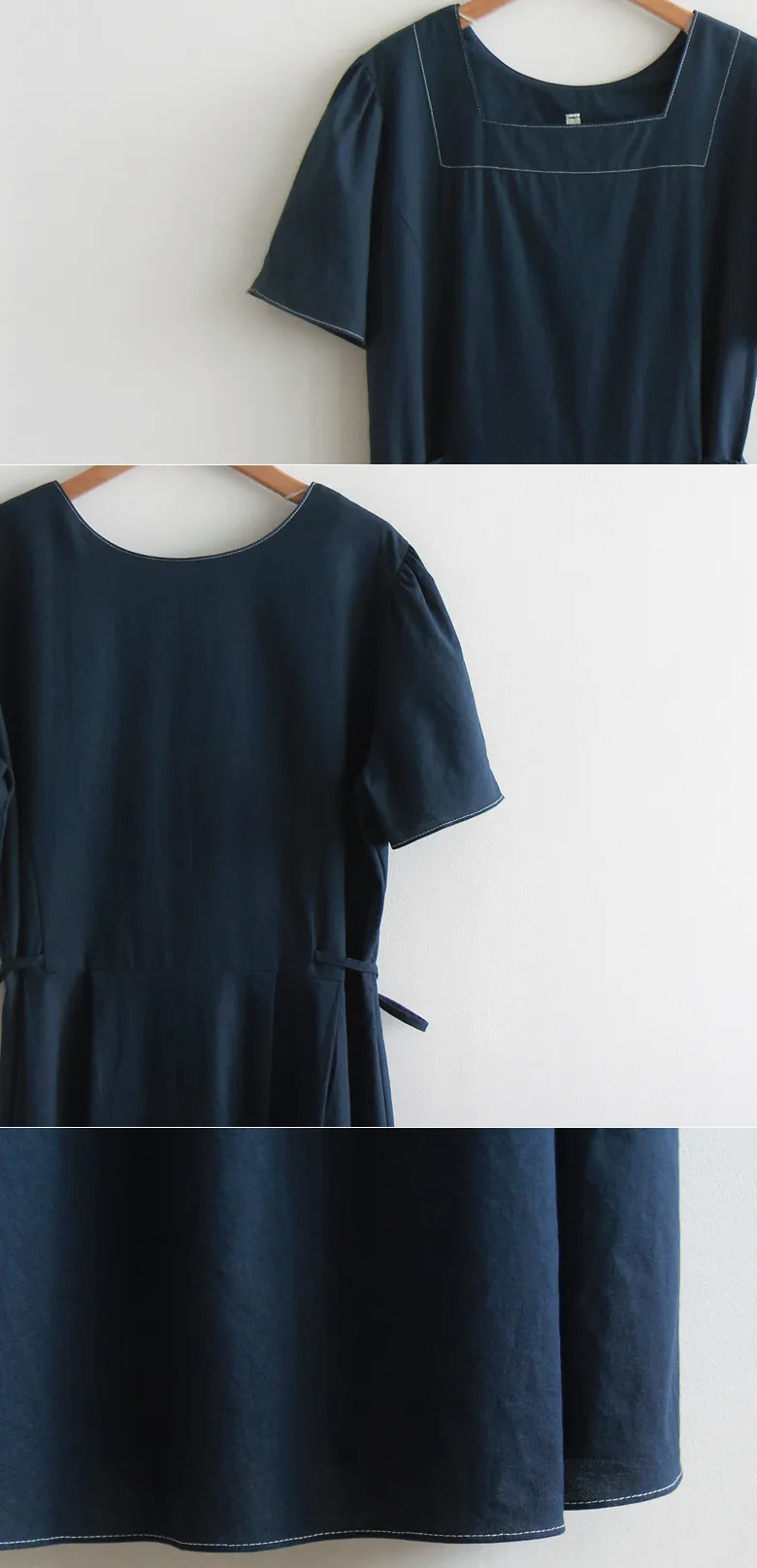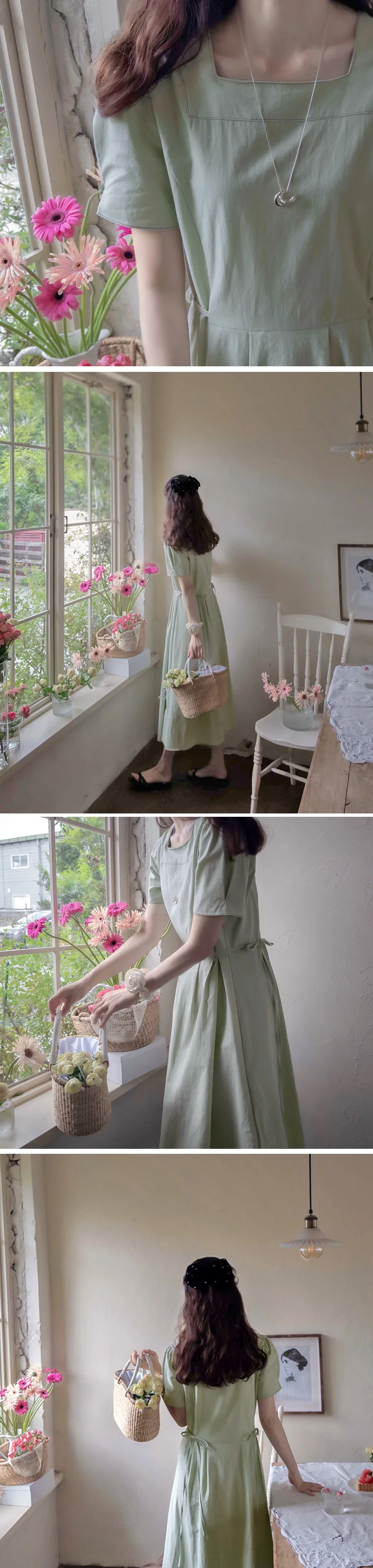 【方領與柔和色彩的夏季連身裙♥】【腰間兩側繫上綁帶蝴蝶結,營造可愛氛圍】【優雅邊緣貼合感,非常適合夏季的日常穿著~】【作為夏季可愛連身裙,穿著舒適】