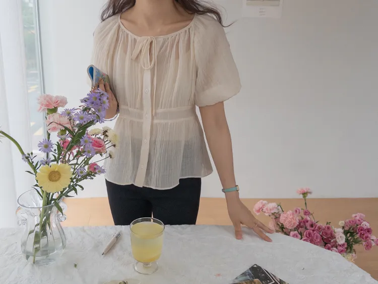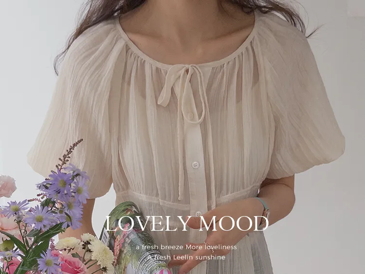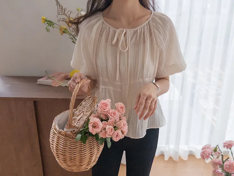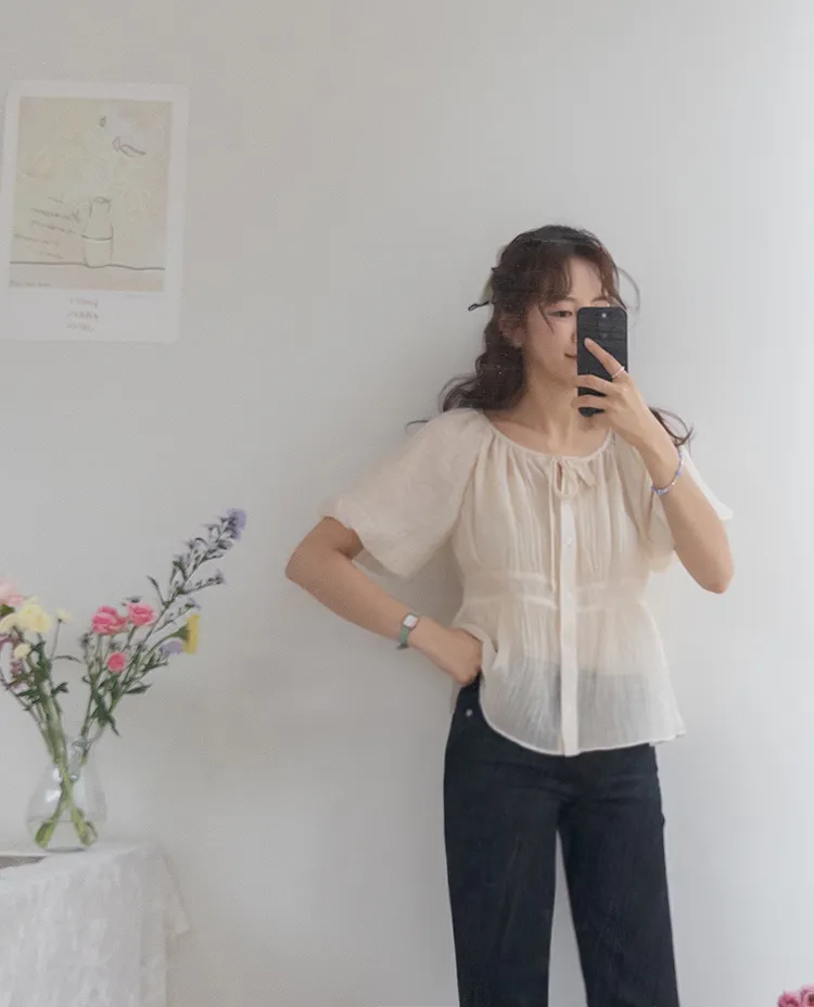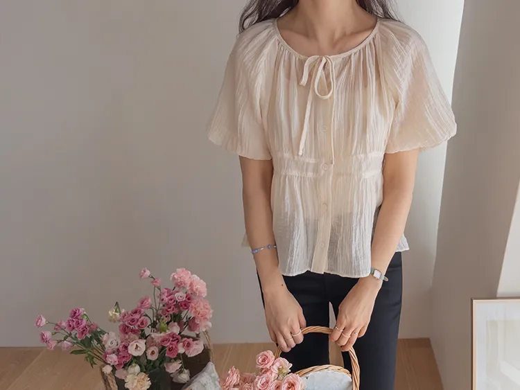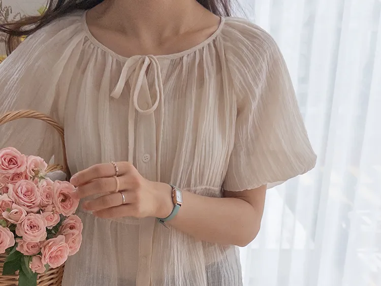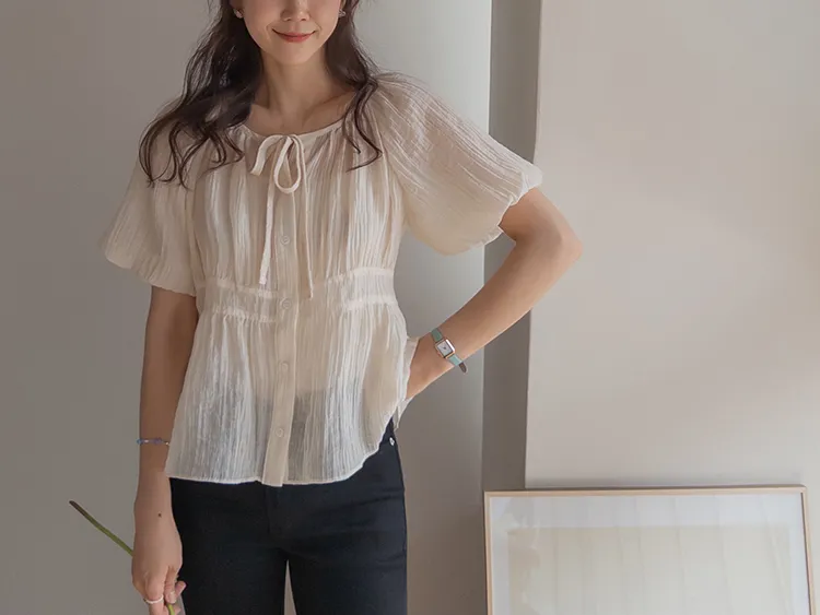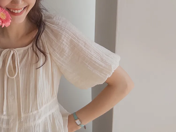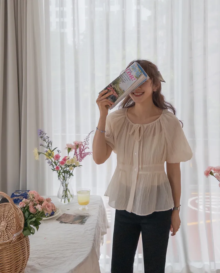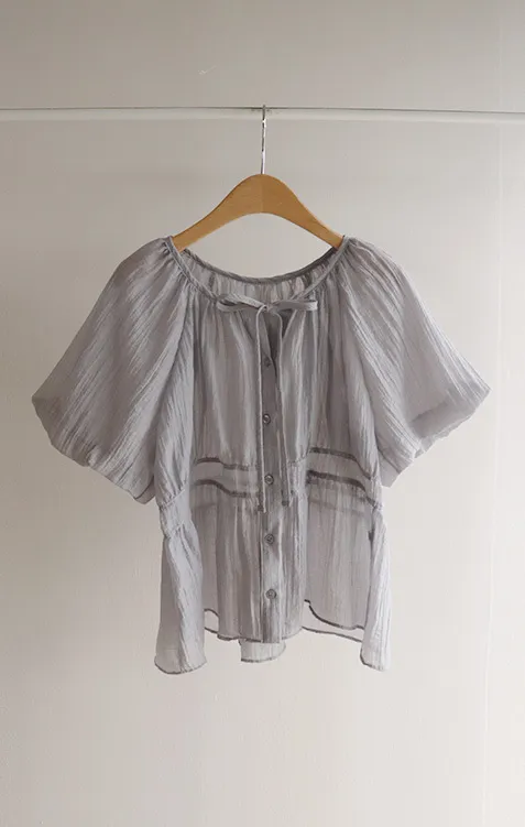 柔美領口綁帶傘擺廓形皺摺排扣上衣 現貨灰
