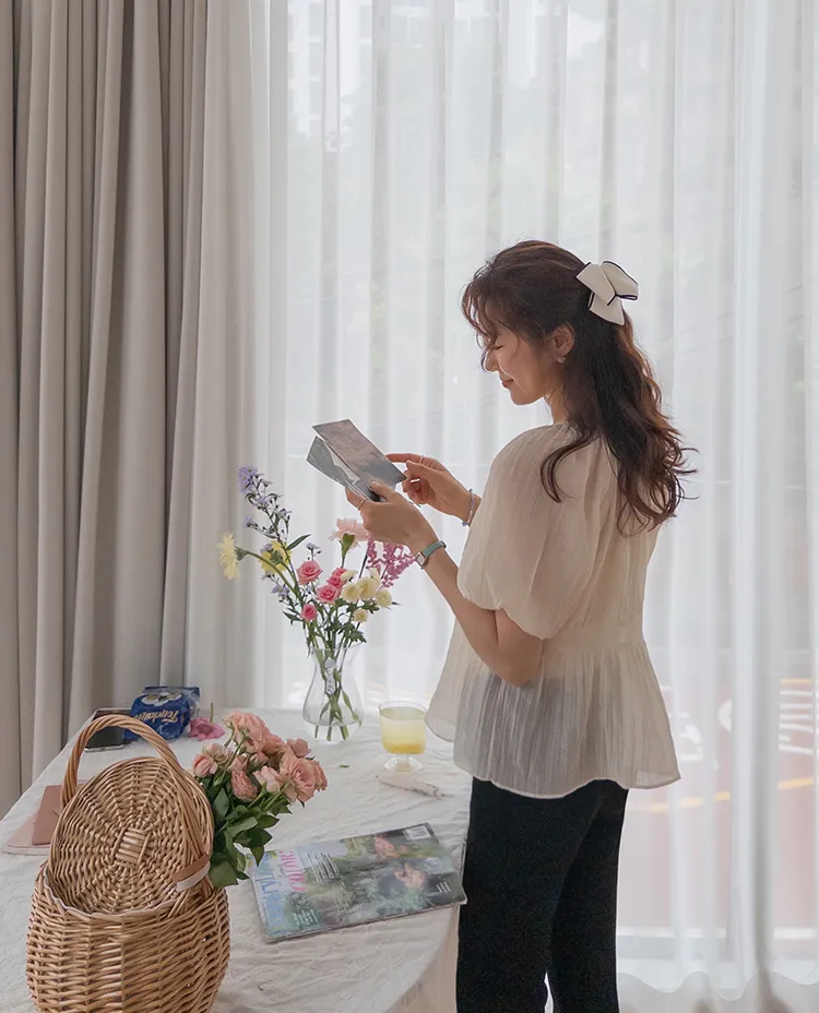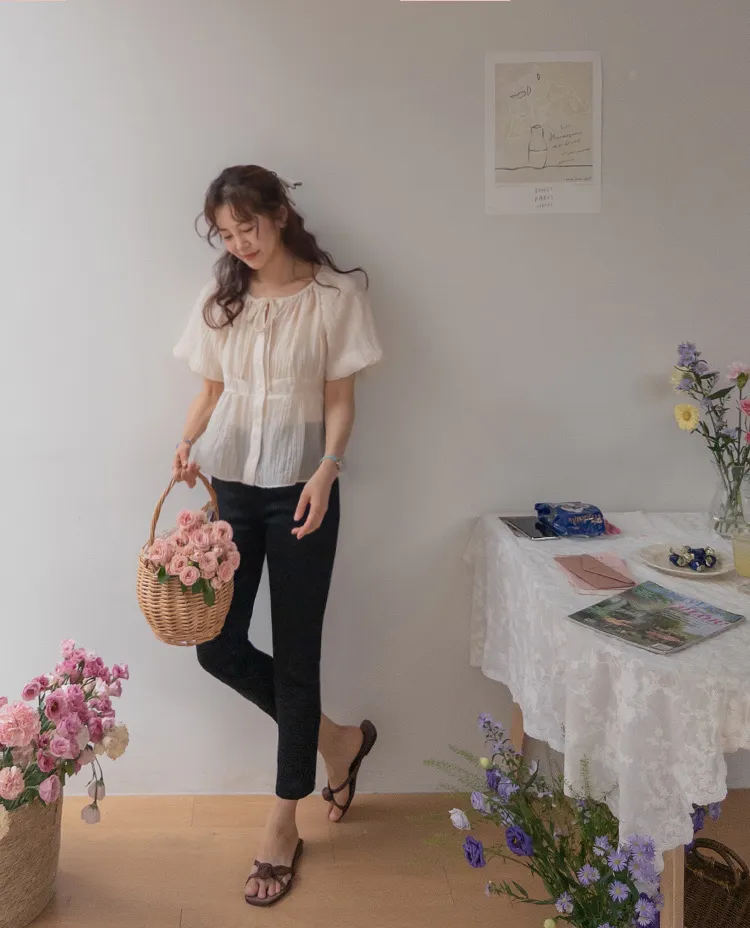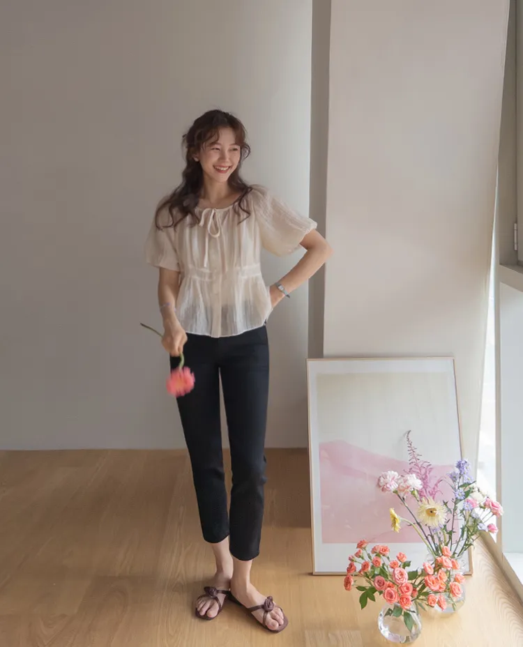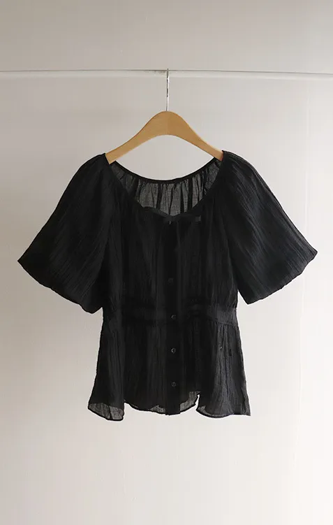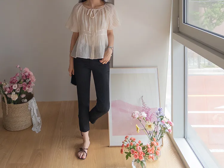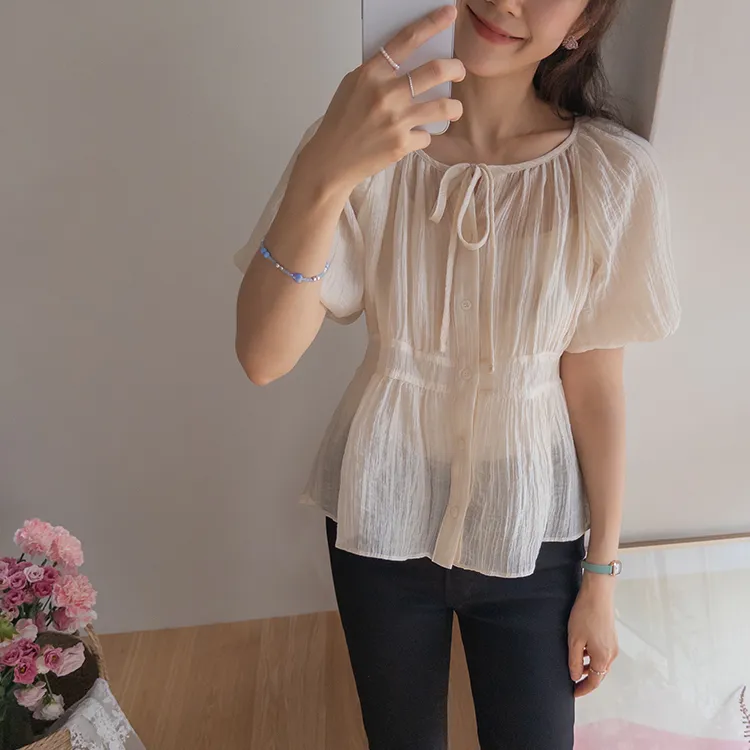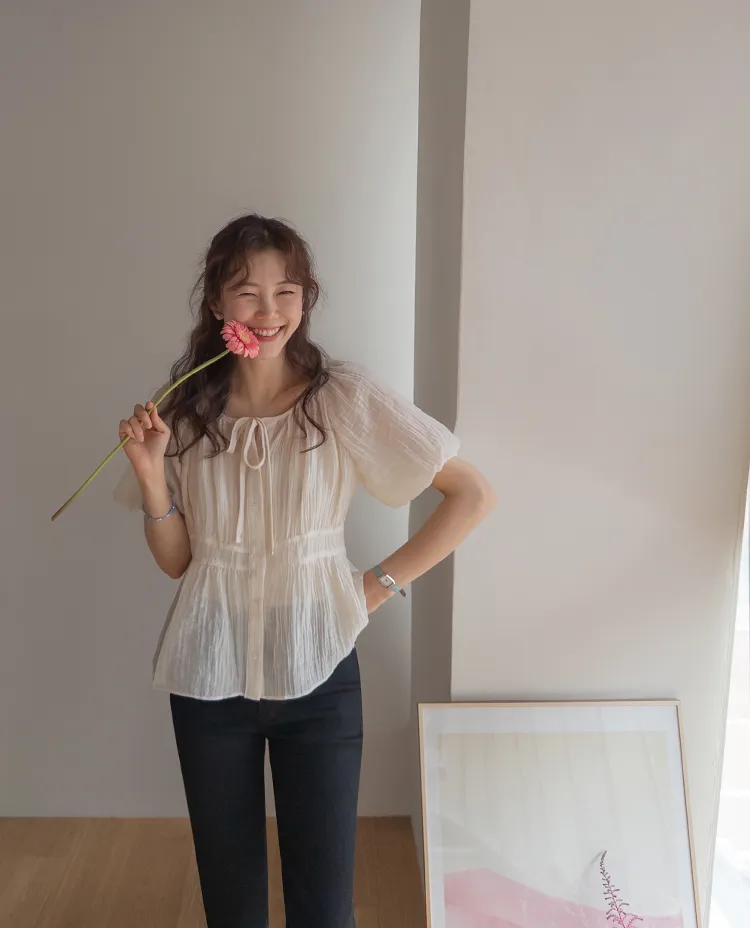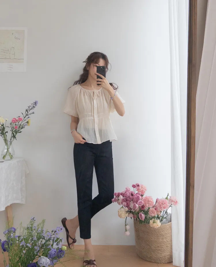 柔美領口綁帶傘擺廓形皺摺排扣上衣 現貨灰
