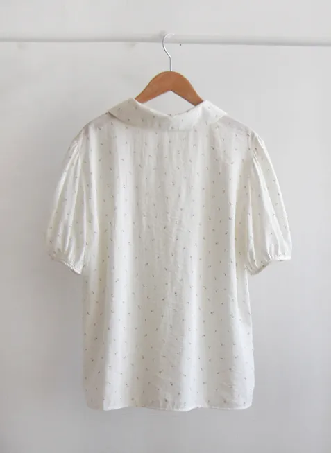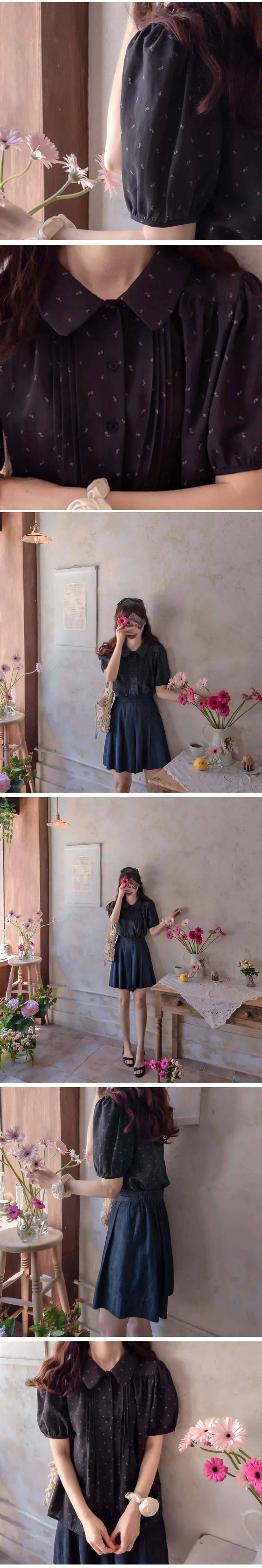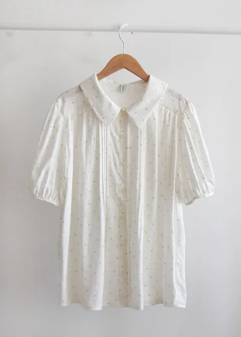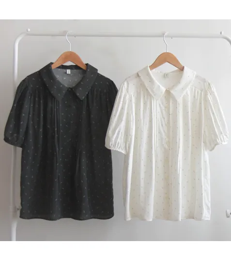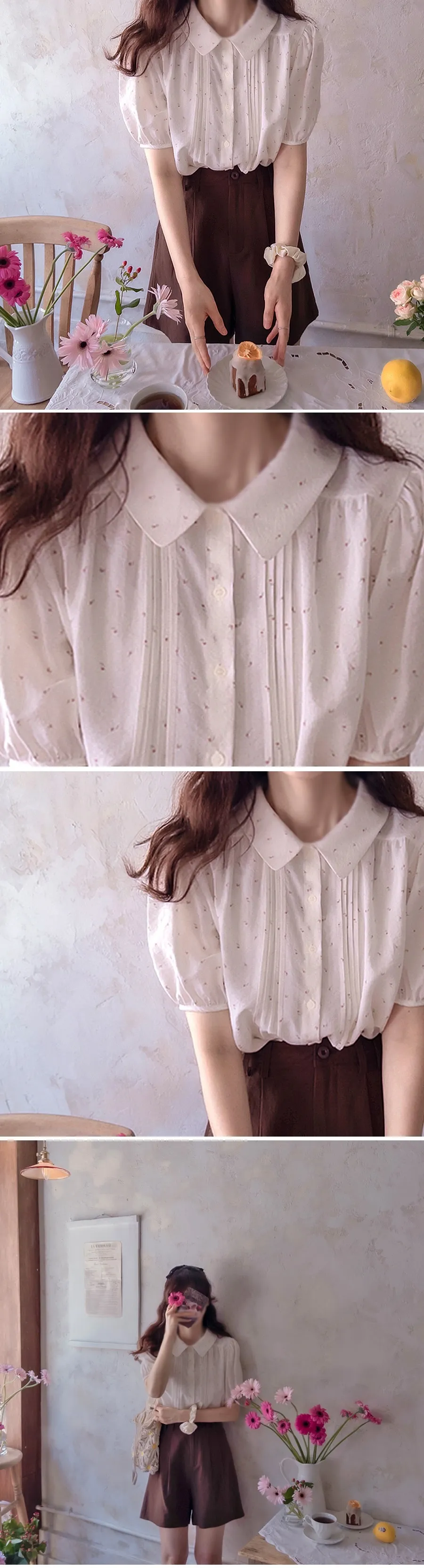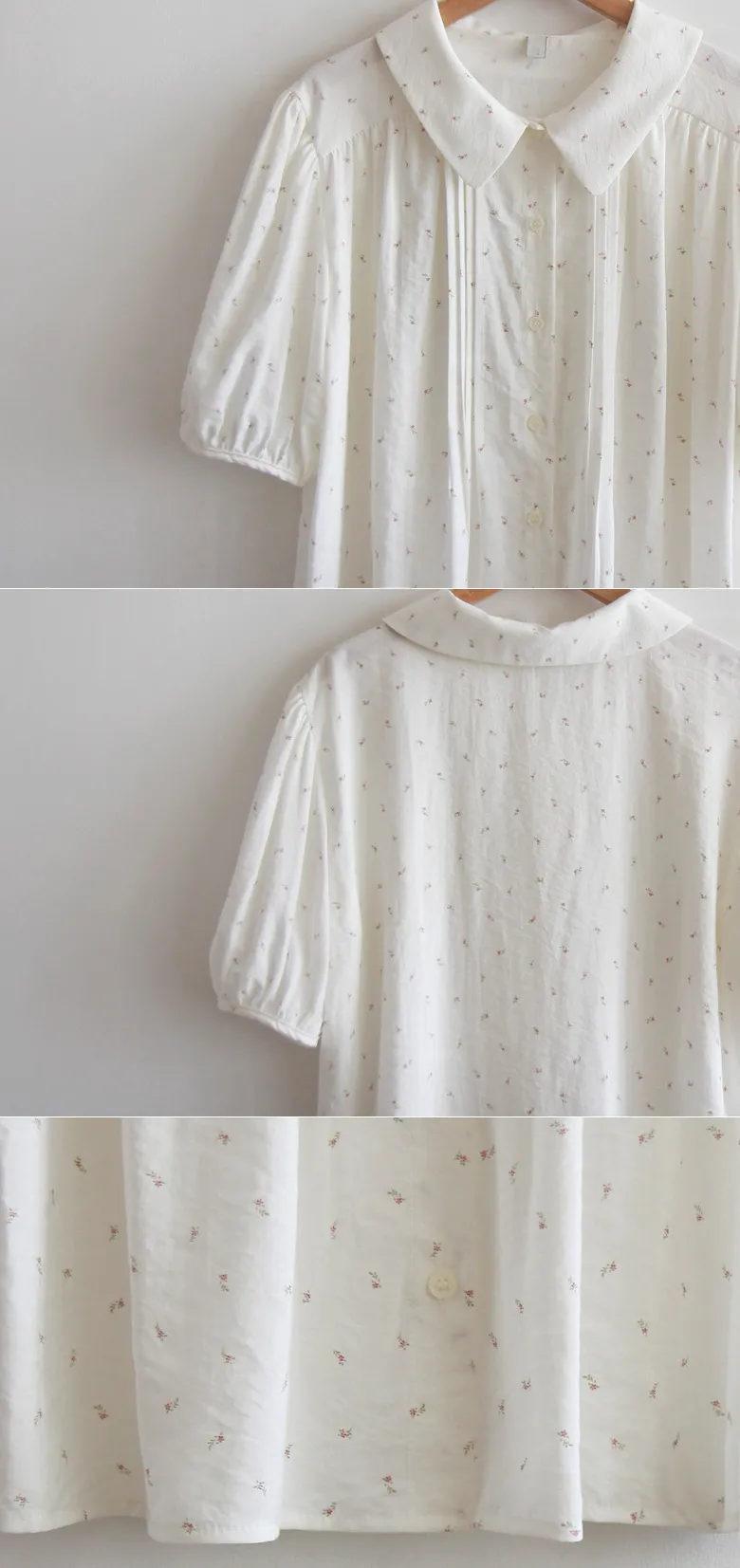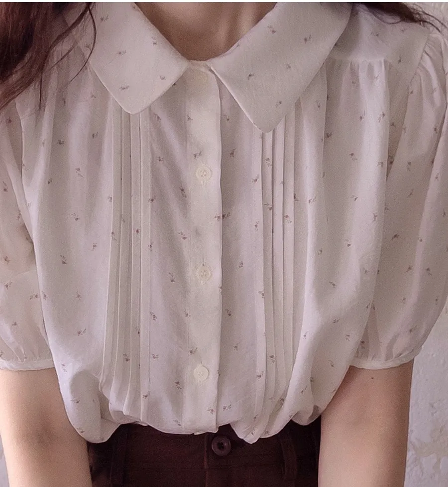 優雅領口精緻針摺迷你小花排扣上衣