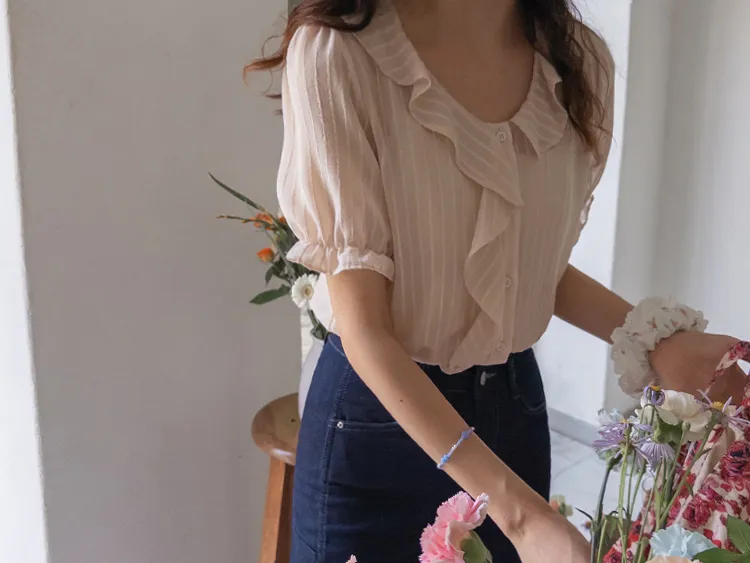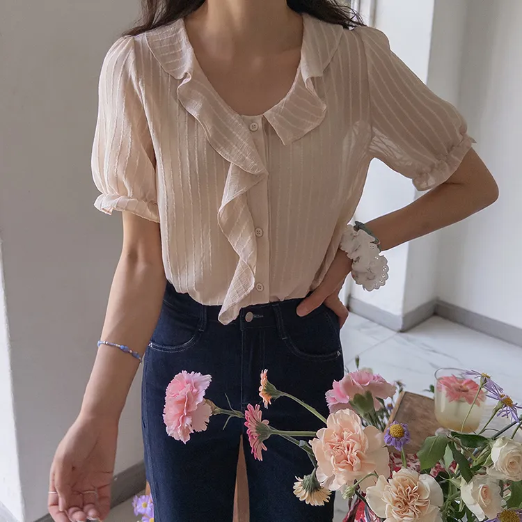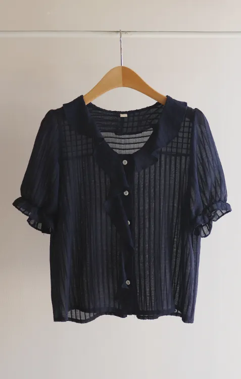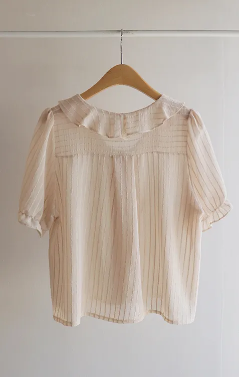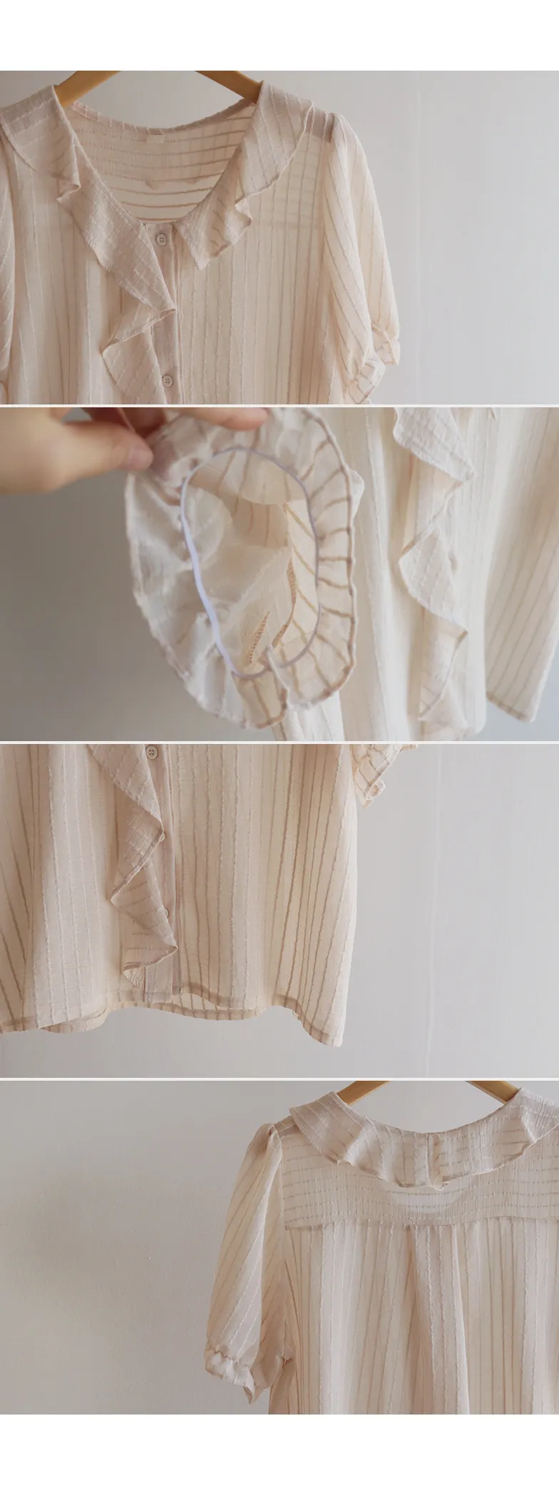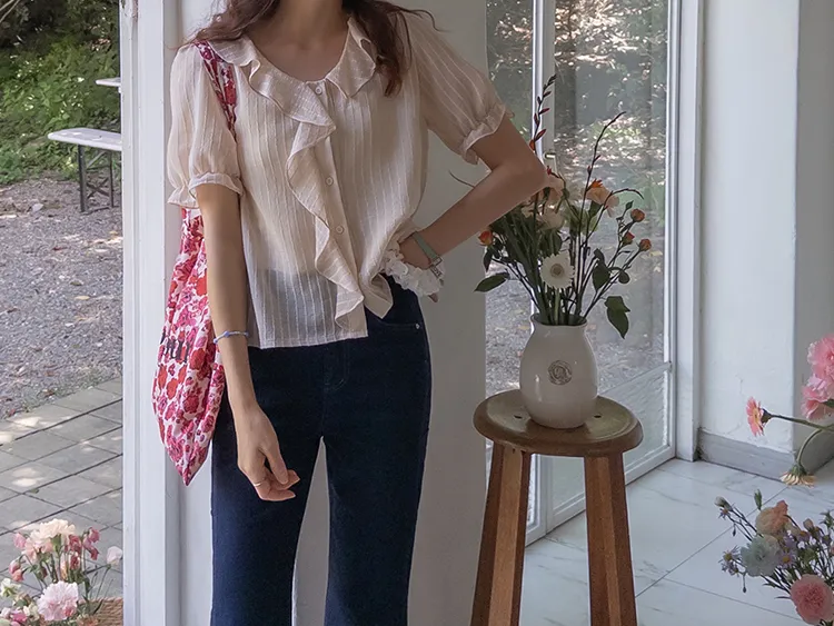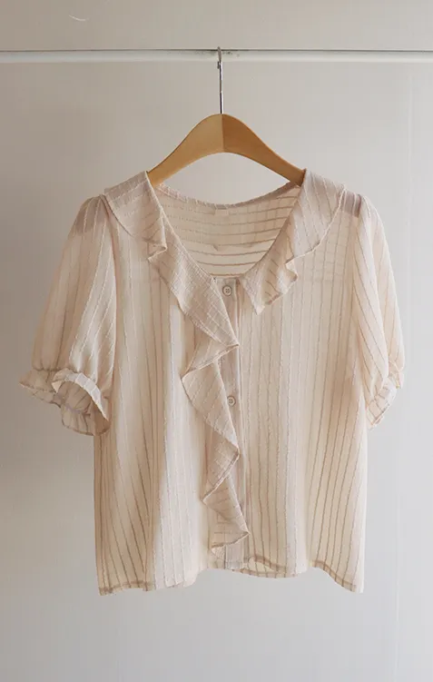 【充滿女性氣息的透視褶邊上衣】 【不易起皺♥】 【修身版型~涼爽到盛夏~】 【細條紋圖案】