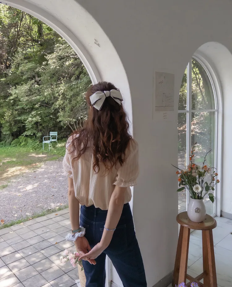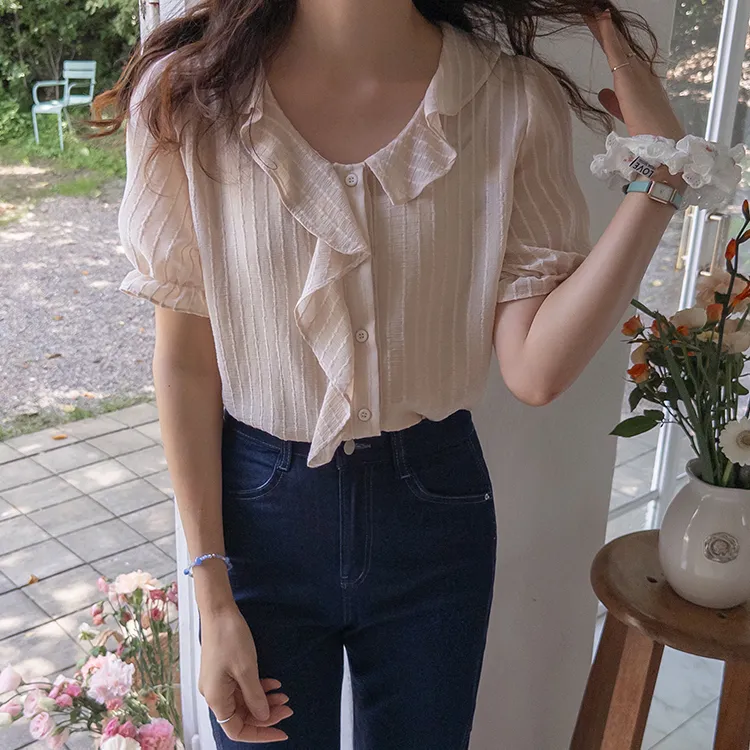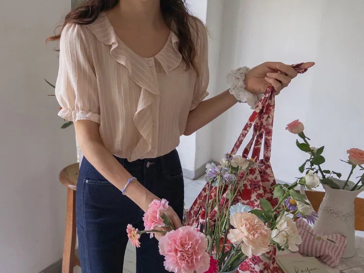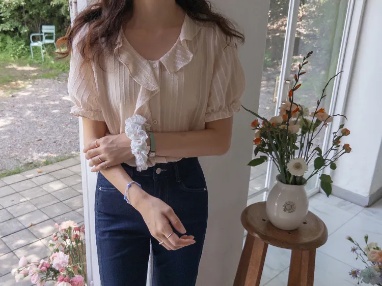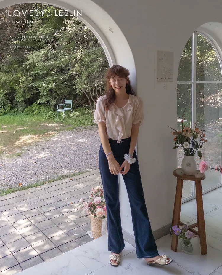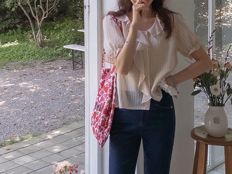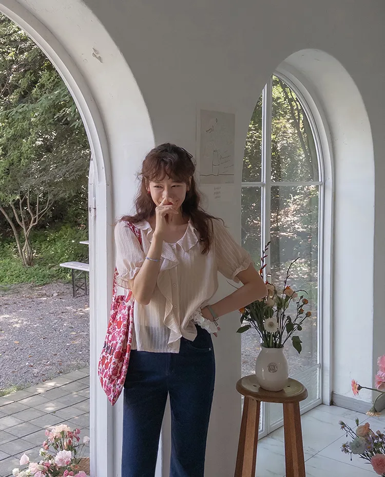 【充滿女性氣息的透視褶邊上衣】 【不易起皺♥】 【修身版型~涼爽到盛夏~】 【細條紋圖案】