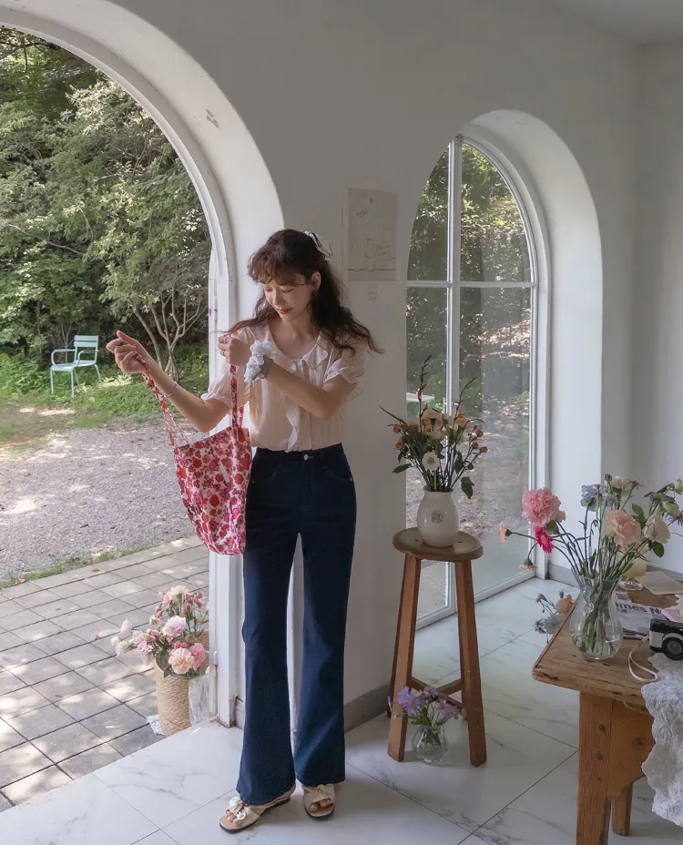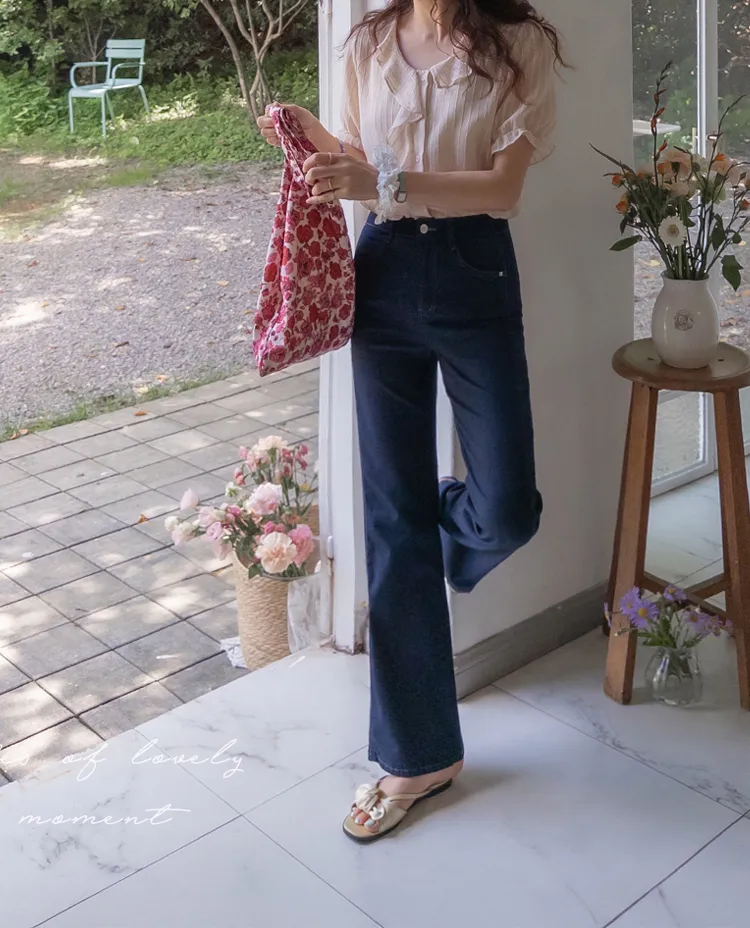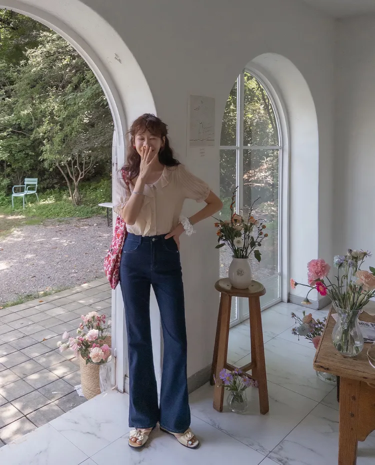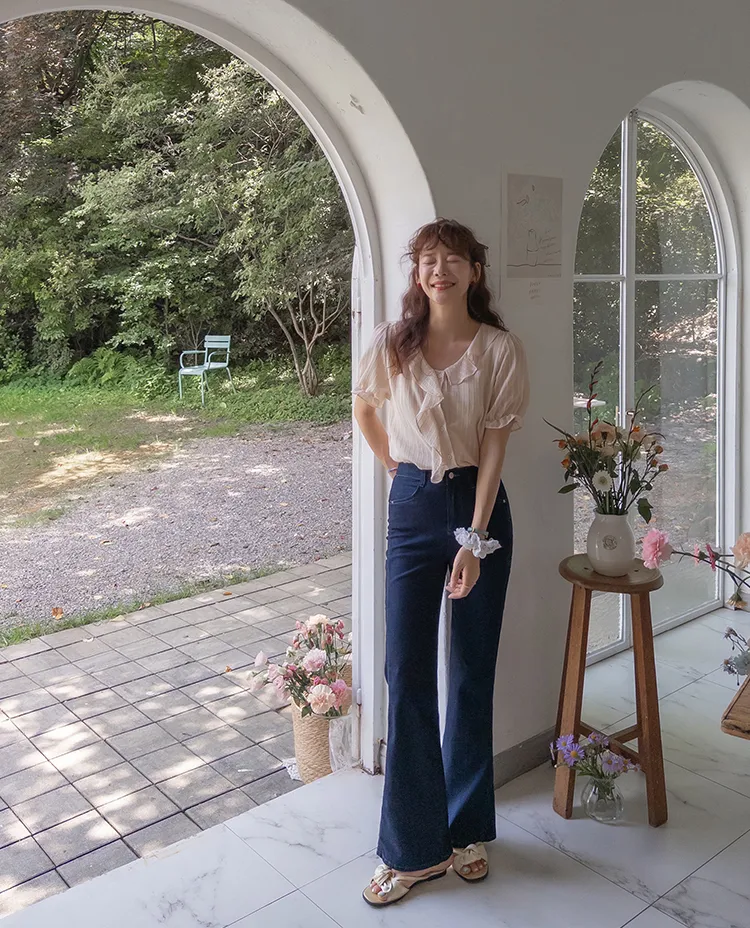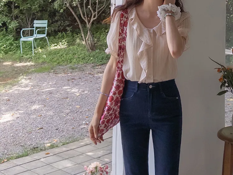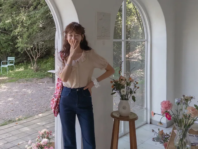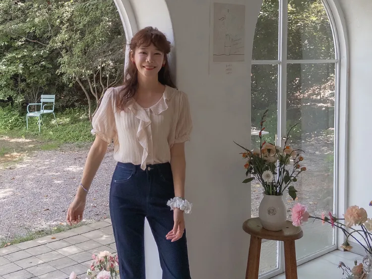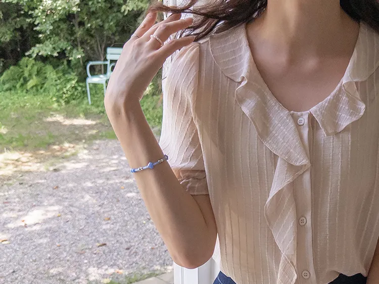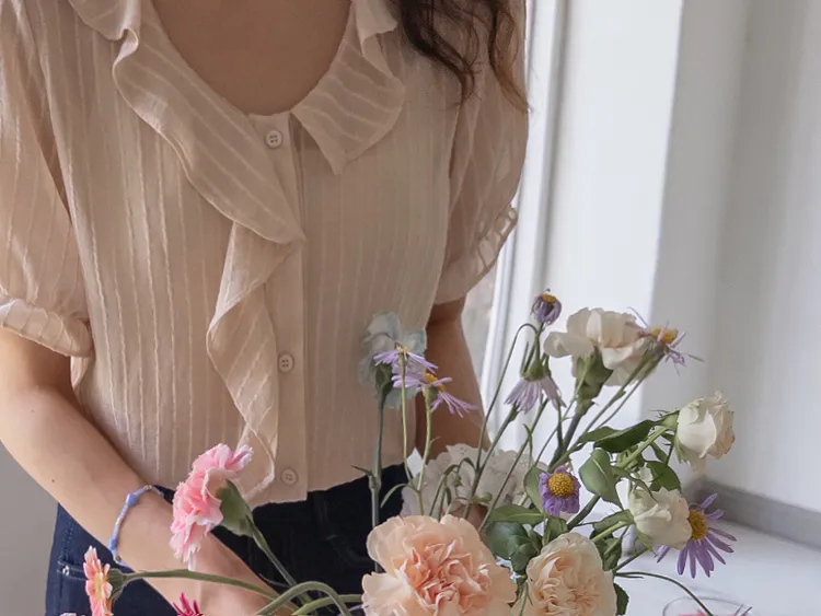柔美垂墜摺邊領口線條排扣上衣