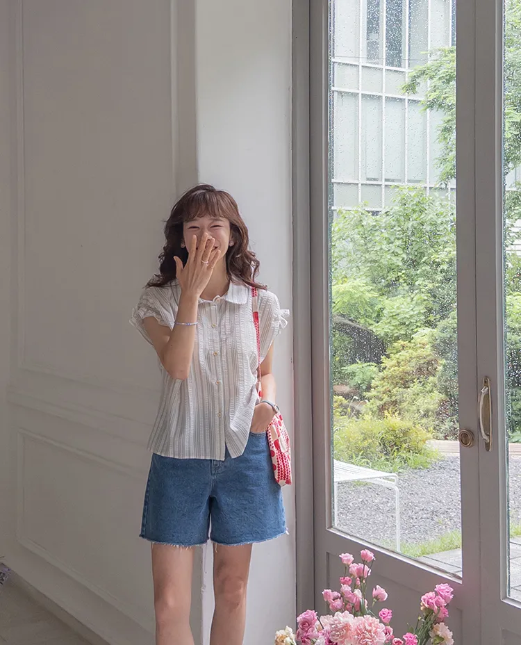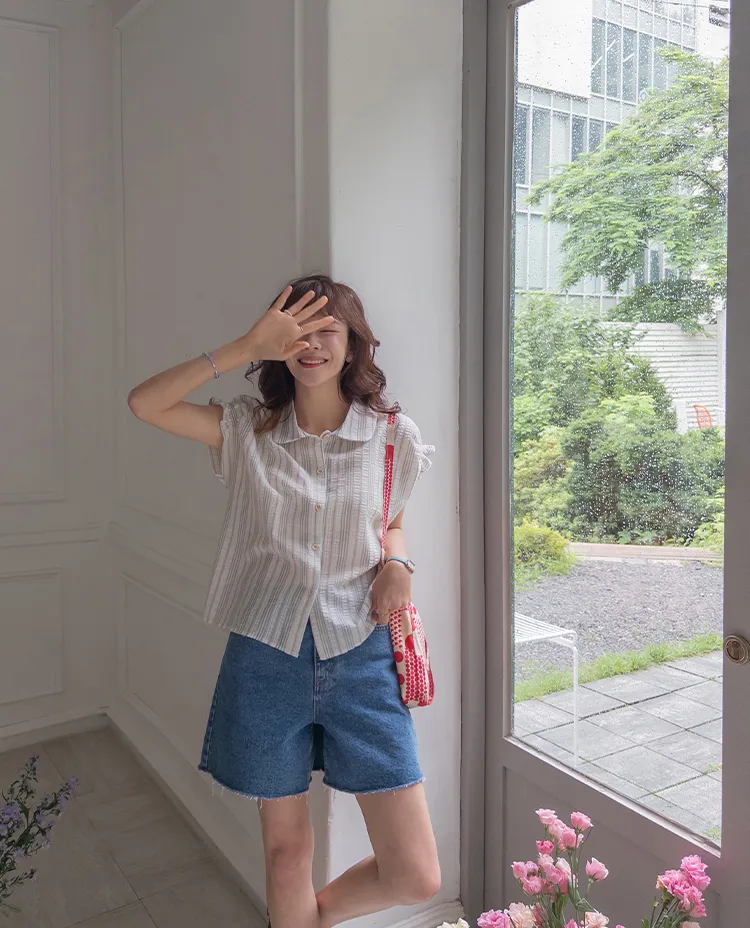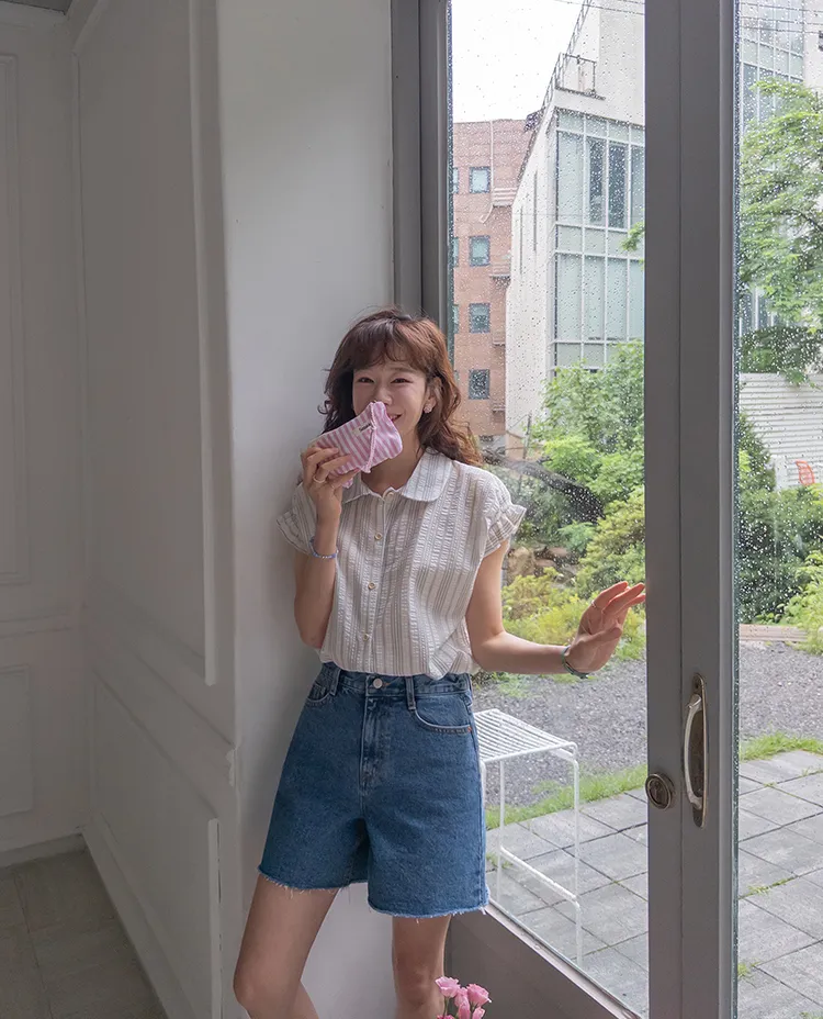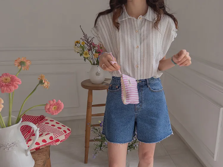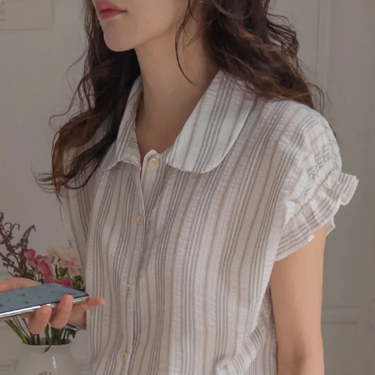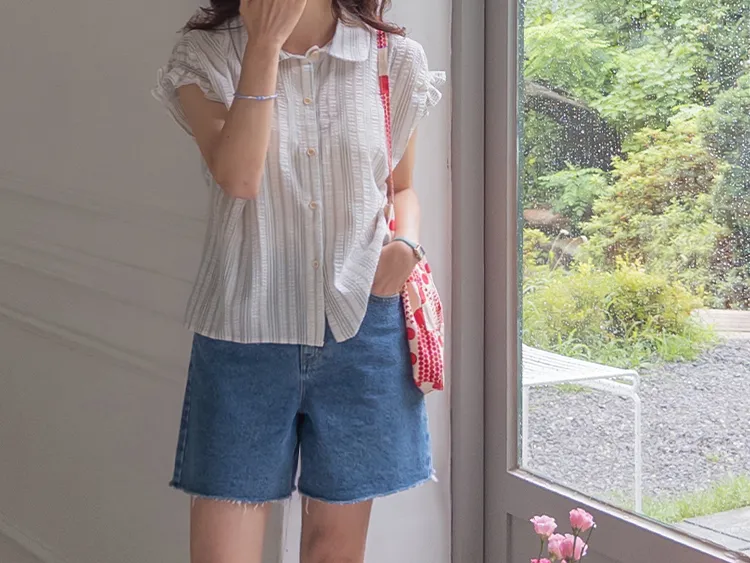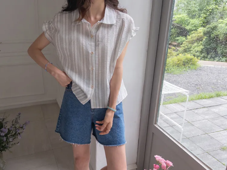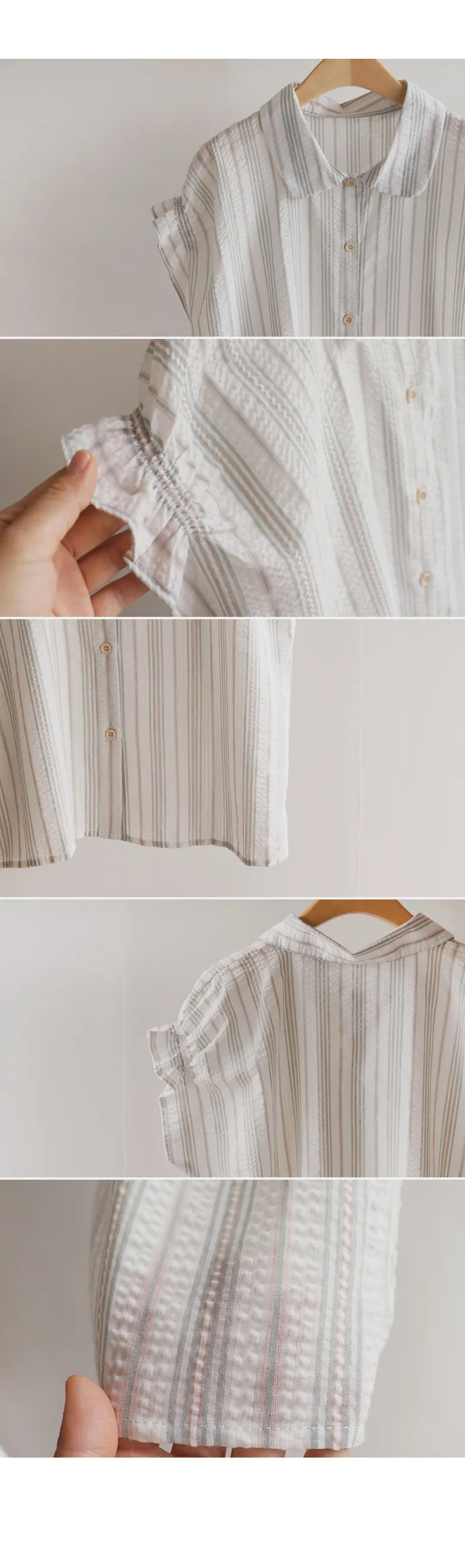 柔和條紋袖末摺邊飾帶立體感壓花排扣上衣