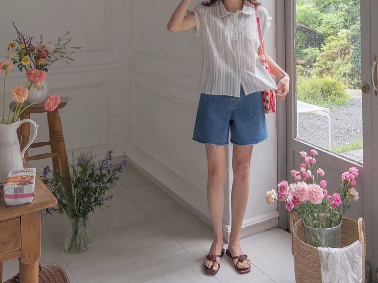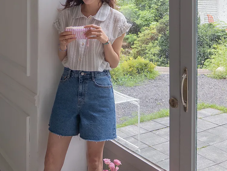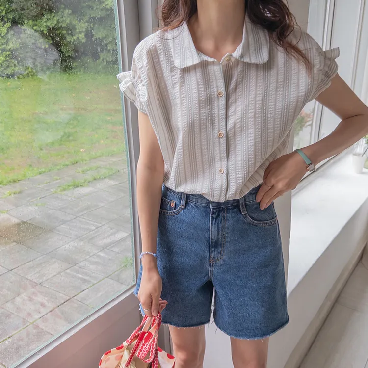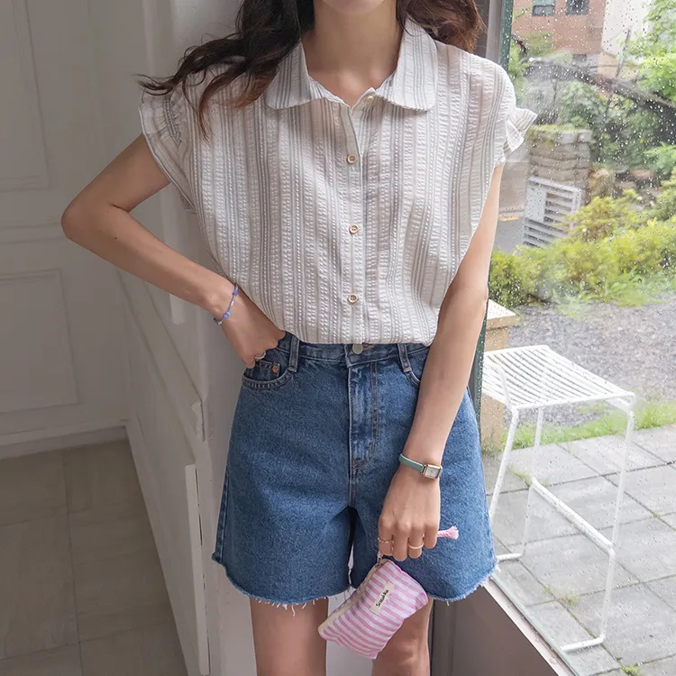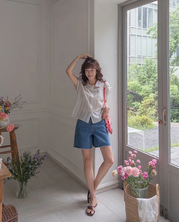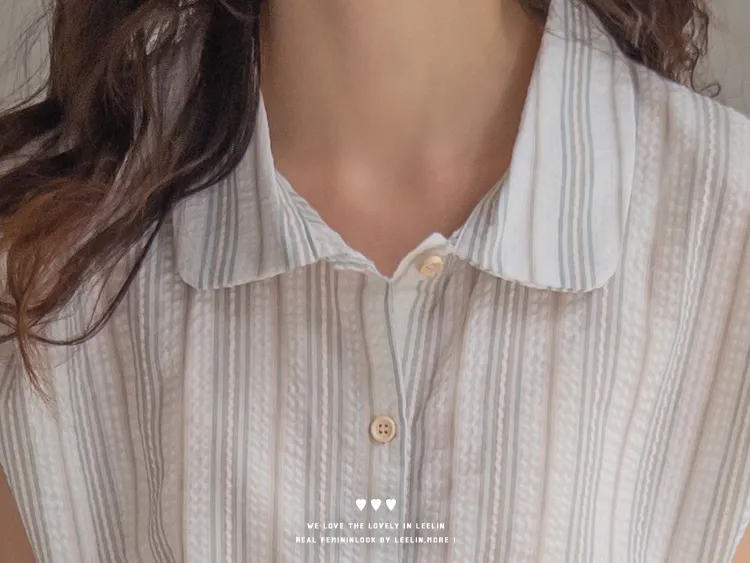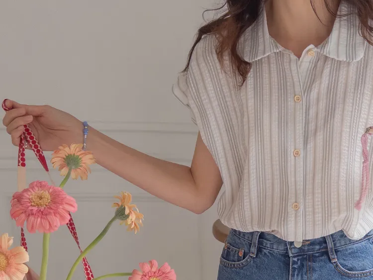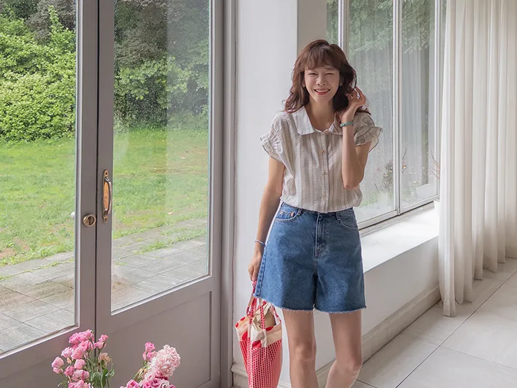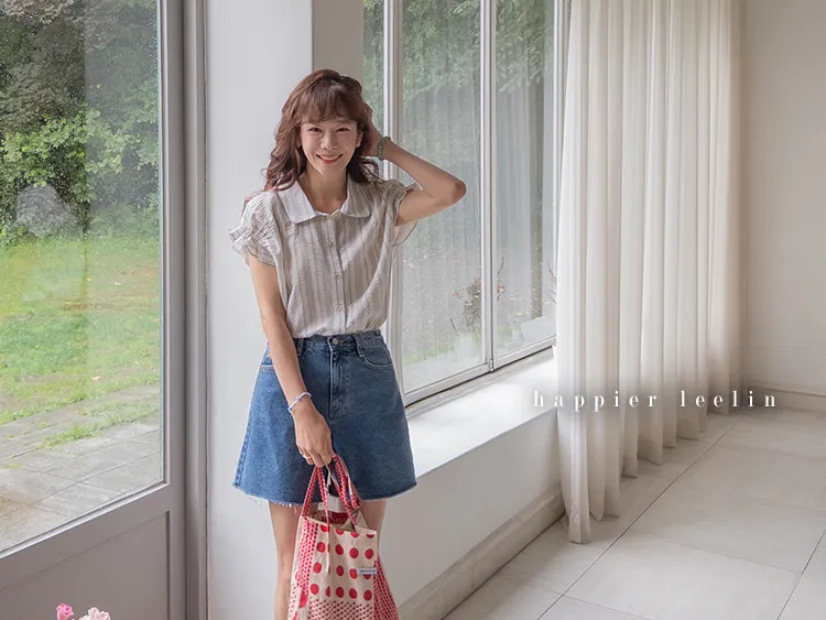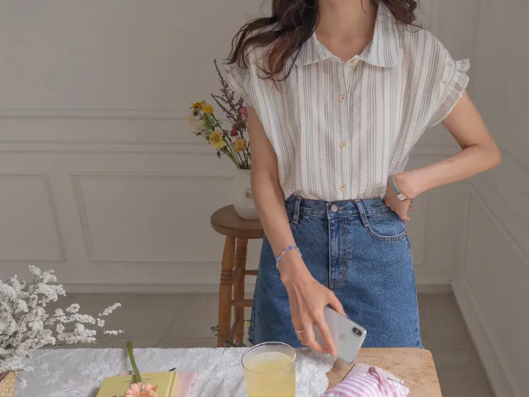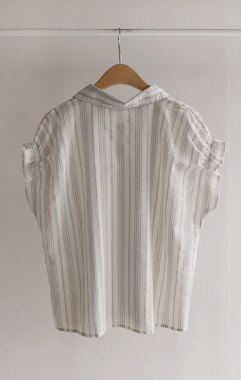 柔和條紋袖末摺邊飾帶立體感壓花排扣上衣