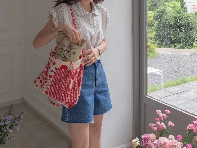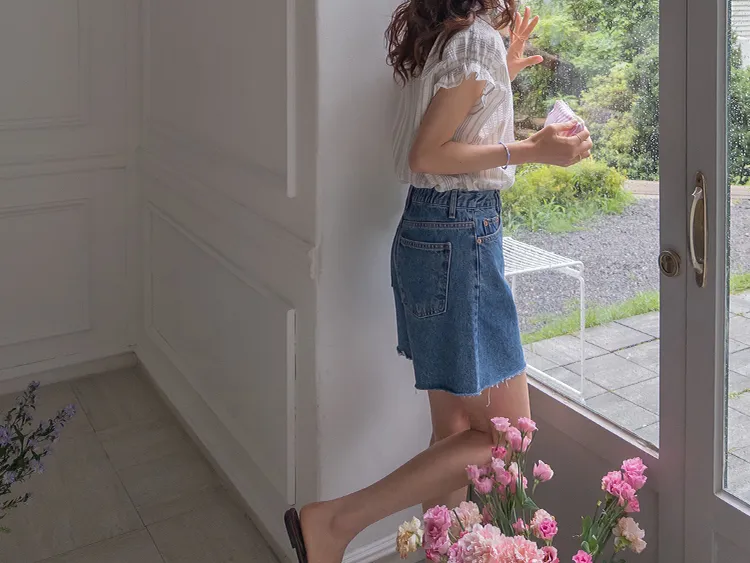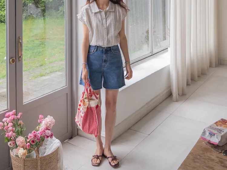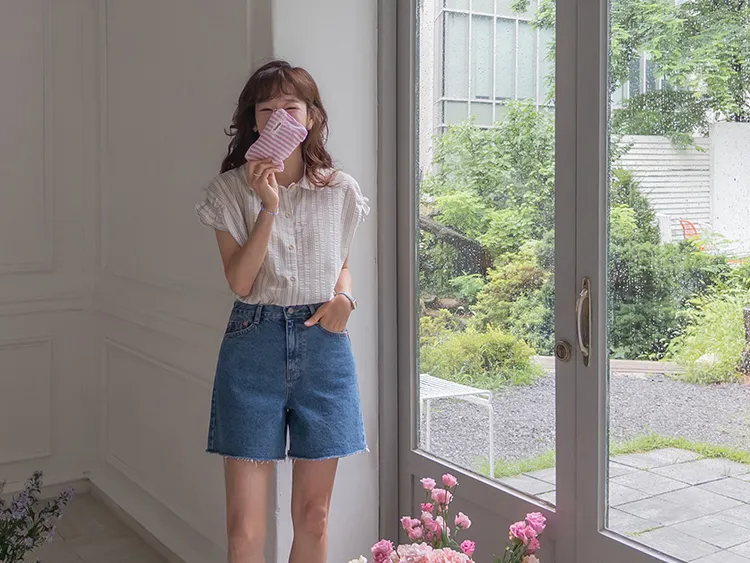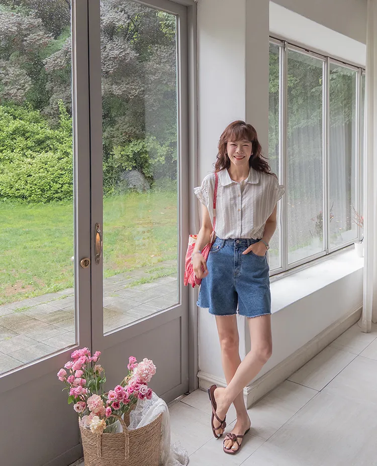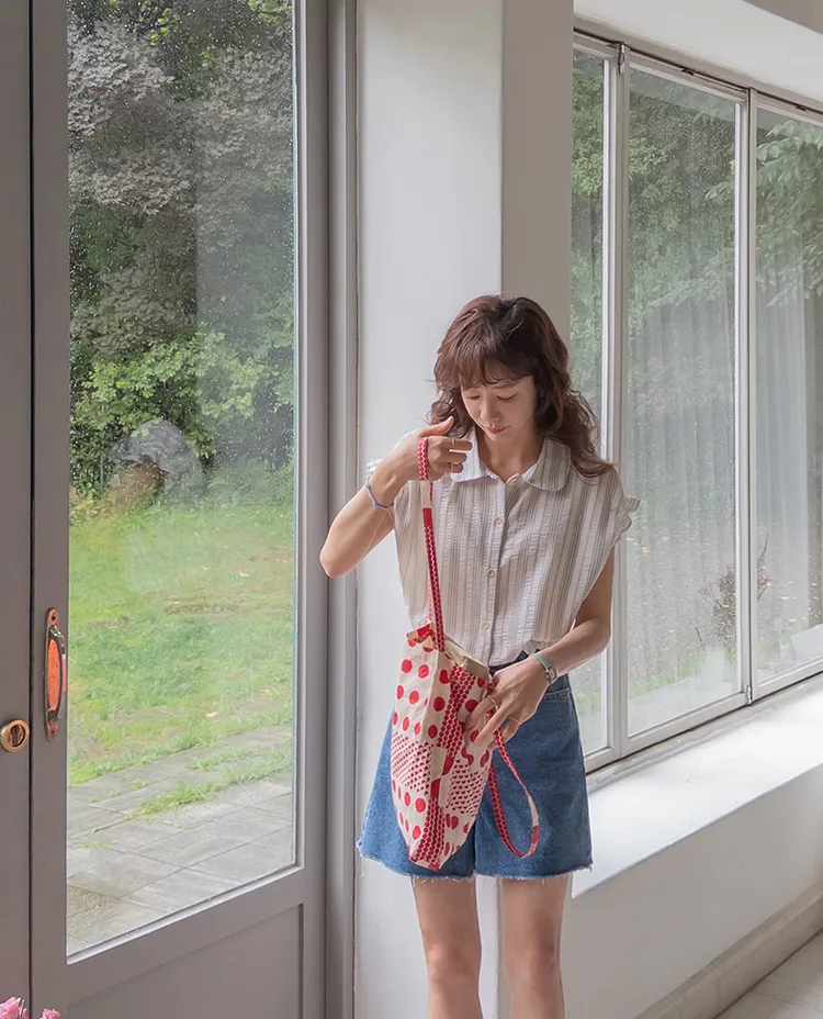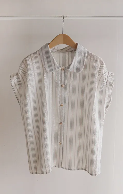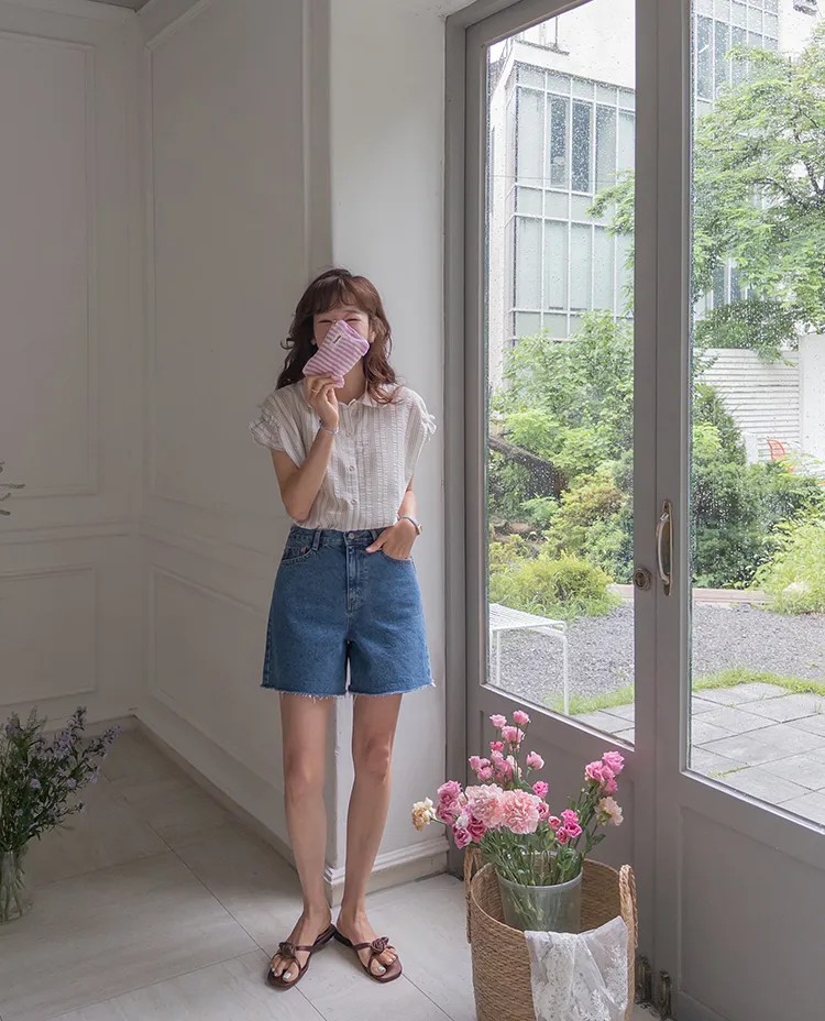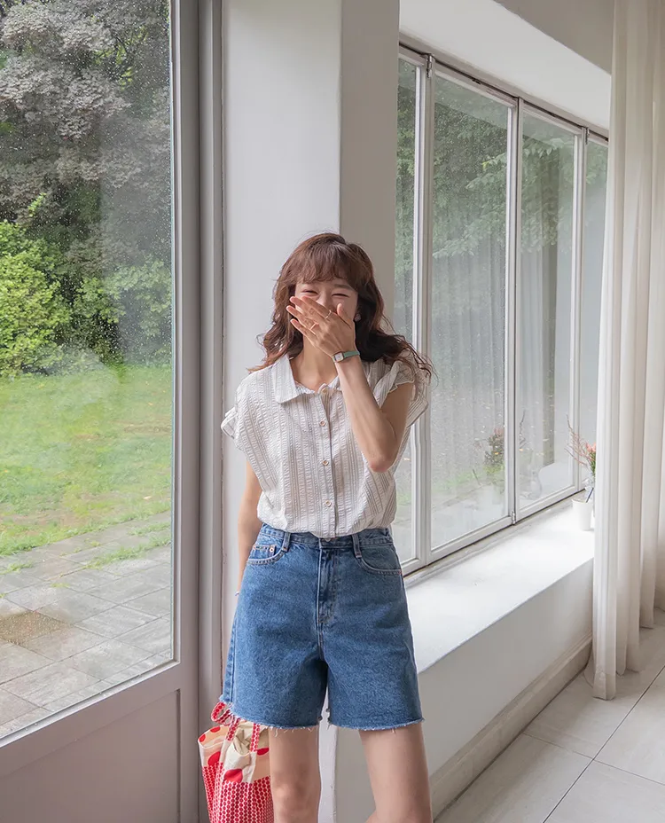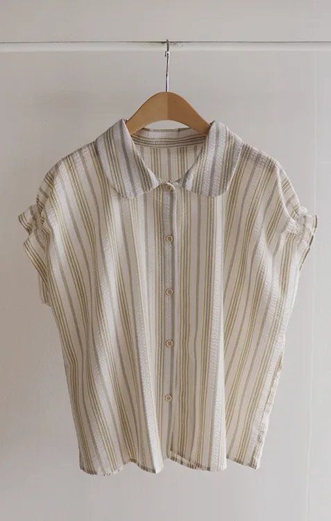 柔和條紋袖末摺邊飾帶立體感壓花排扣上衣