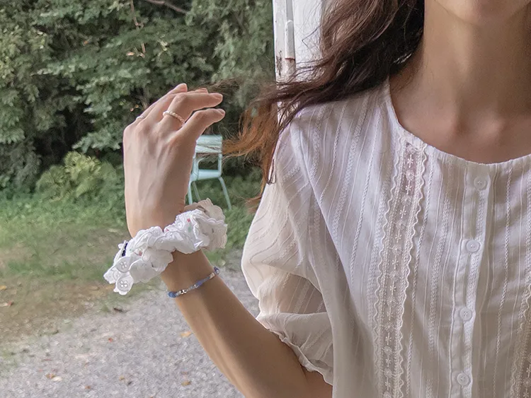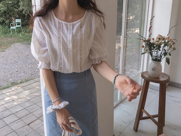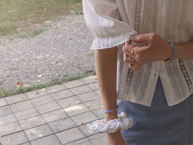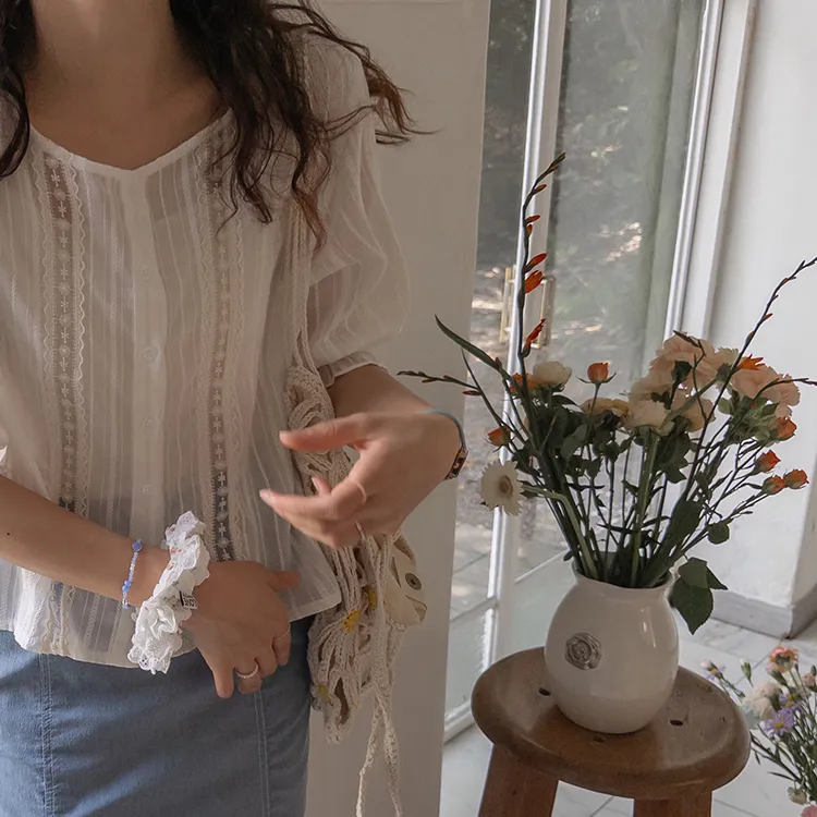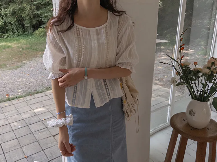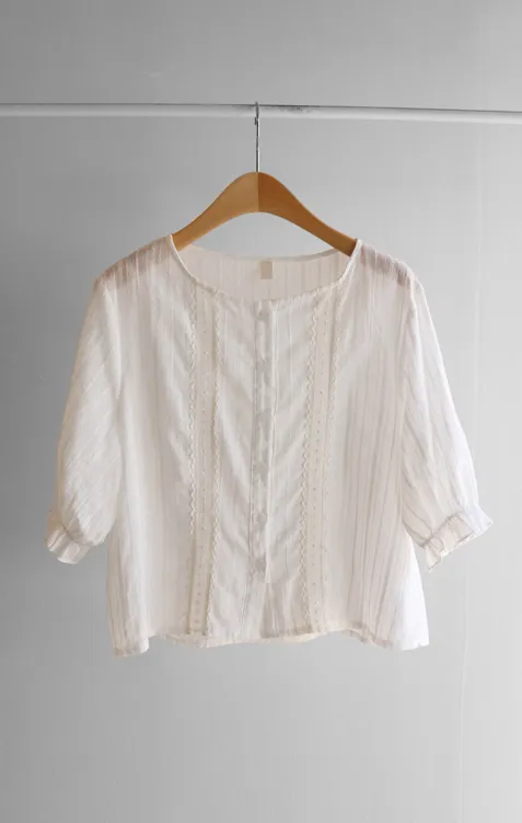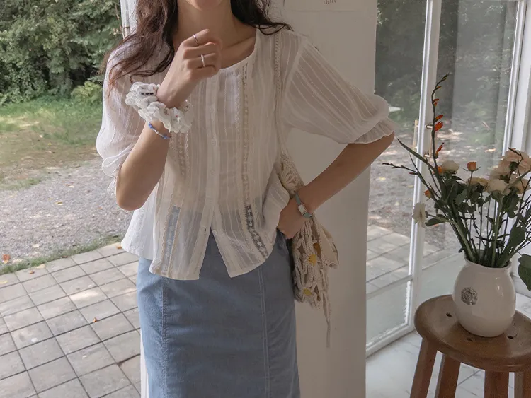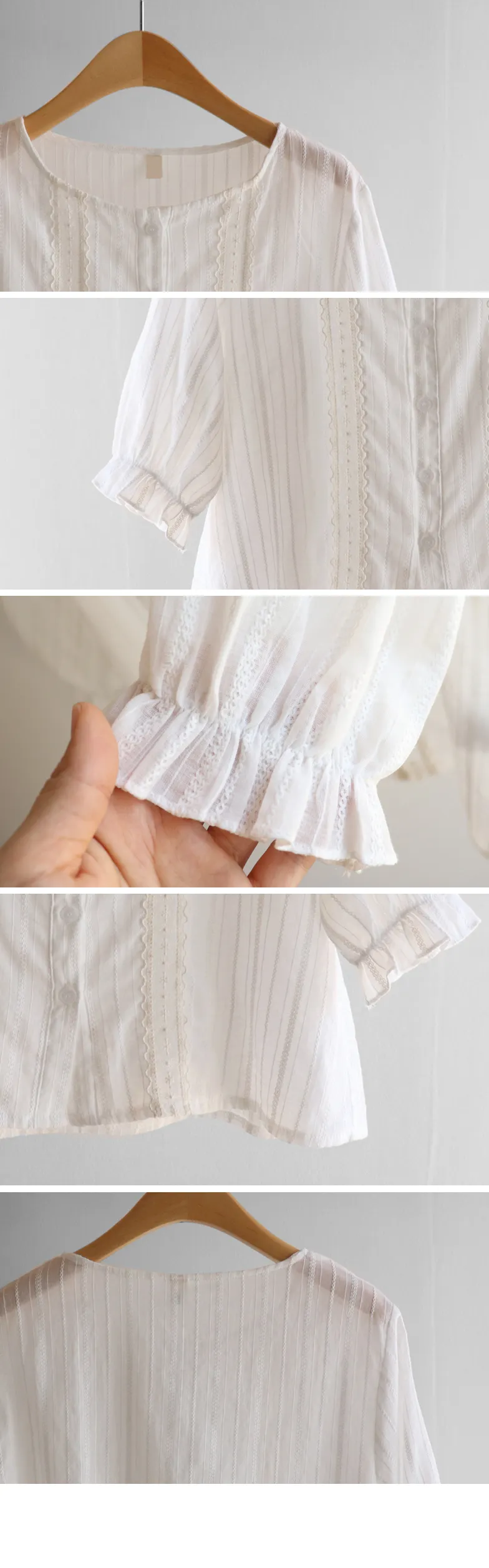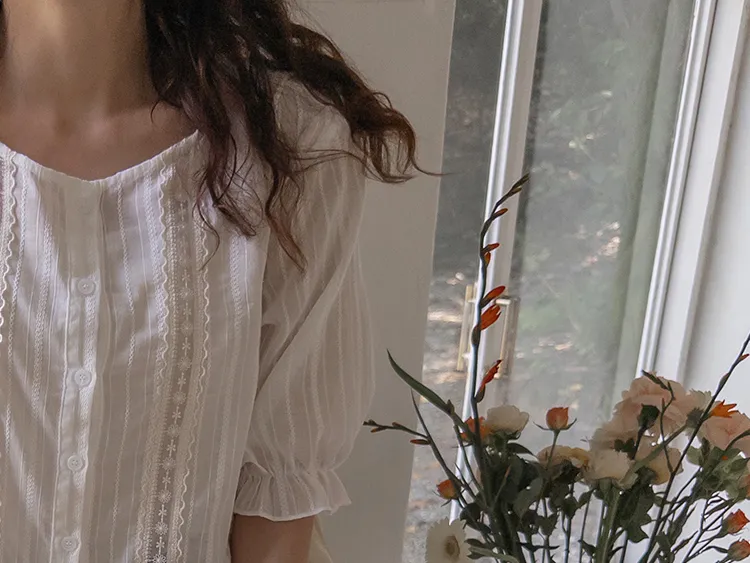 【精緻的蕾絲與浪漫的刺繡細節♥】【展現纖細身形的透膚排扣上衣】【輕盈清爽的棉質布料✿】【袖子修飾手臂線條~】