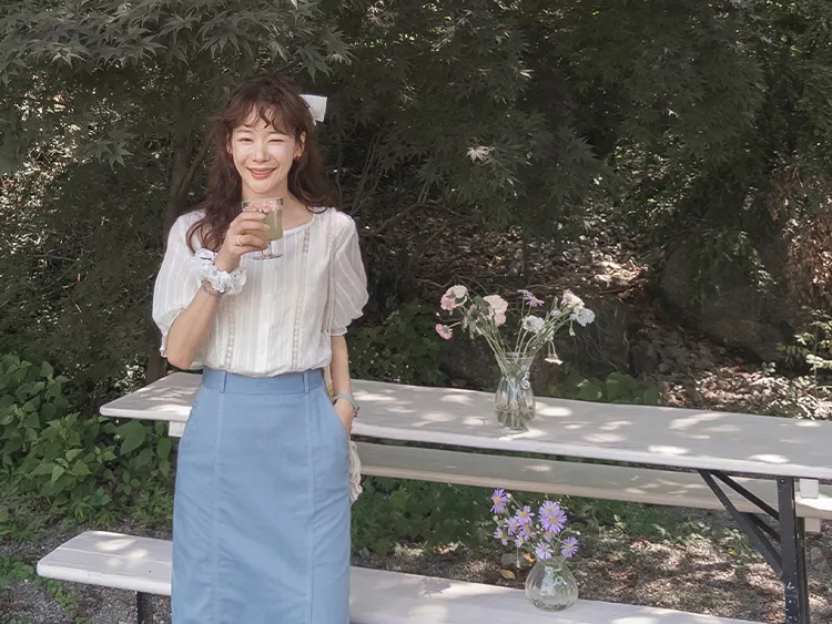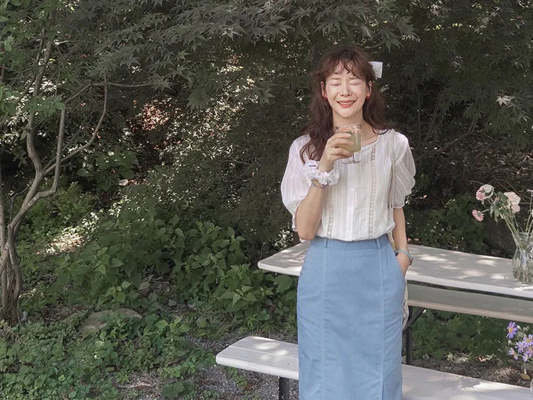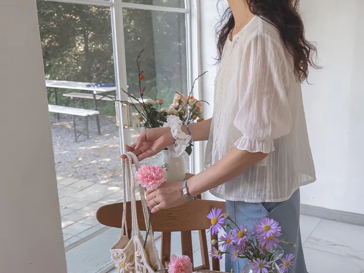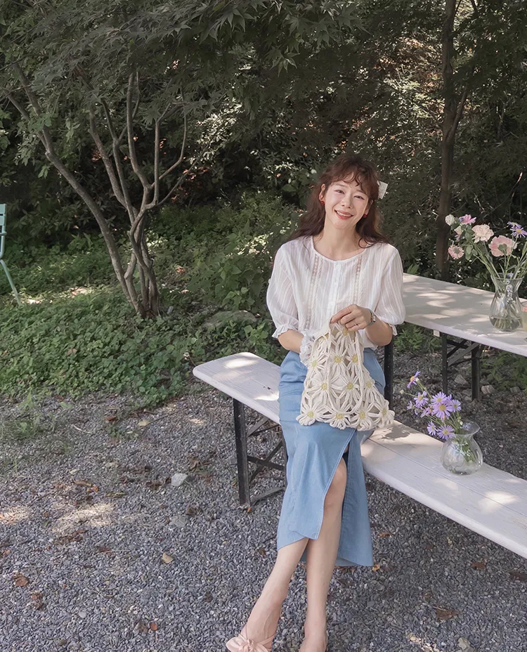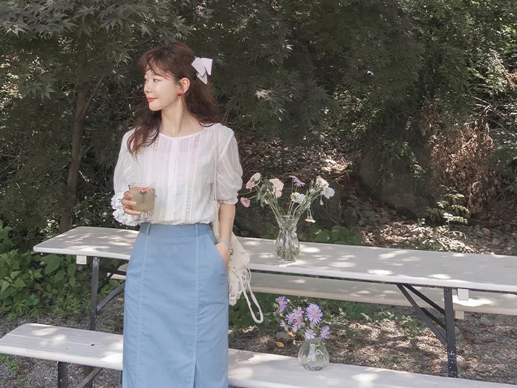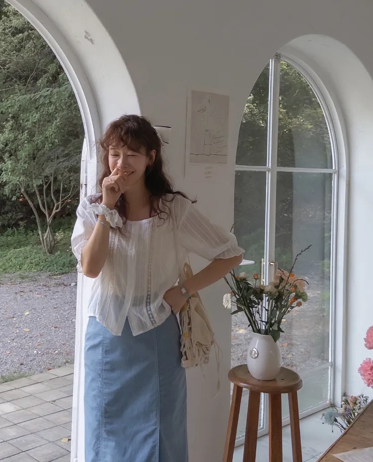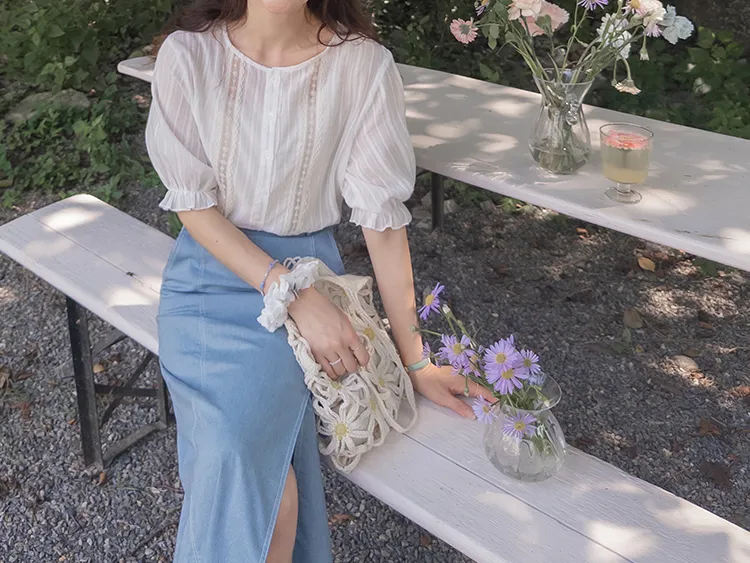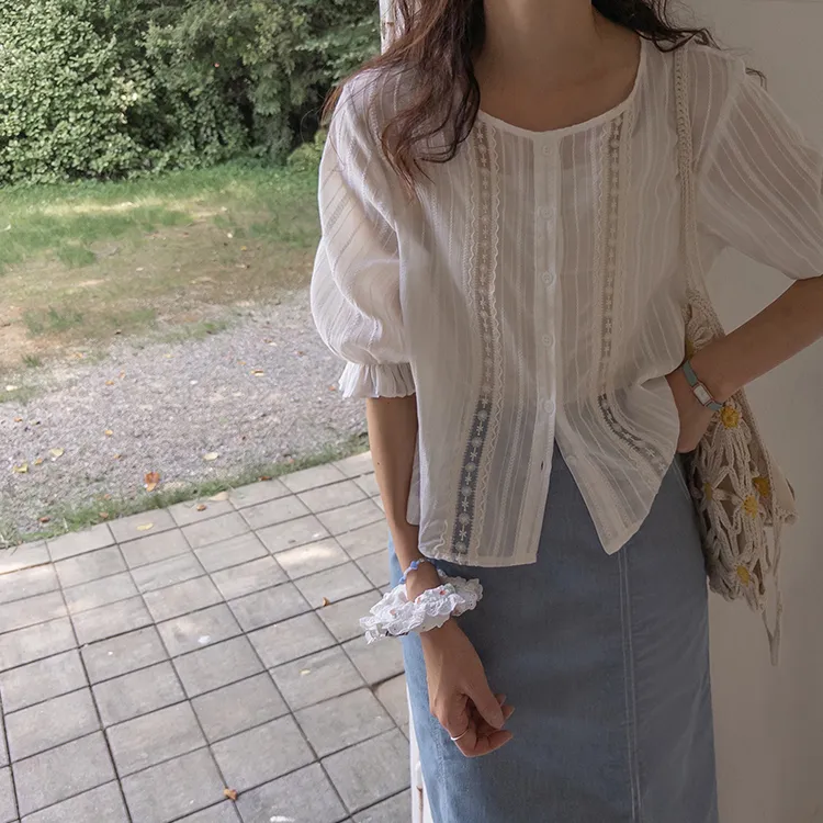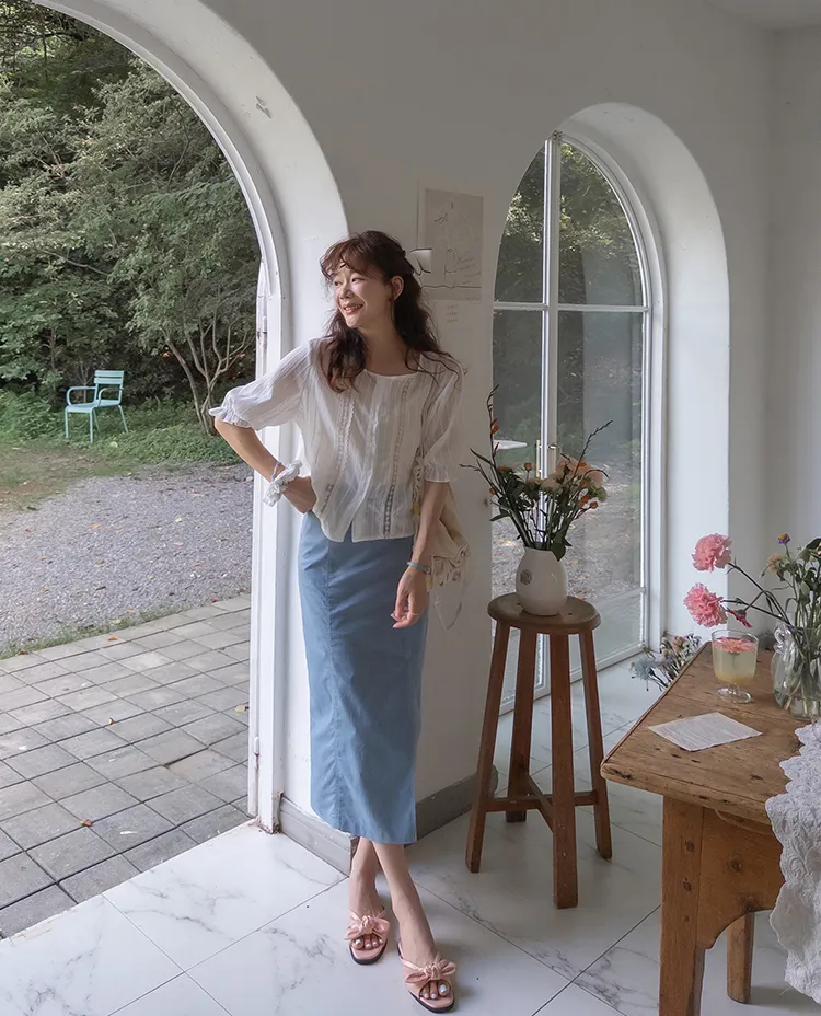 【精緻的蕾絲與浪漫的刺繡細節♥】【展現纖細身形的透膚排扣上衣】【輕盈清爽的棉質布料✿】【袖子修飾手臂線條~】