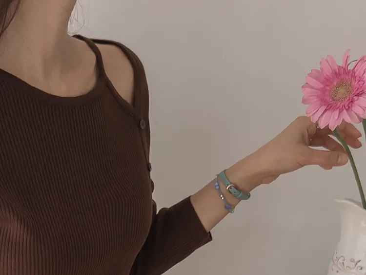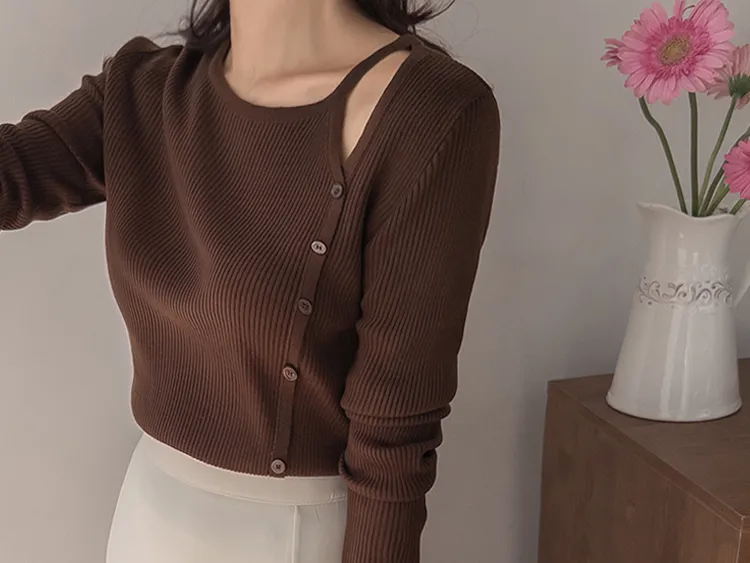 感性領側排扣開衩設計柔和羅紋修身上衣 現貨粉