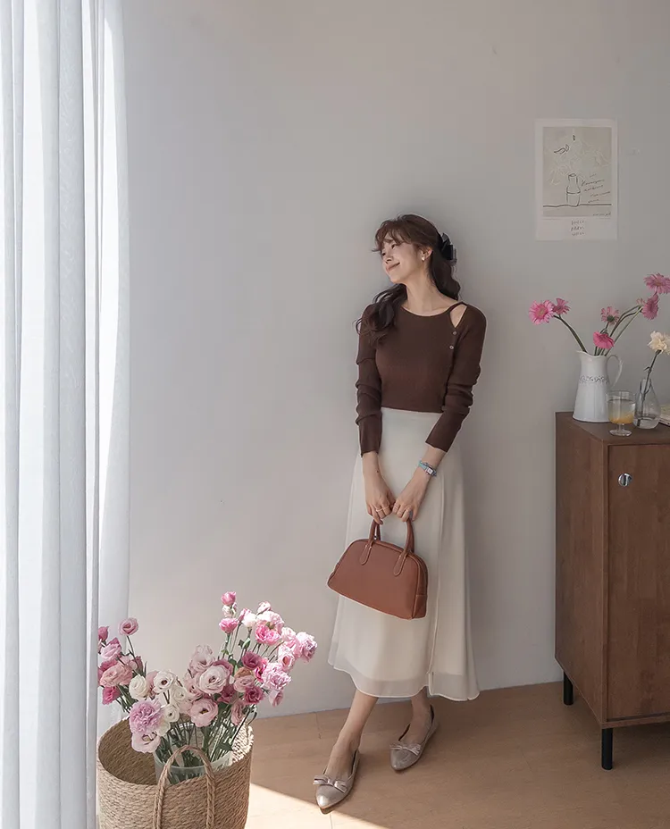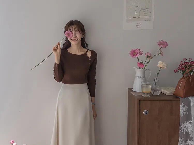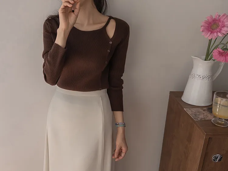 感性領側排扣開衩設計柔和羅紋修身上衣 現貨粉