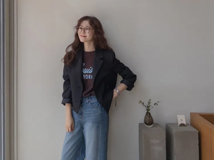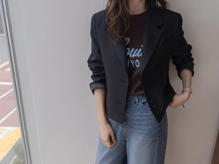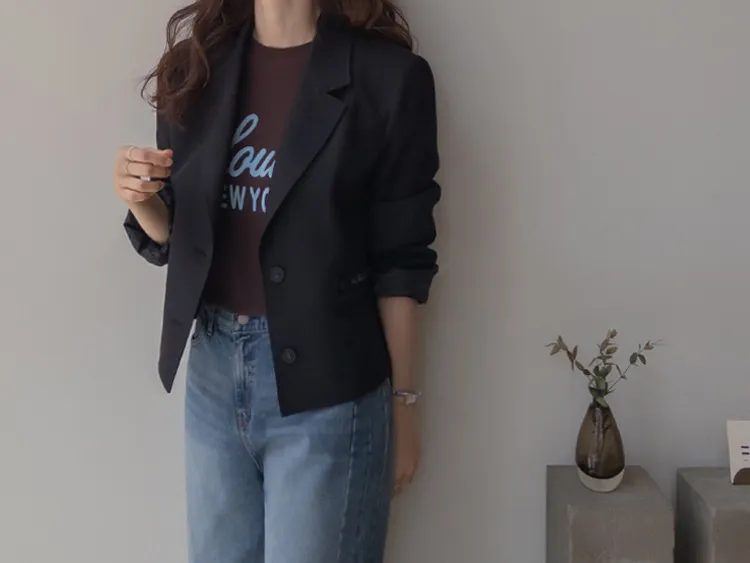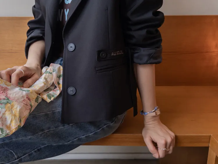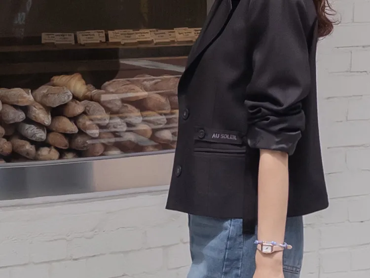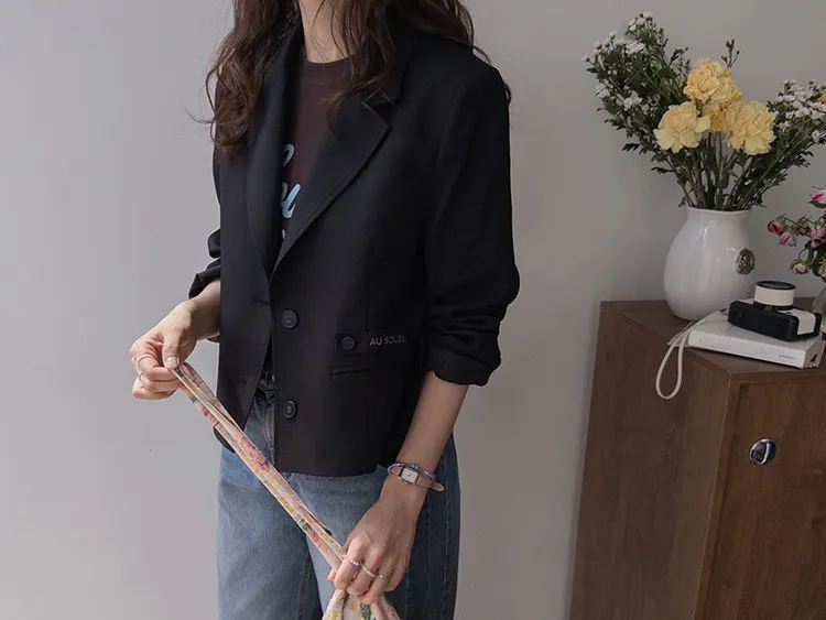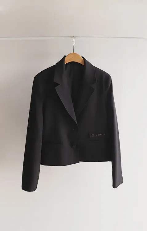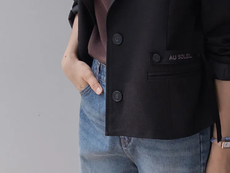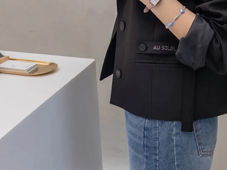 獨特風格刺繡字母扣帶點綴雙扣短款外套 現貨黑
