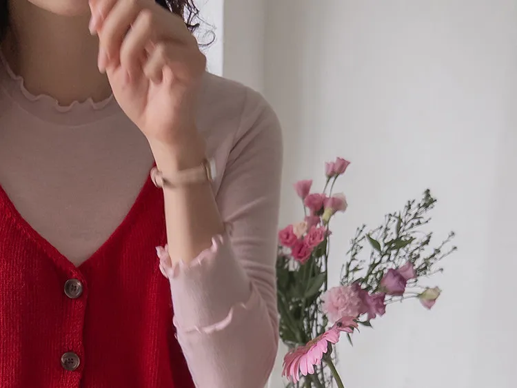 可愛波浪邊袖末層次柔軟彈性上衣 現貨粉色