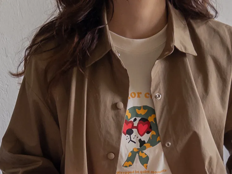 可愛帶圍巾小狗印花捲袖舒適短袖上衣