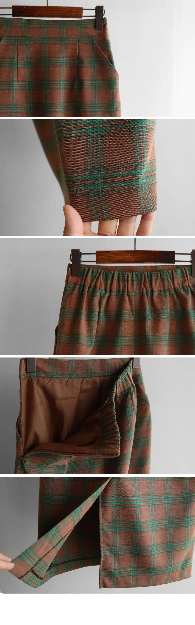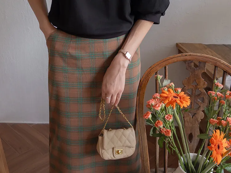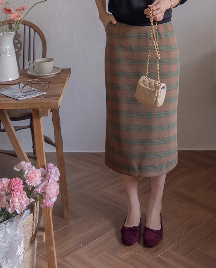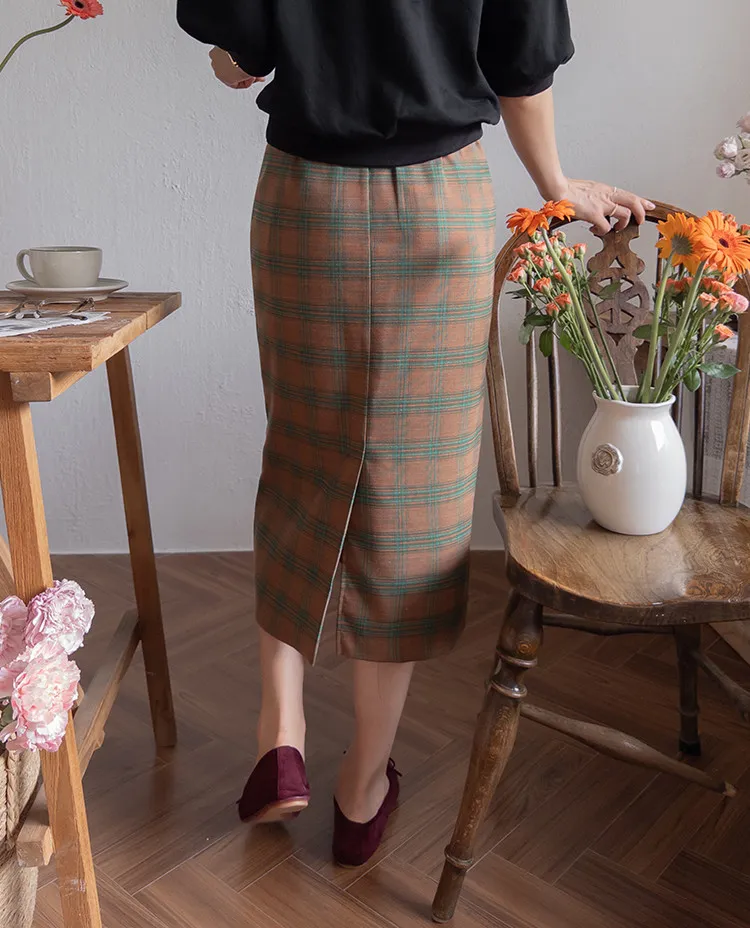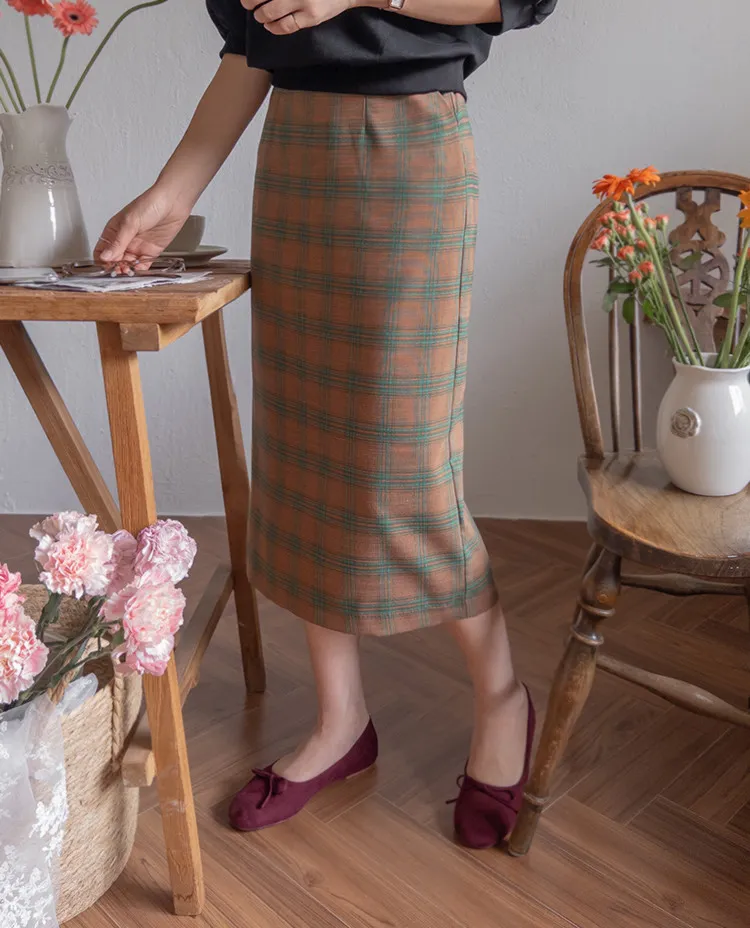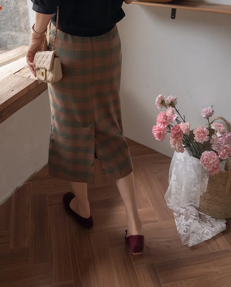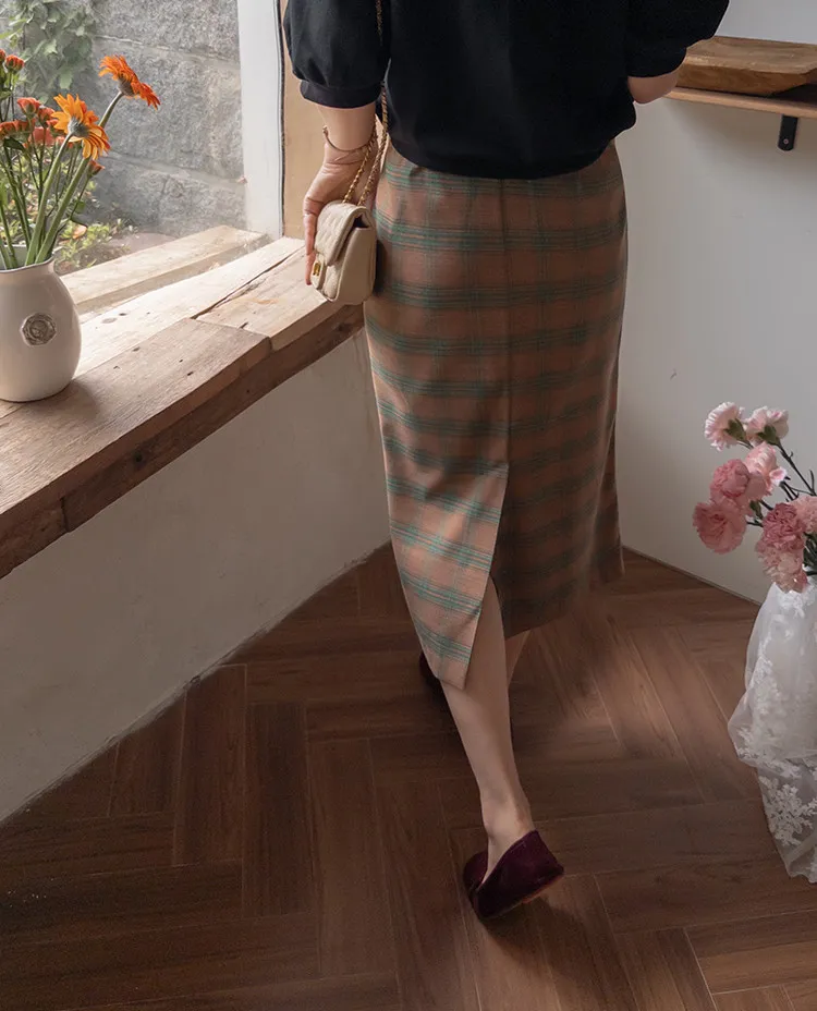 秋日氛圍色彩格紋H剪裁後開衩中長裙