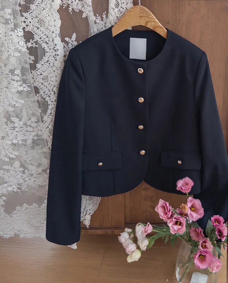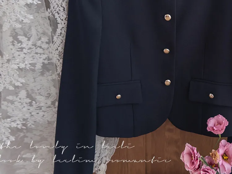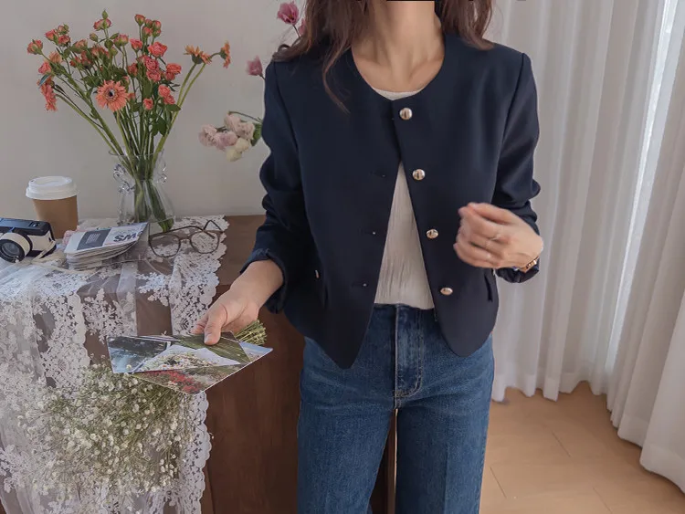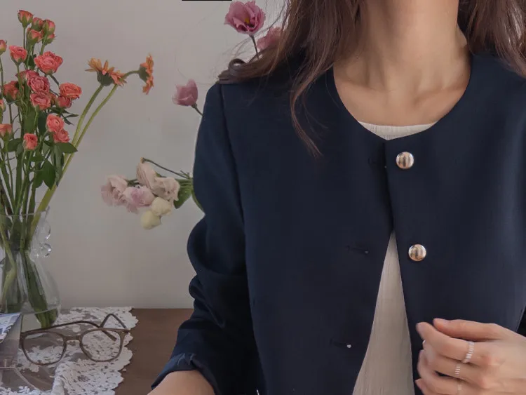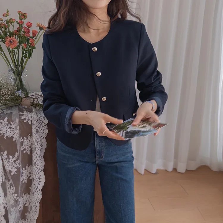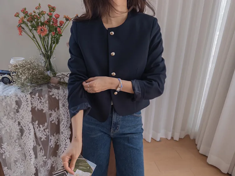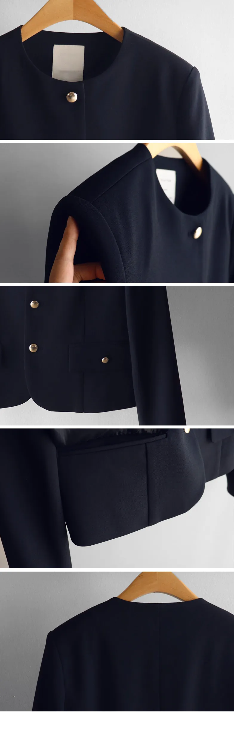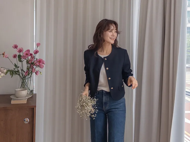 【簡約的無領設計,適合日常穿著! 】【奢華的金色鈕扣細節】【適合搭配裙子和褲子的長度! 】【圓潤的下擺剪裁更顯女人味♥】