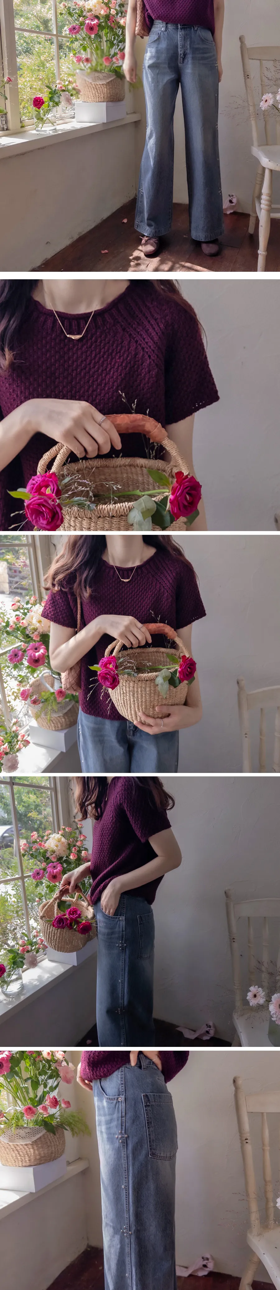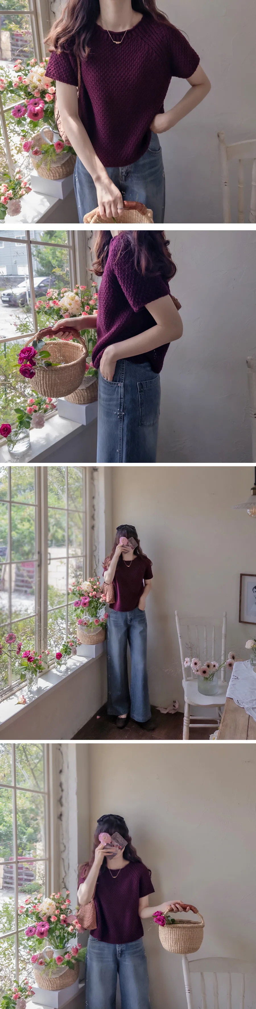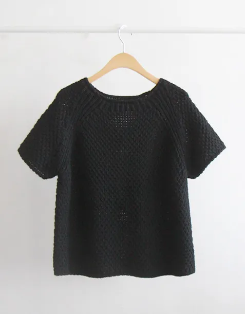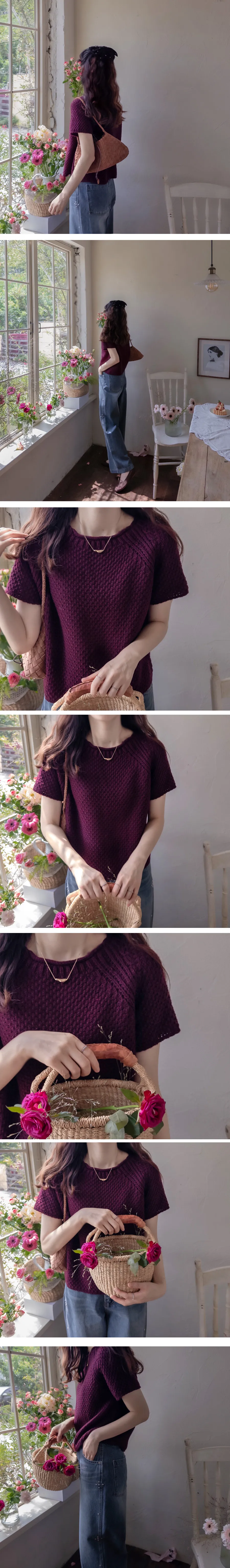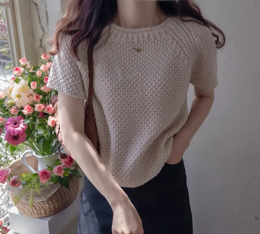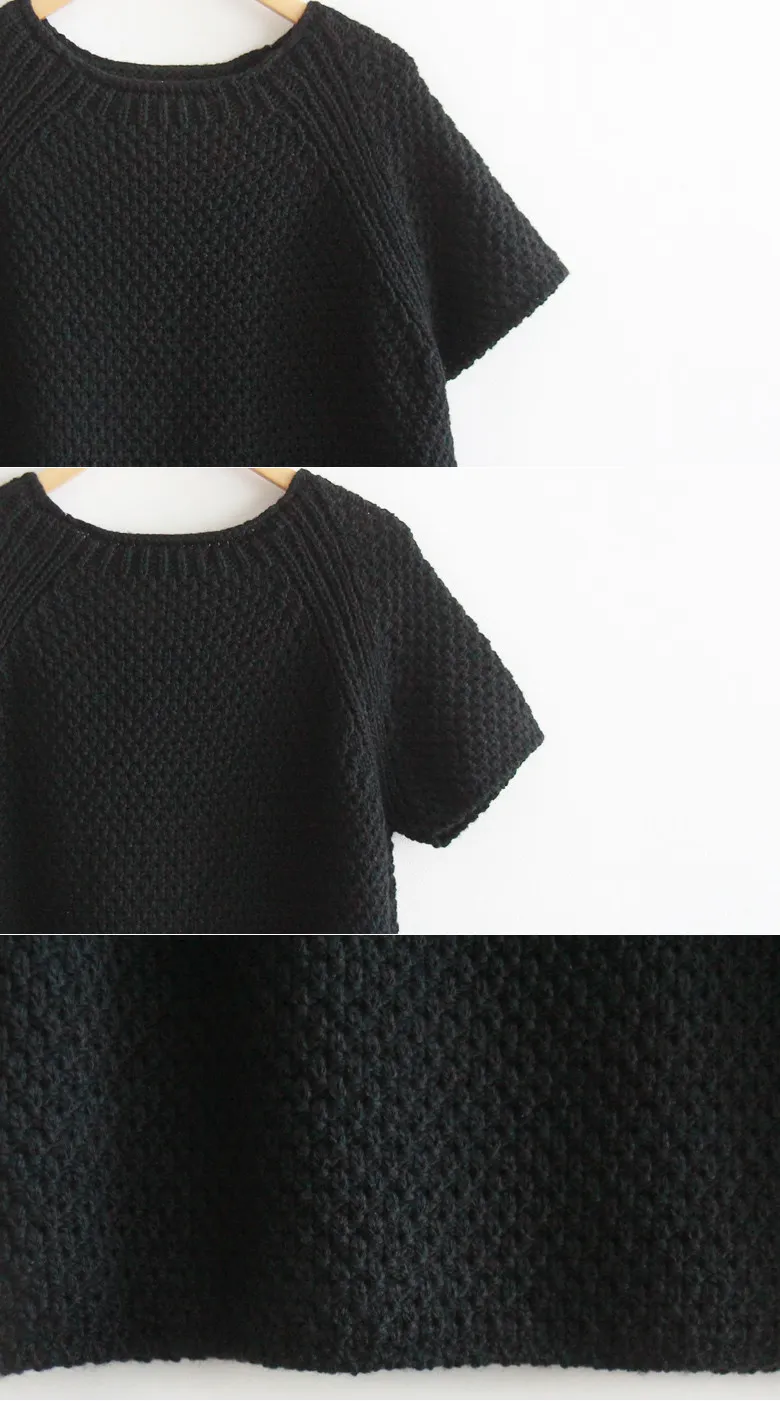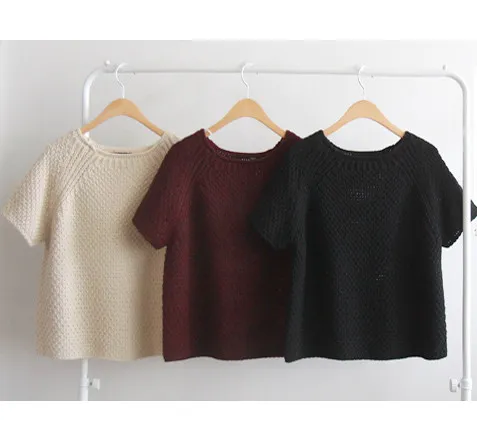 秋季純色圓領編織短袖針織上衣