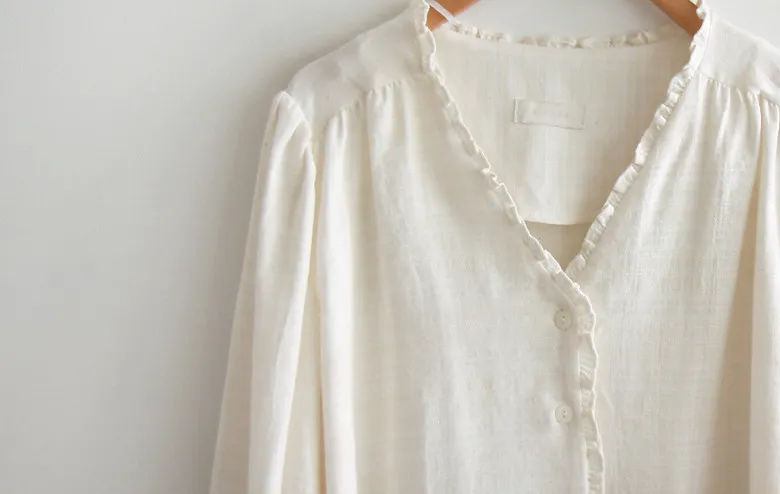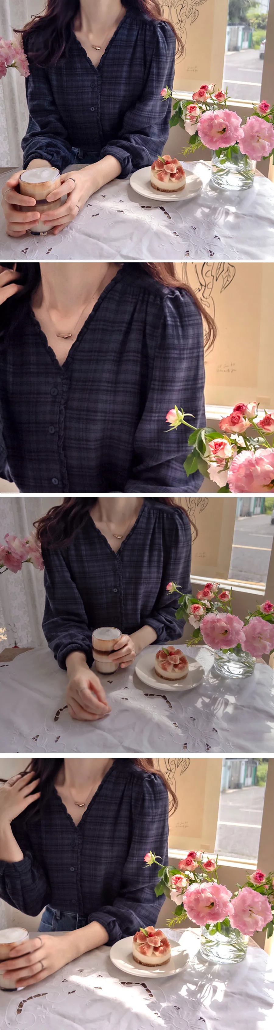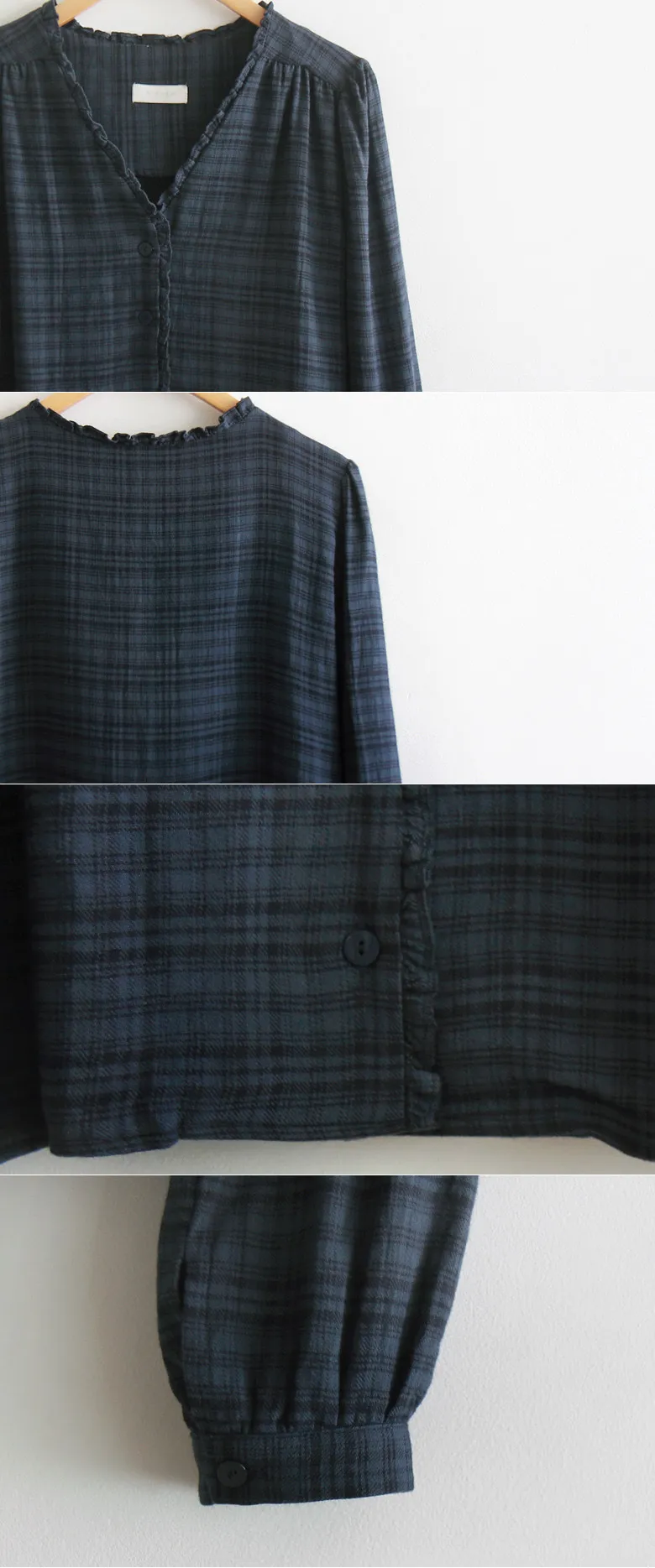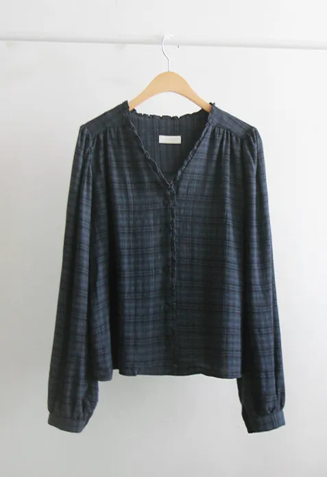 精緻優雅V領摺邊肩線褶皺剪裁格紋排扣上衣