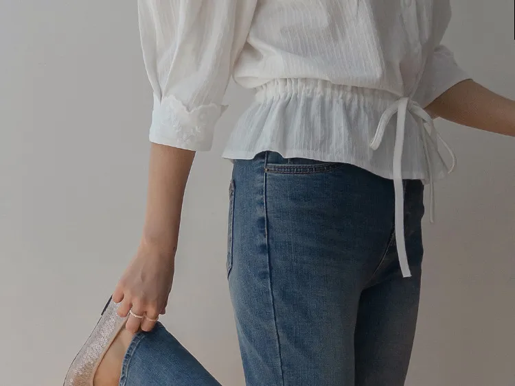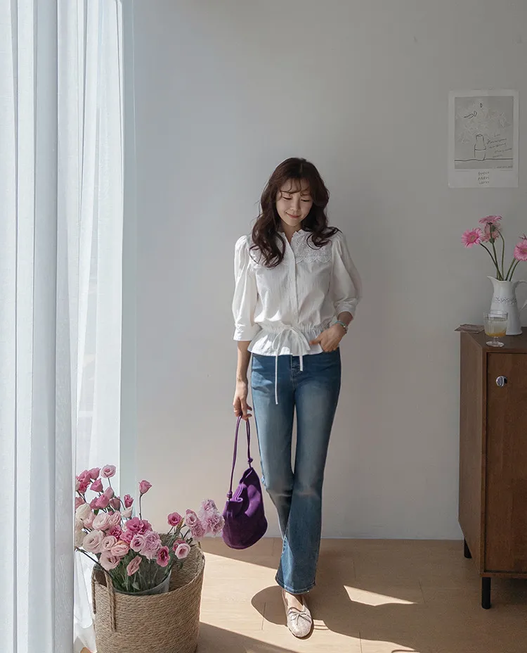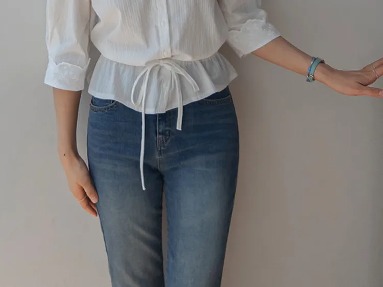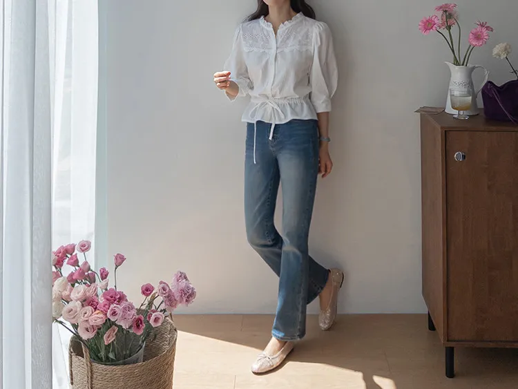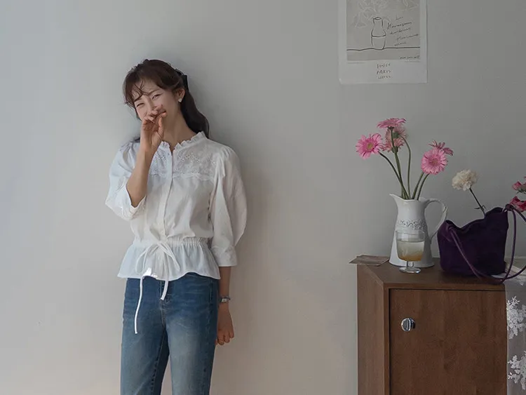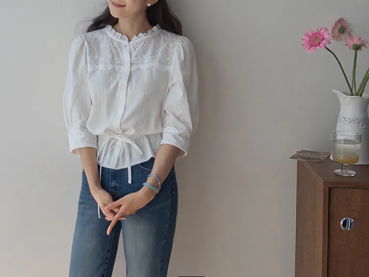 浪漫荷葉摺邊蕾絲花朵綁帶收腰排扣上衣