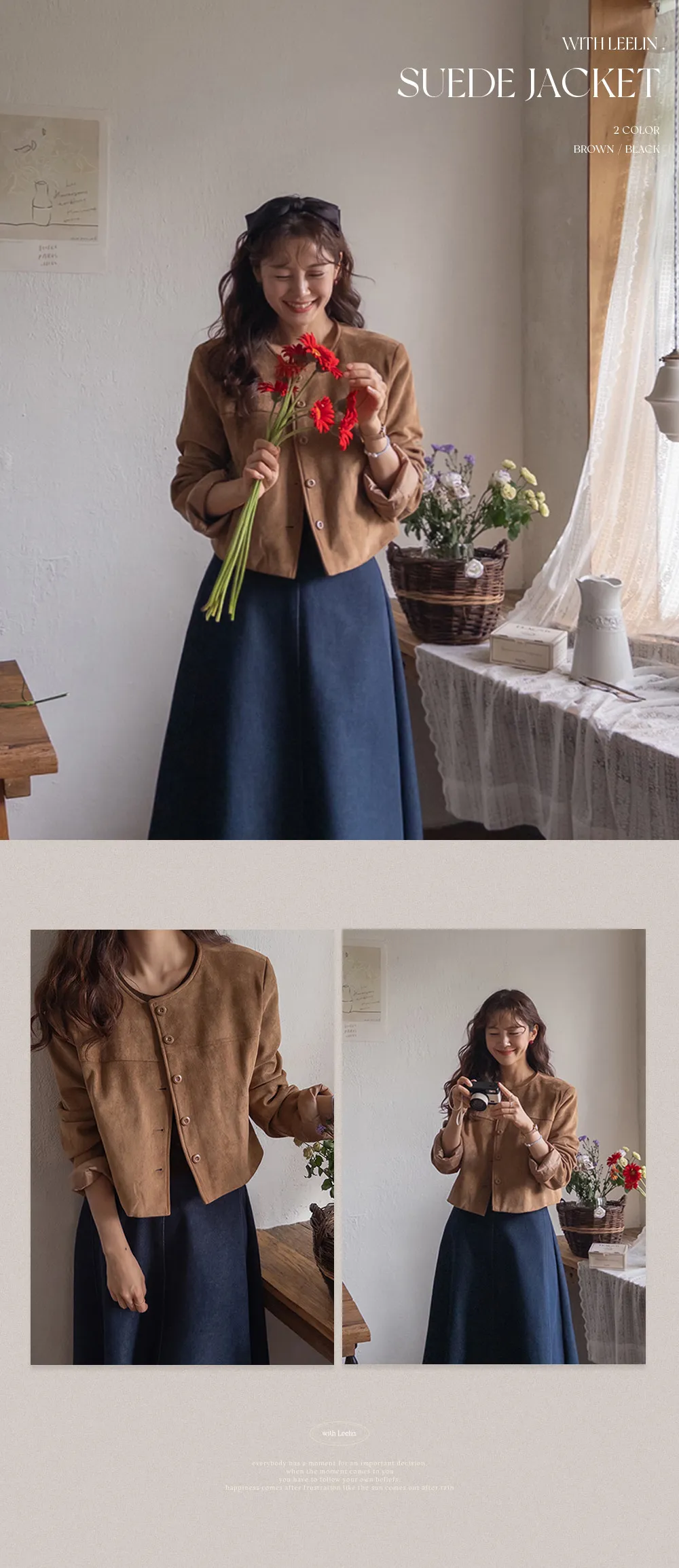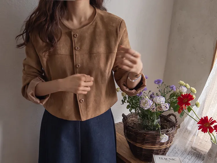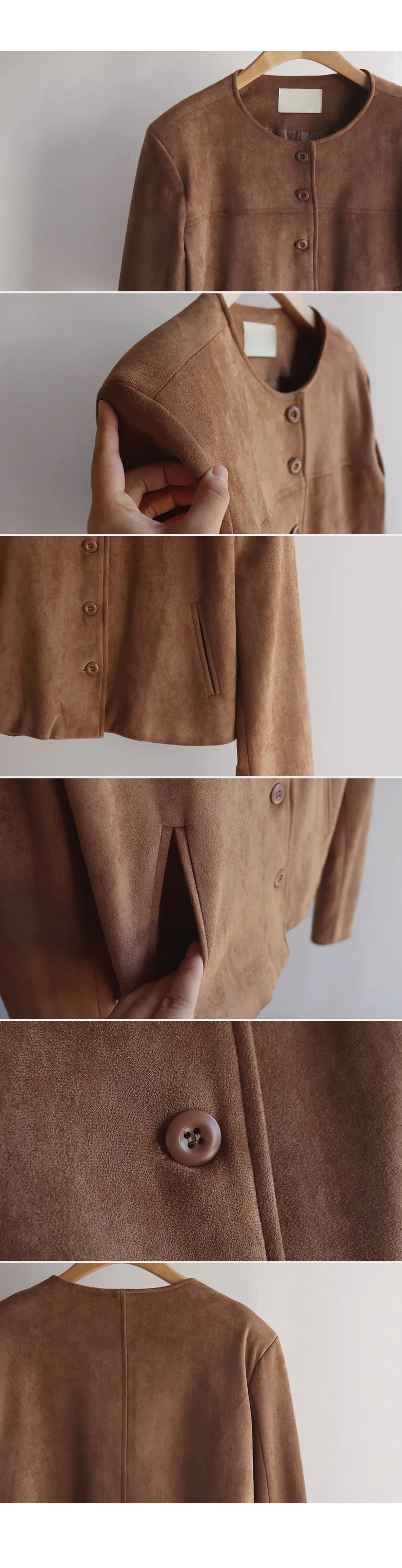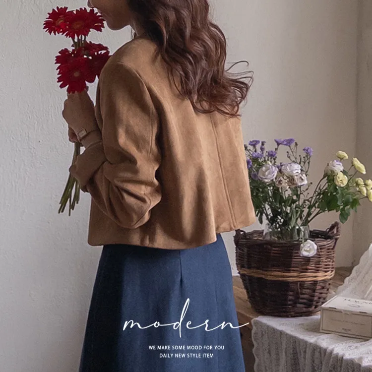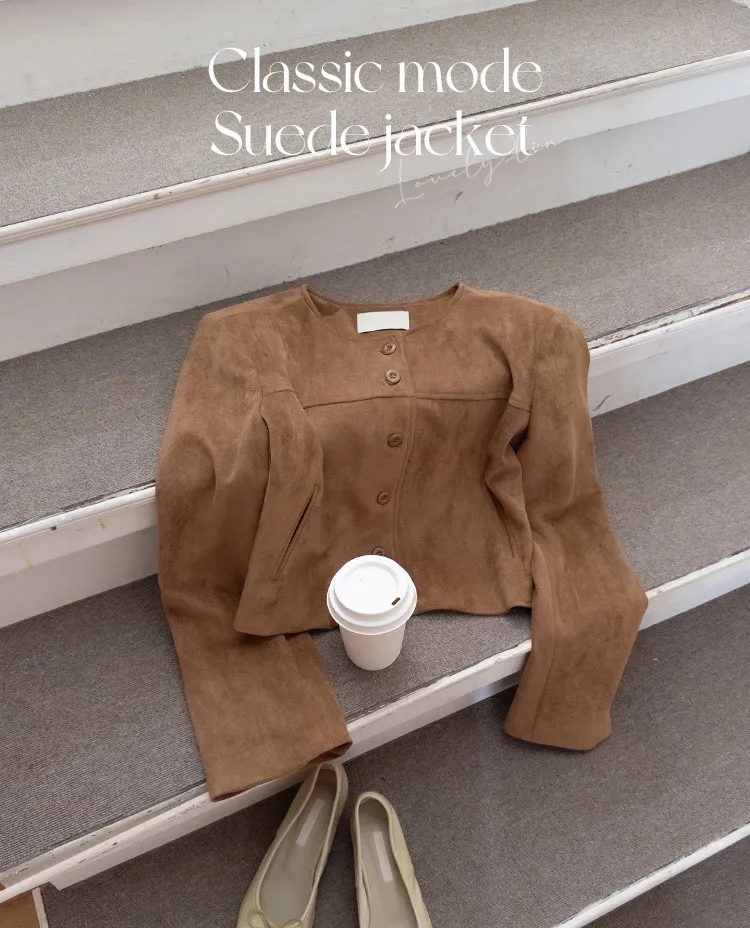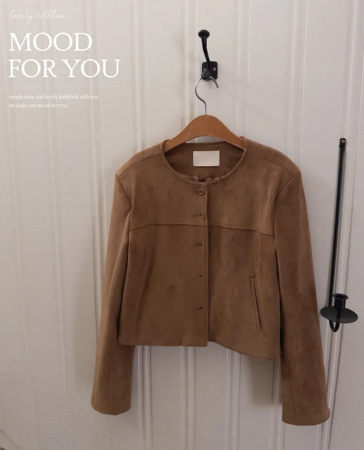 [柔軟麂皮的時尚外套♥] [短款長度,搭配裙子和褲子都很棒~] [無領圓領的日常穿著~] [柔軟的材質,穿著舒適^^]