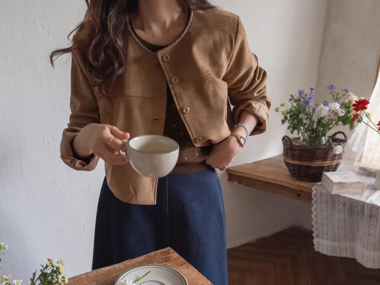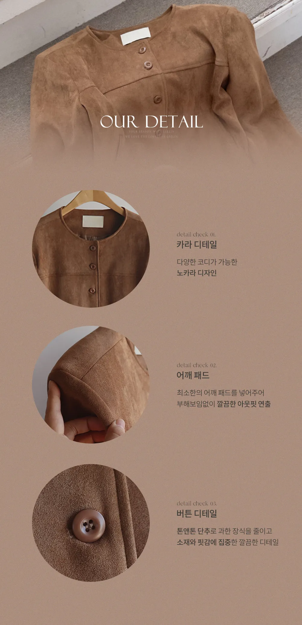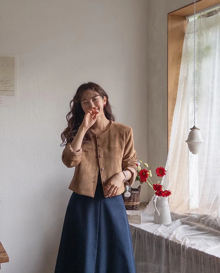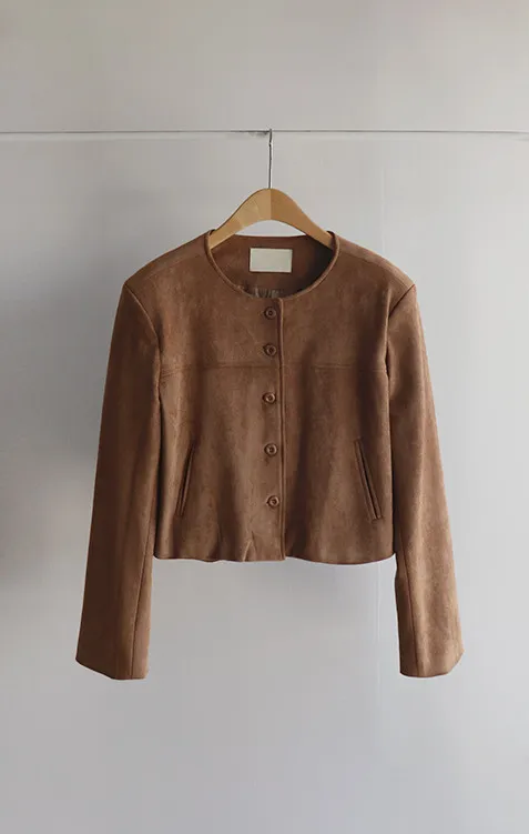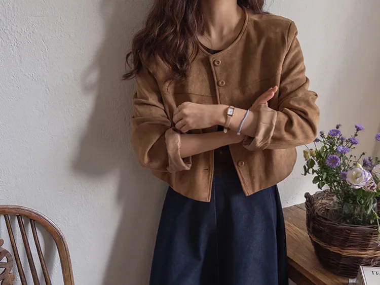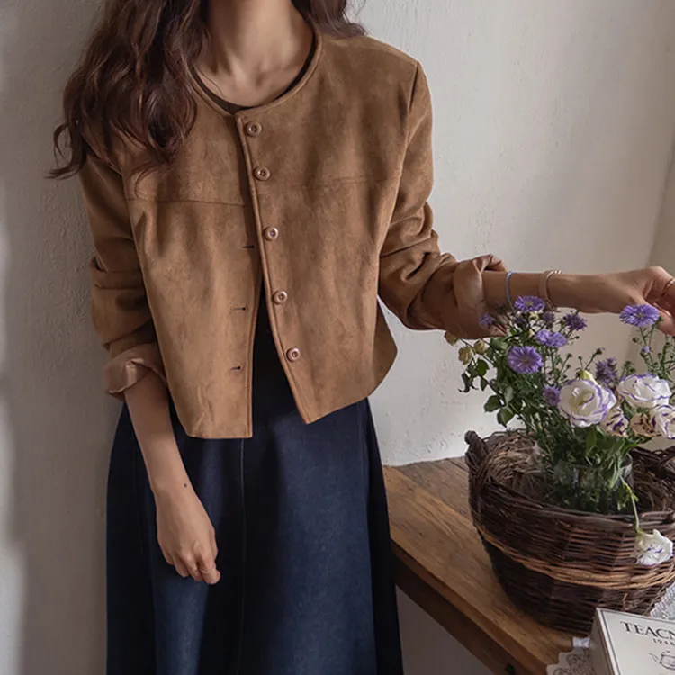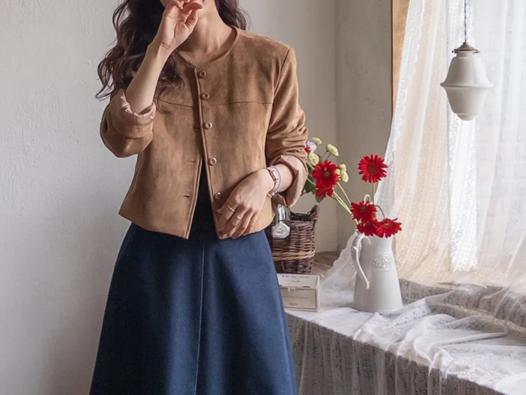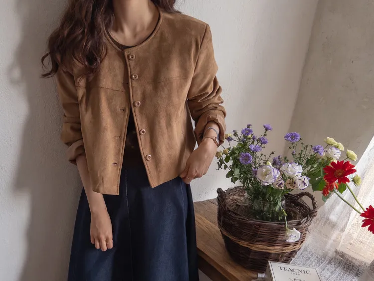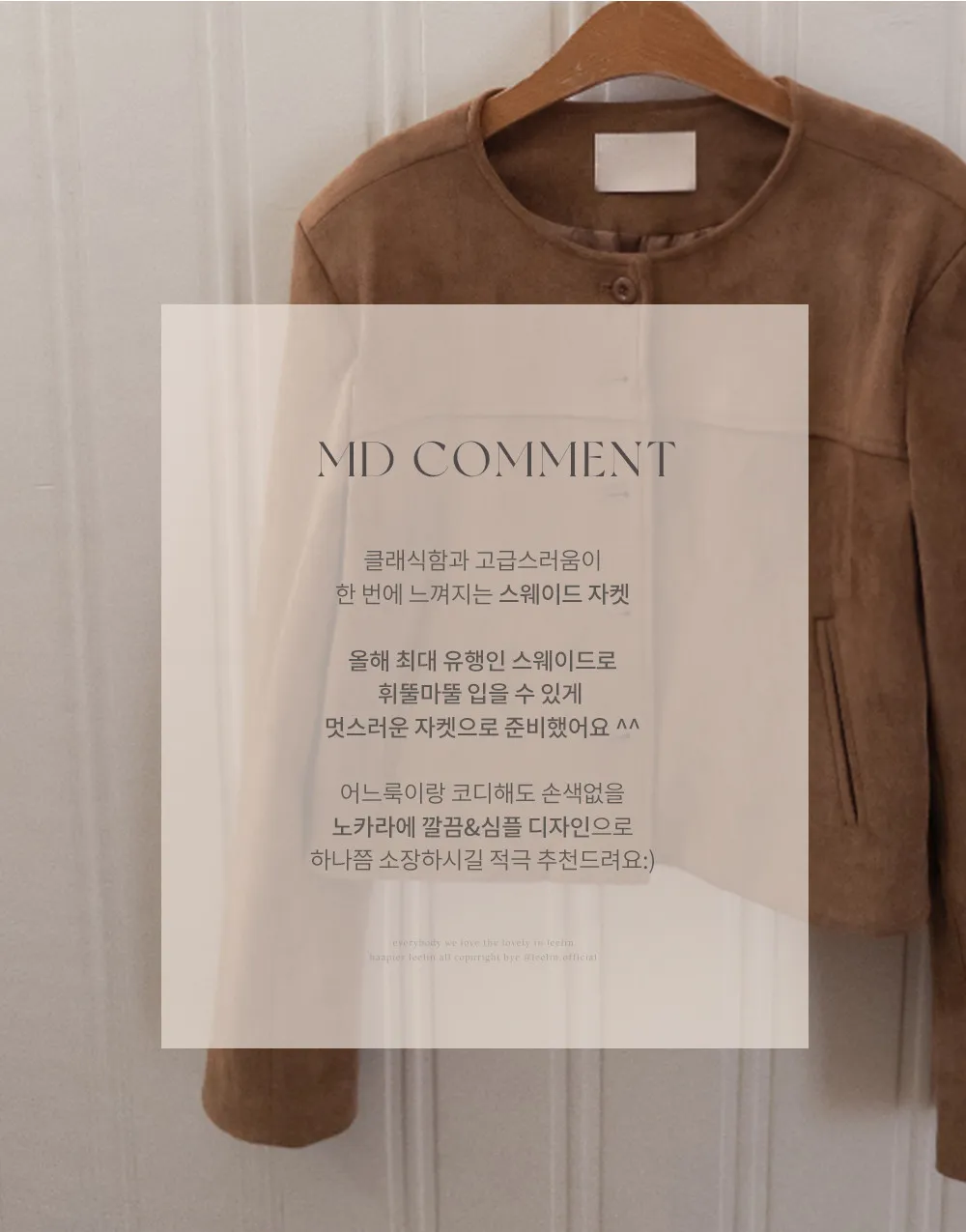 [柔軟麂皮的時尚外套♥] [短款長度,搭配裙子和褲子都很棒~] [無領圓領的日常穿著~] [柔軟的材質,穿著舒適^^]