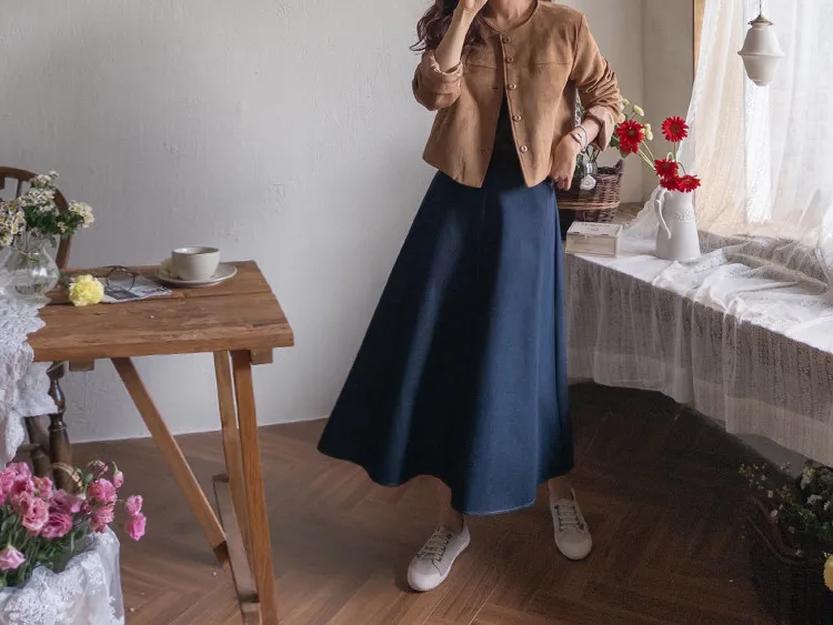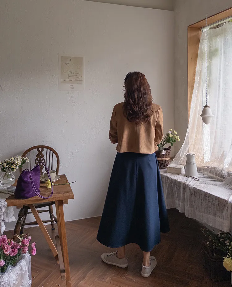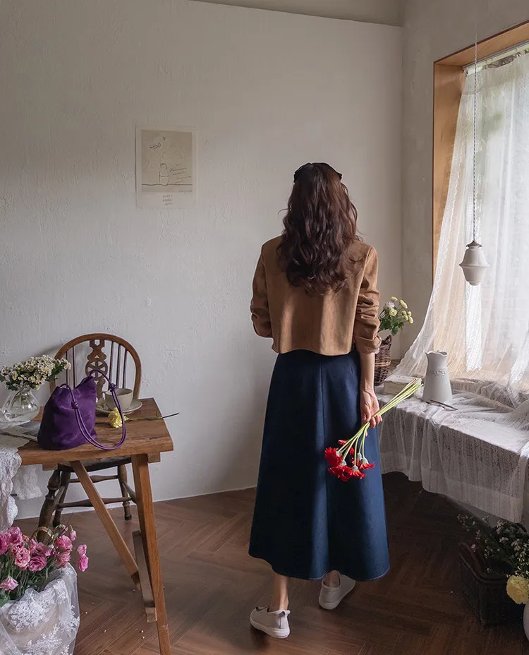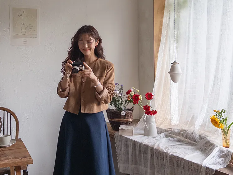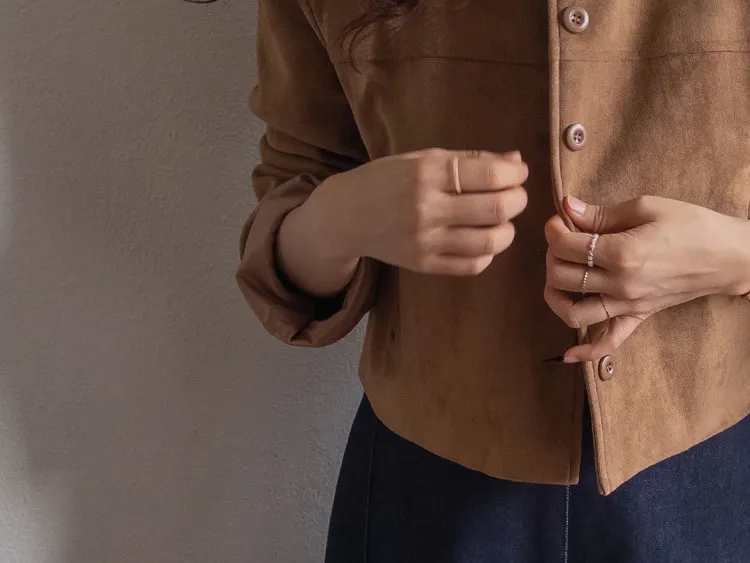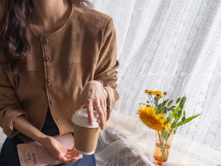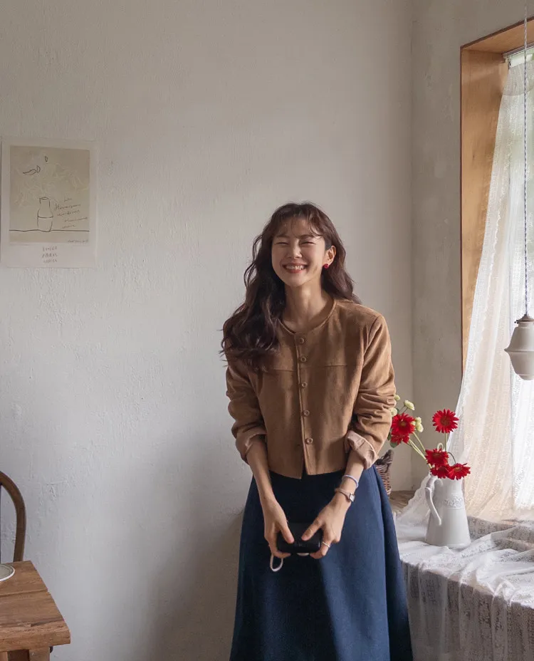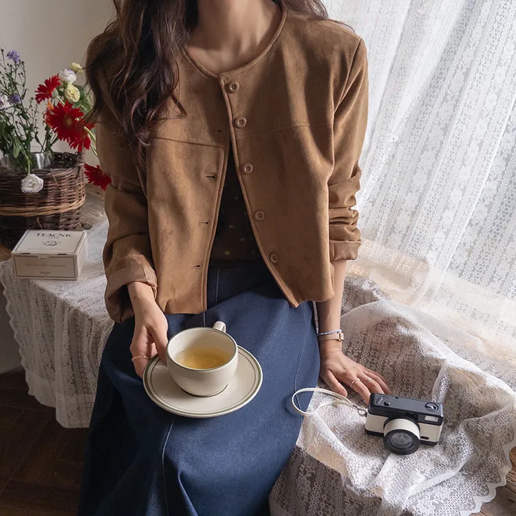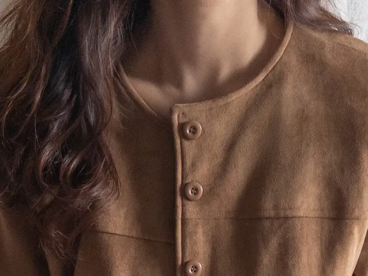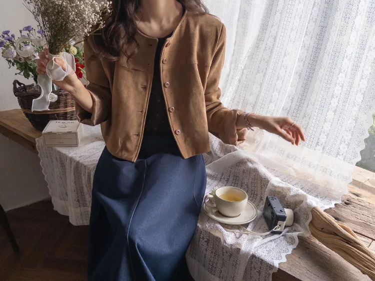 [柔軟麂皮的時尚外套♥] [短款長度,搭配裙子和褲子都很棒~] [無領圓領的日常穿著~] [柔軟的材質,穿著舒適^^]