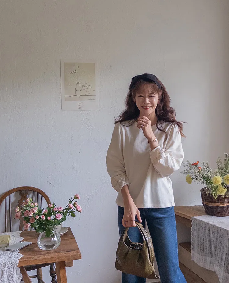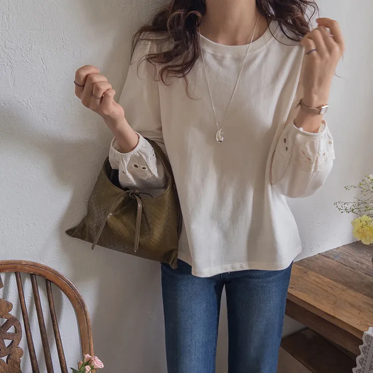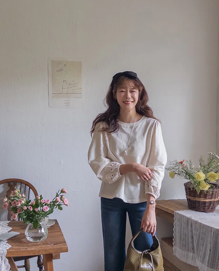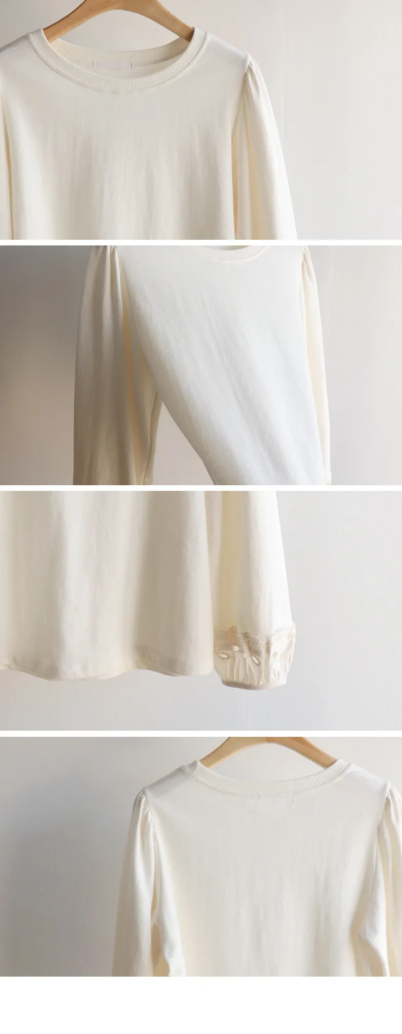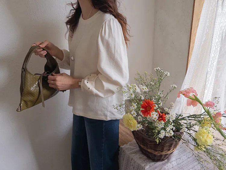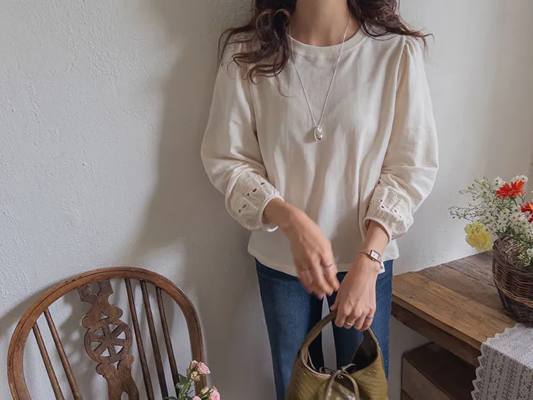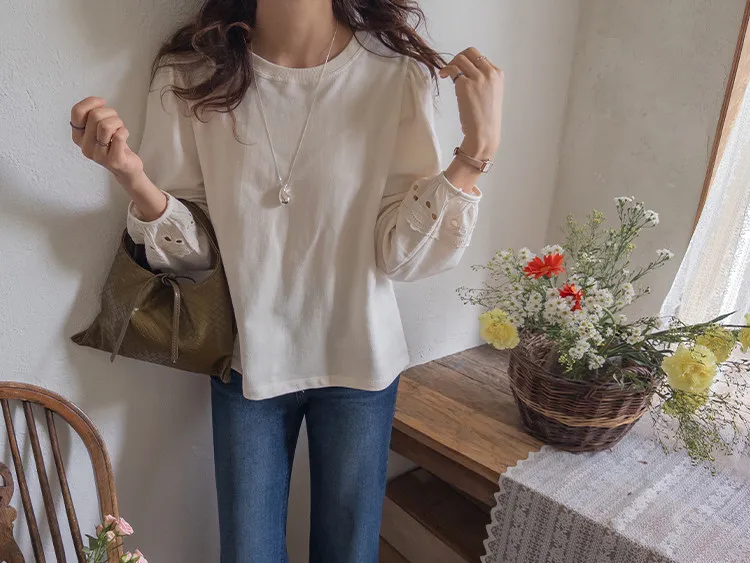 【蝴蝶結鏤空袖子很可愛♥】 【泡泡袖和肩部褶皺設計,增添立體感~】 【厚實的棉質面料,厚度適中】 【適合各種服裝的基本款】