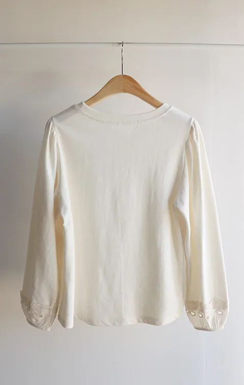 可愛袖末蝴蝶結刺繡鏤空花邊肩線褶皺剪裁上衣