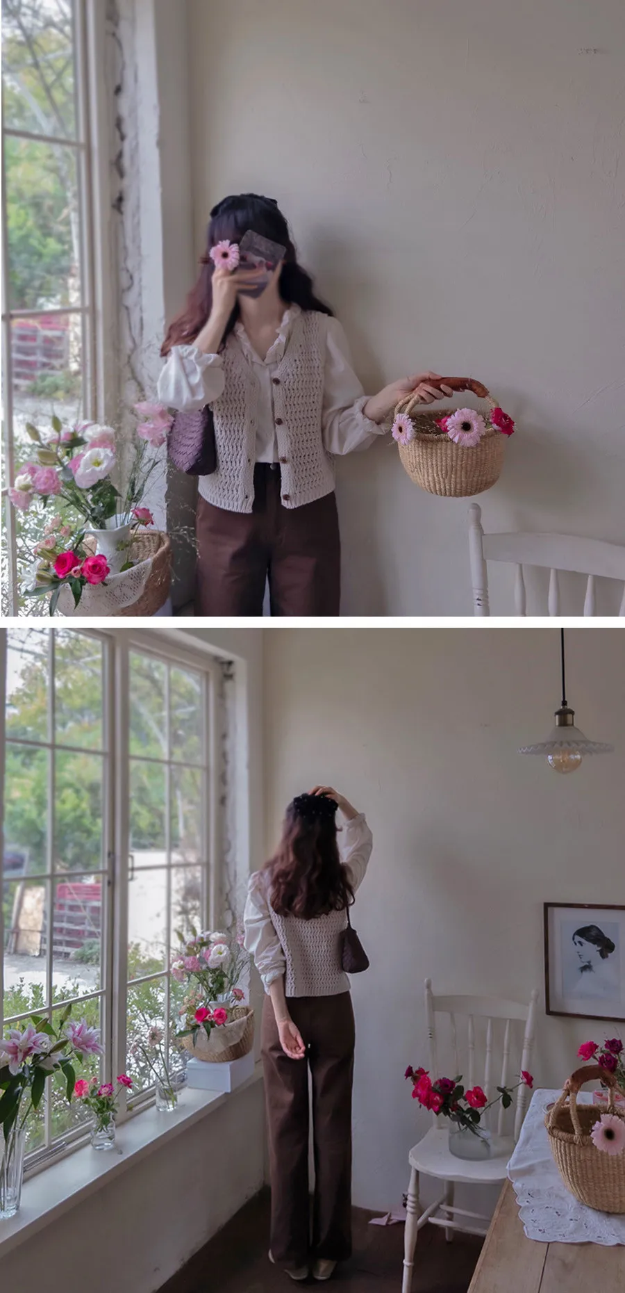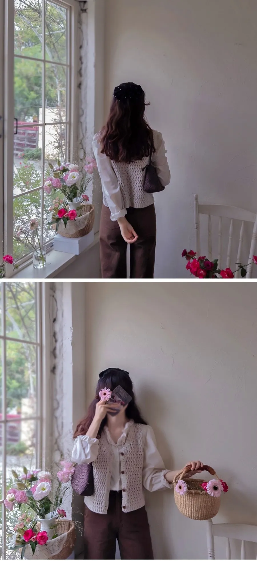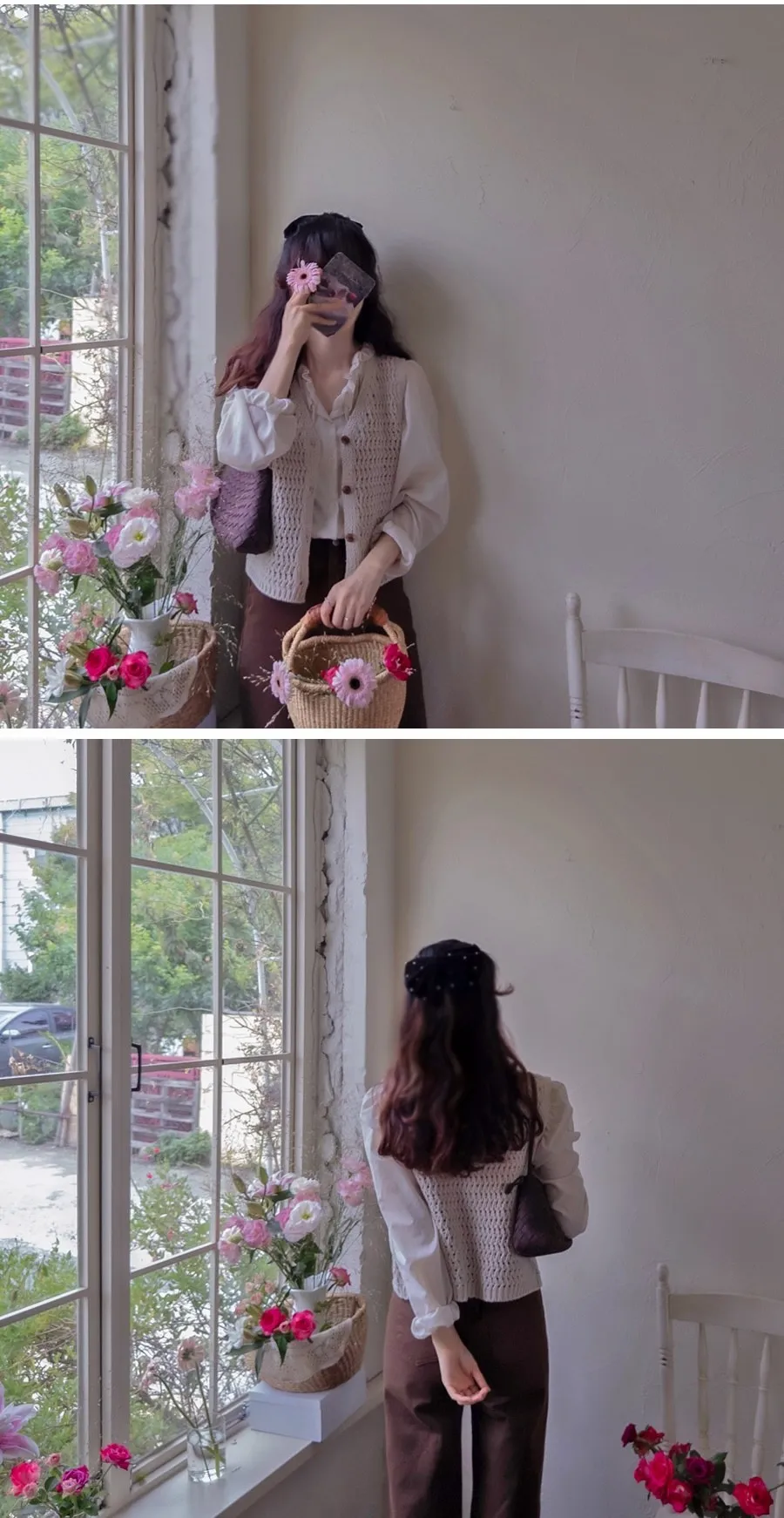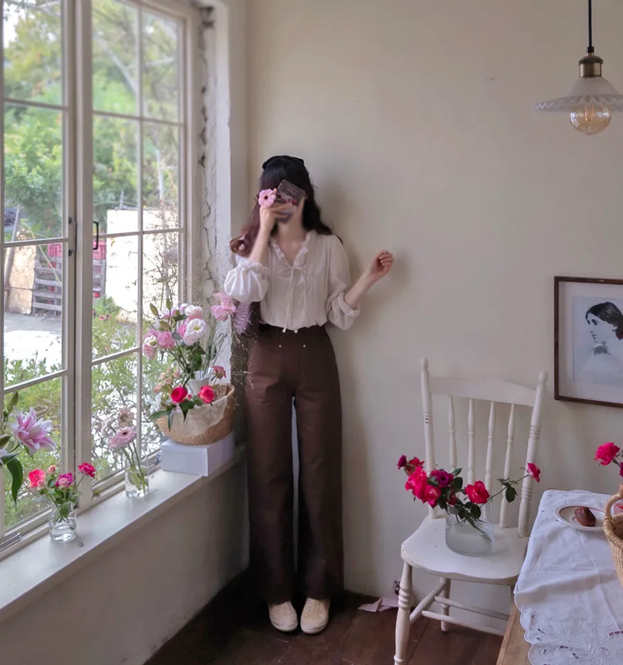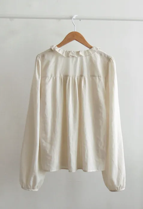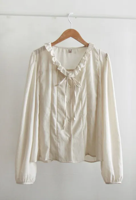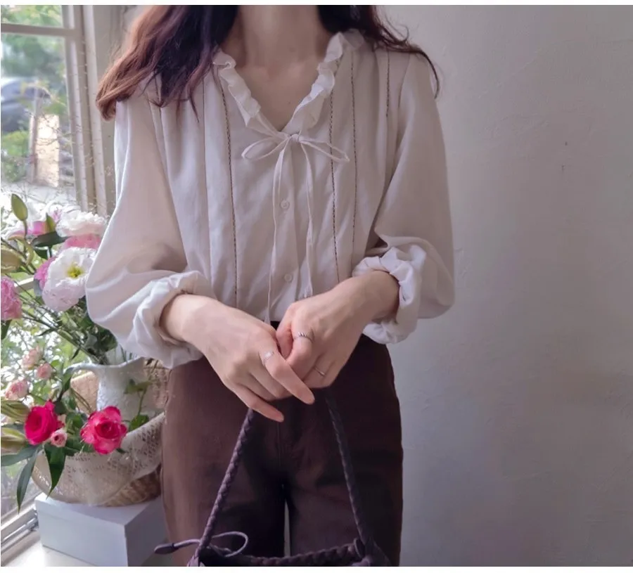 【摺邊領口營造出可愛的氛圍】【優雅設計和蕾絲的上衣】【繫上領口的綁蝴蝶結穿著很漂亮】【為服裝增添活力的精緻上衣】【明亮且易於搭配的可愛秋季上衣】