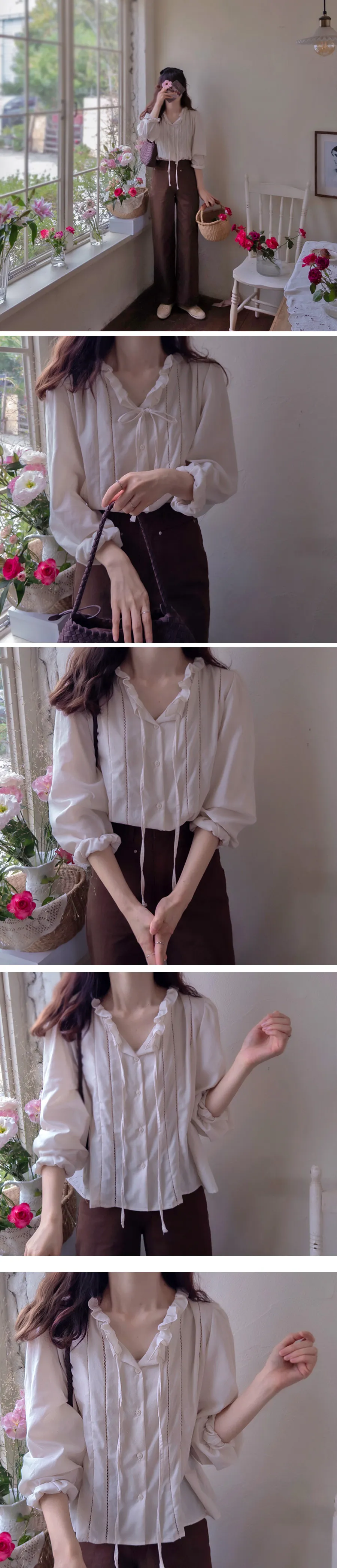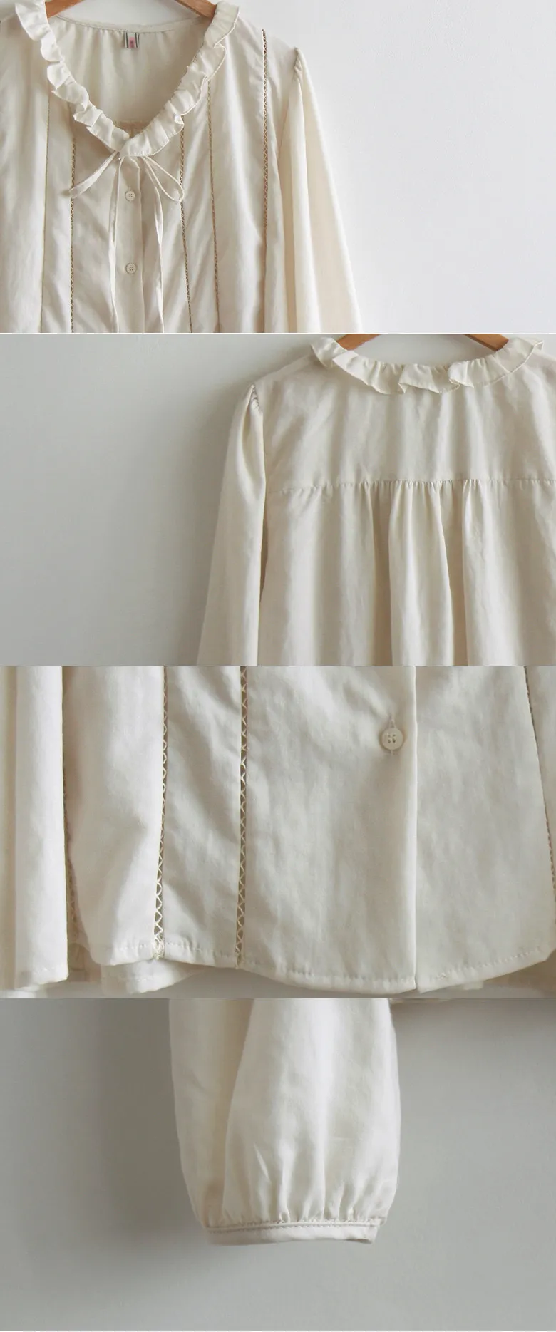 優雅摺邊領綁帶細緻蕾絲線條排扣上衣