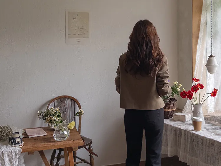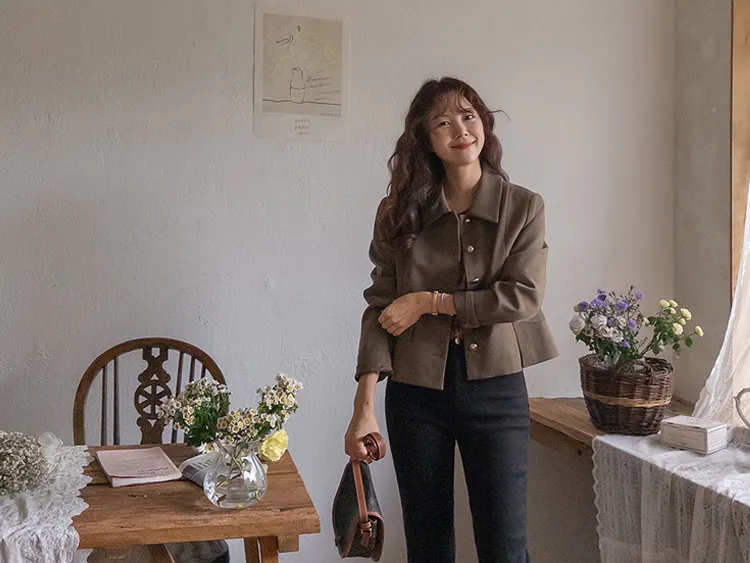 秋日氣息肩線針摺舒適格紋排扣上衣