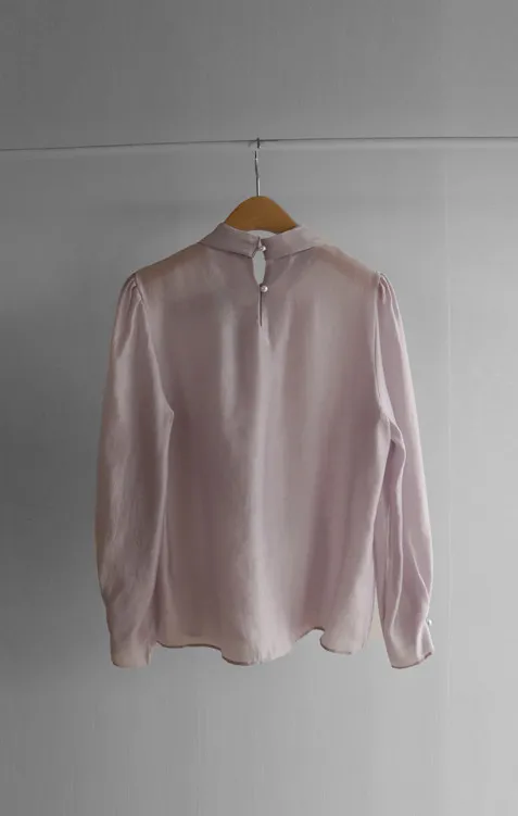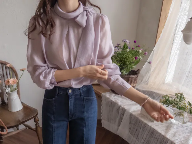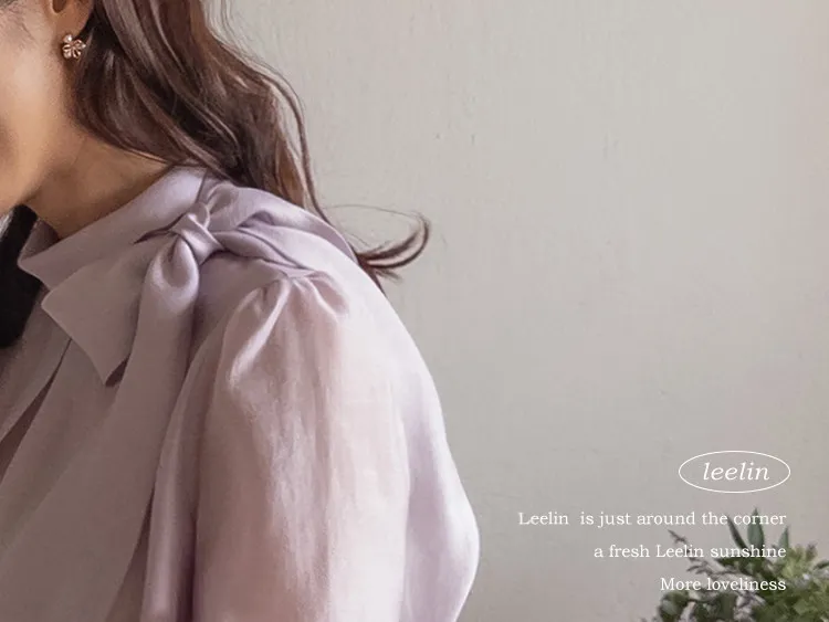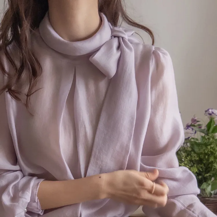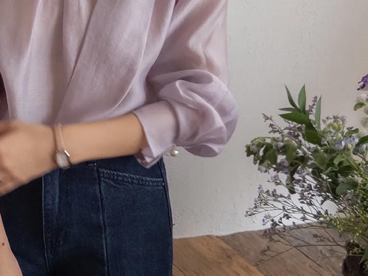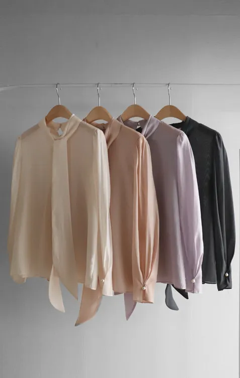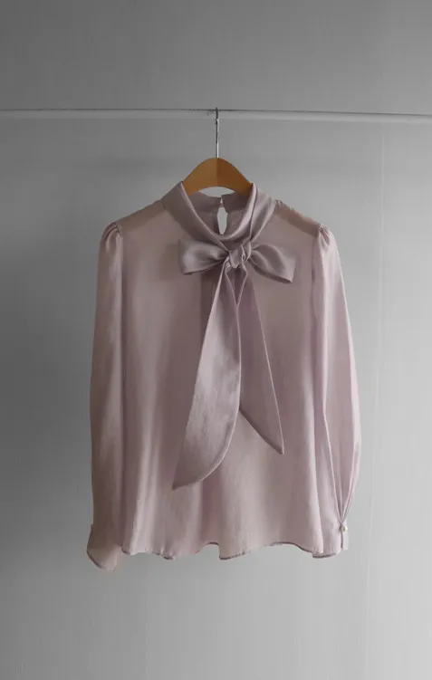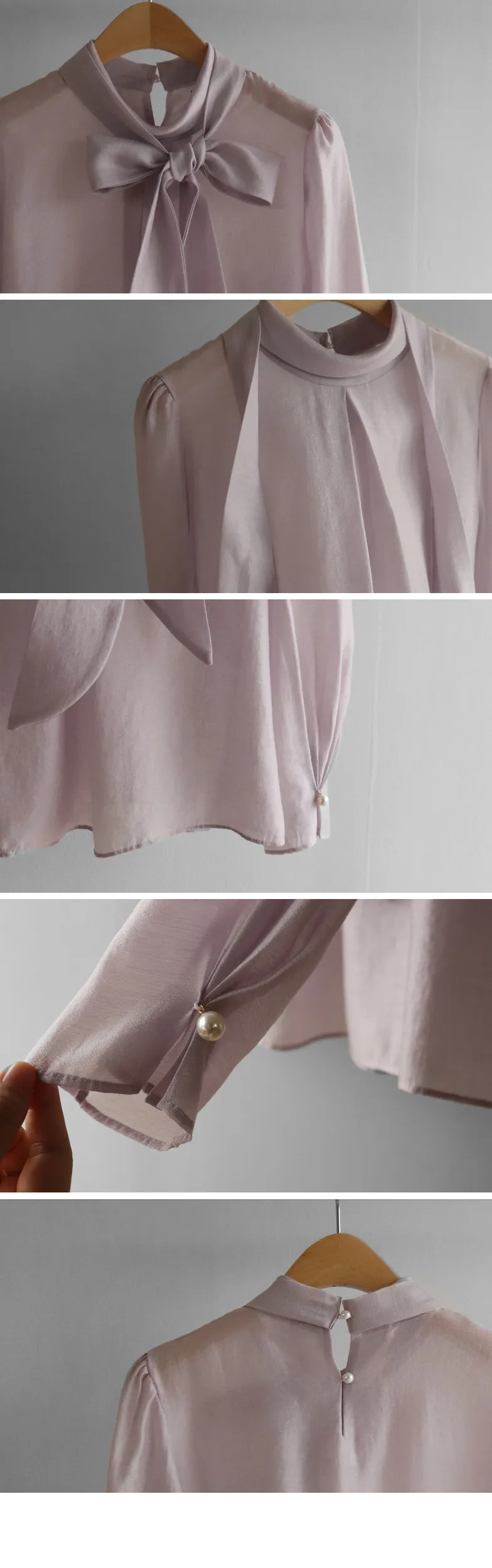 柔美領綁帶點綴奢華袖釦珍珠絲滑上衣