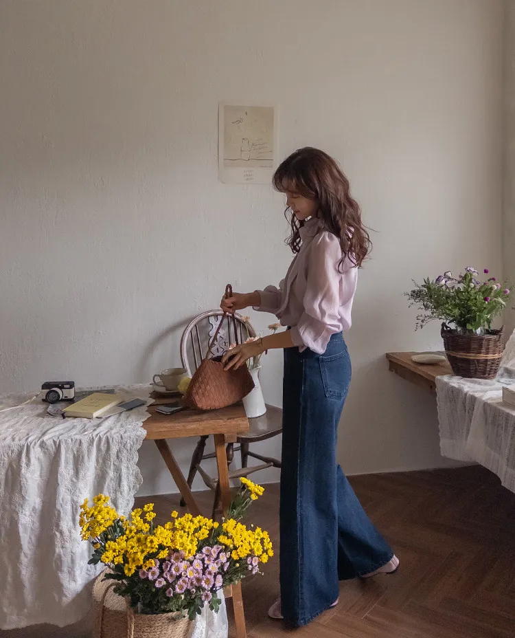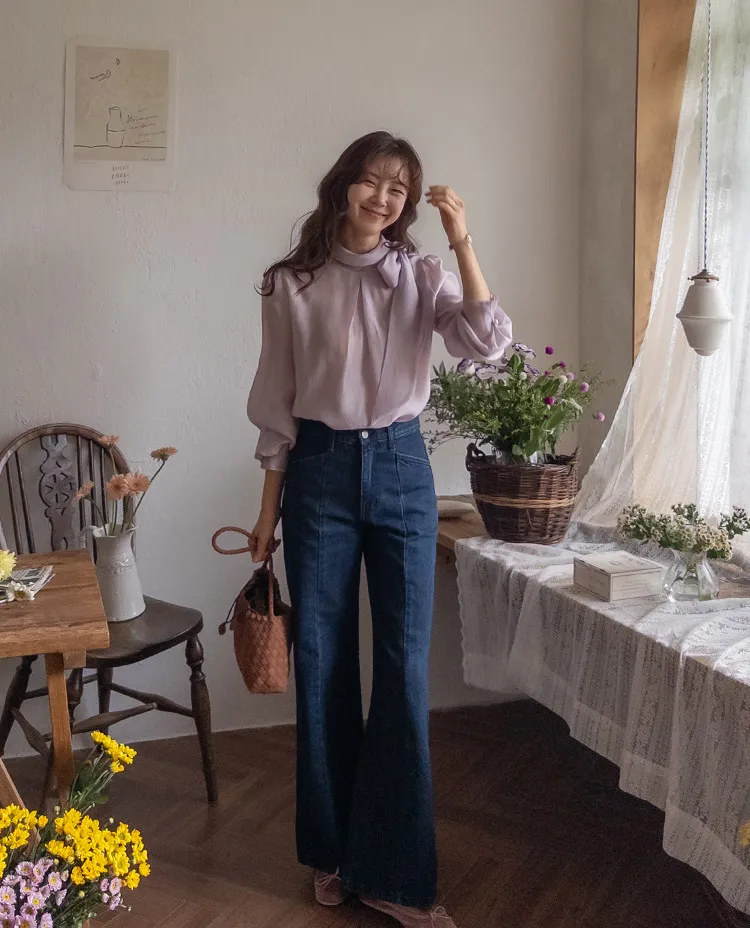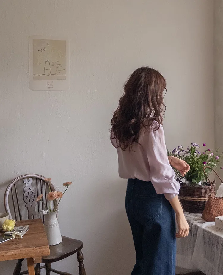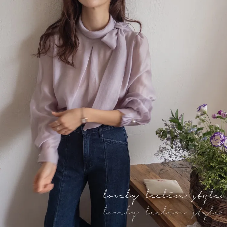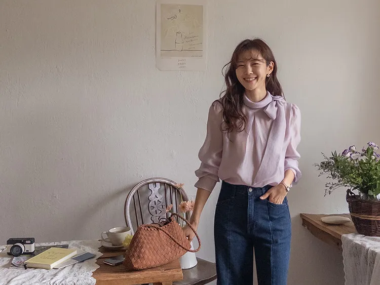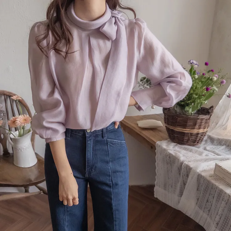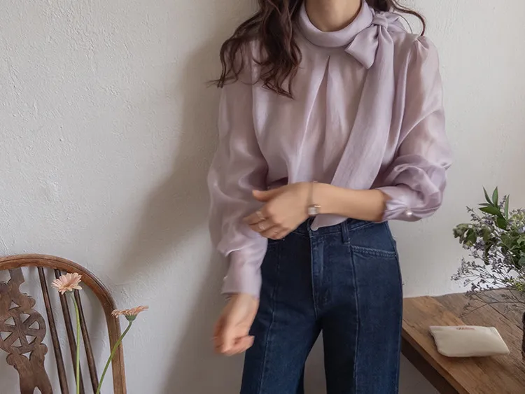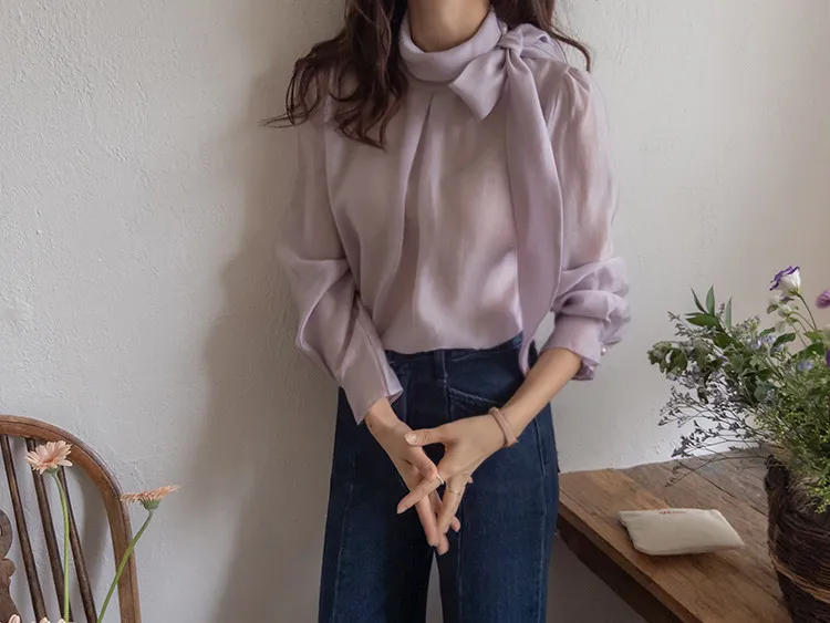 柔美領綁帶點綴奢華袖釦珍珠絲滑上衣
