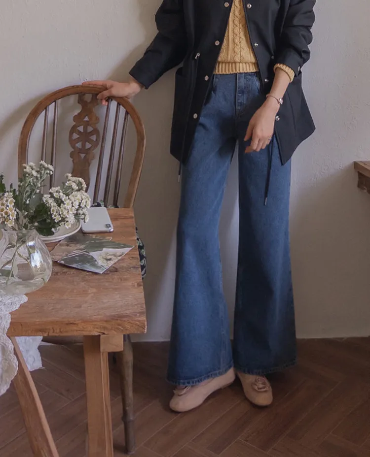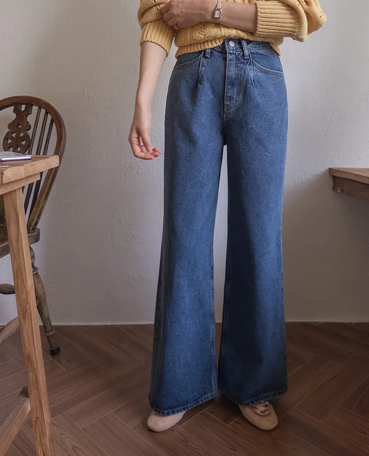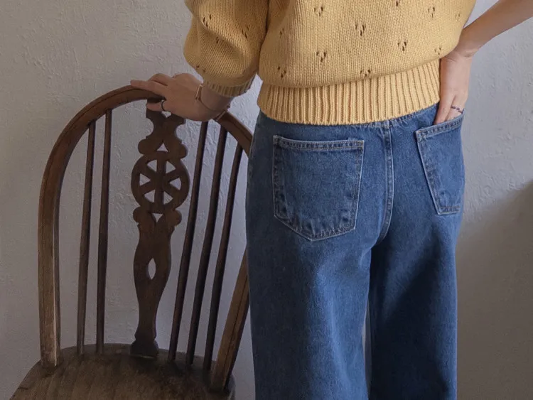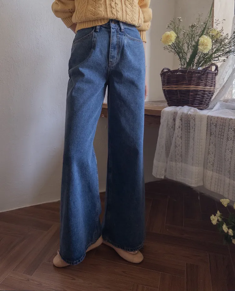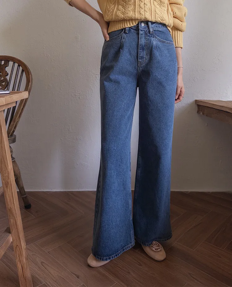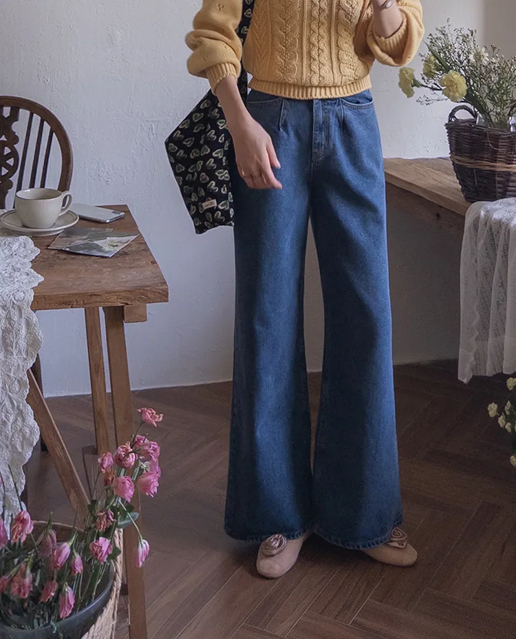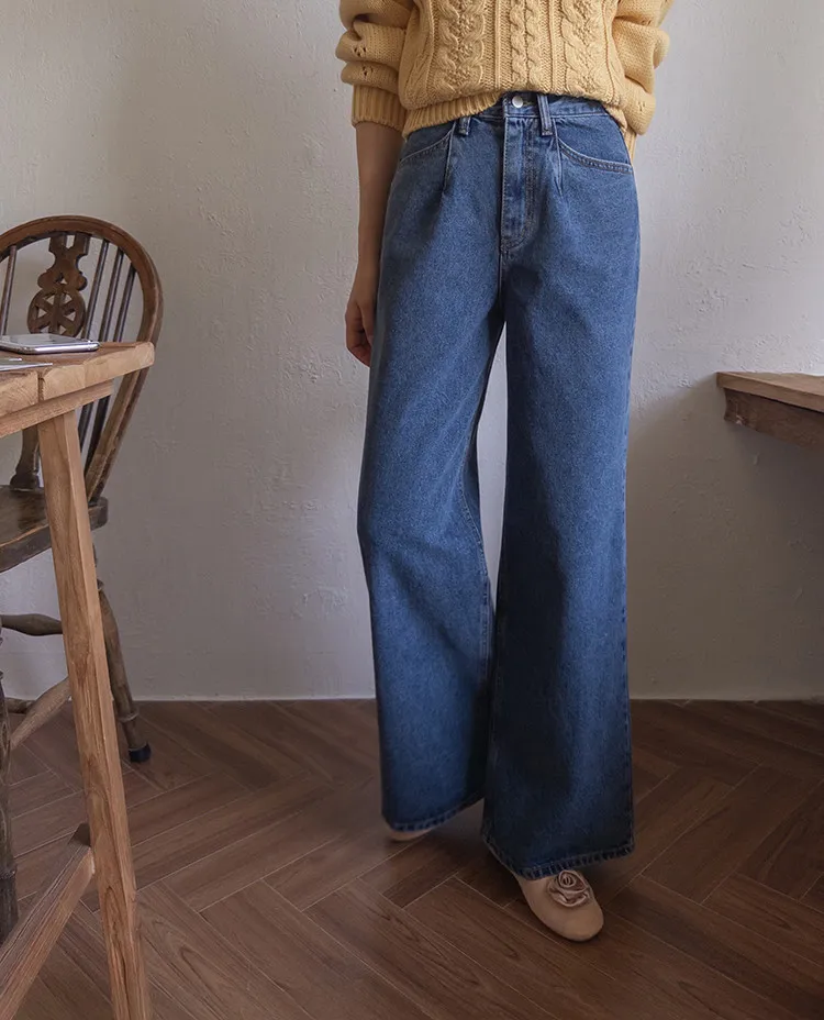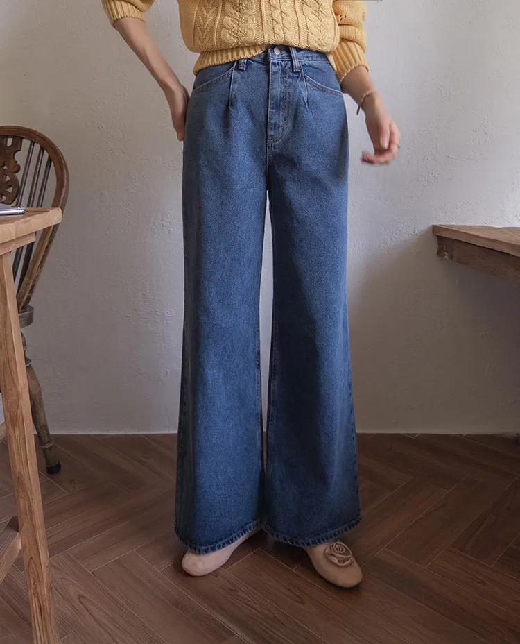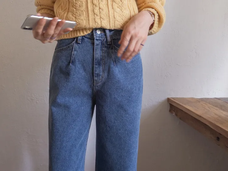 【腰部有時尚褶邊的牛仔褲】 【完美包裹下半身!寬鬆版型】 【時尚合身】 【100%純棉布料】